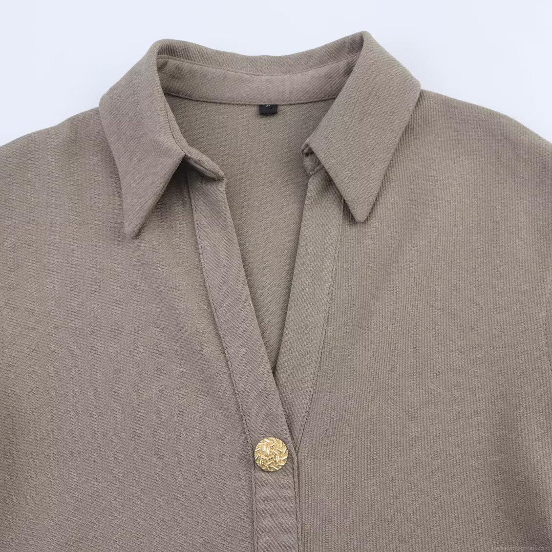 Solid Color, Pleats, Waist shaping, Buttons, V-neck