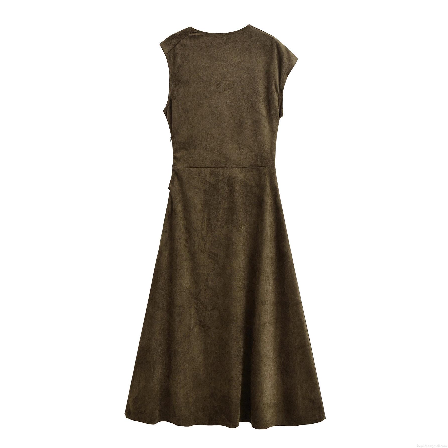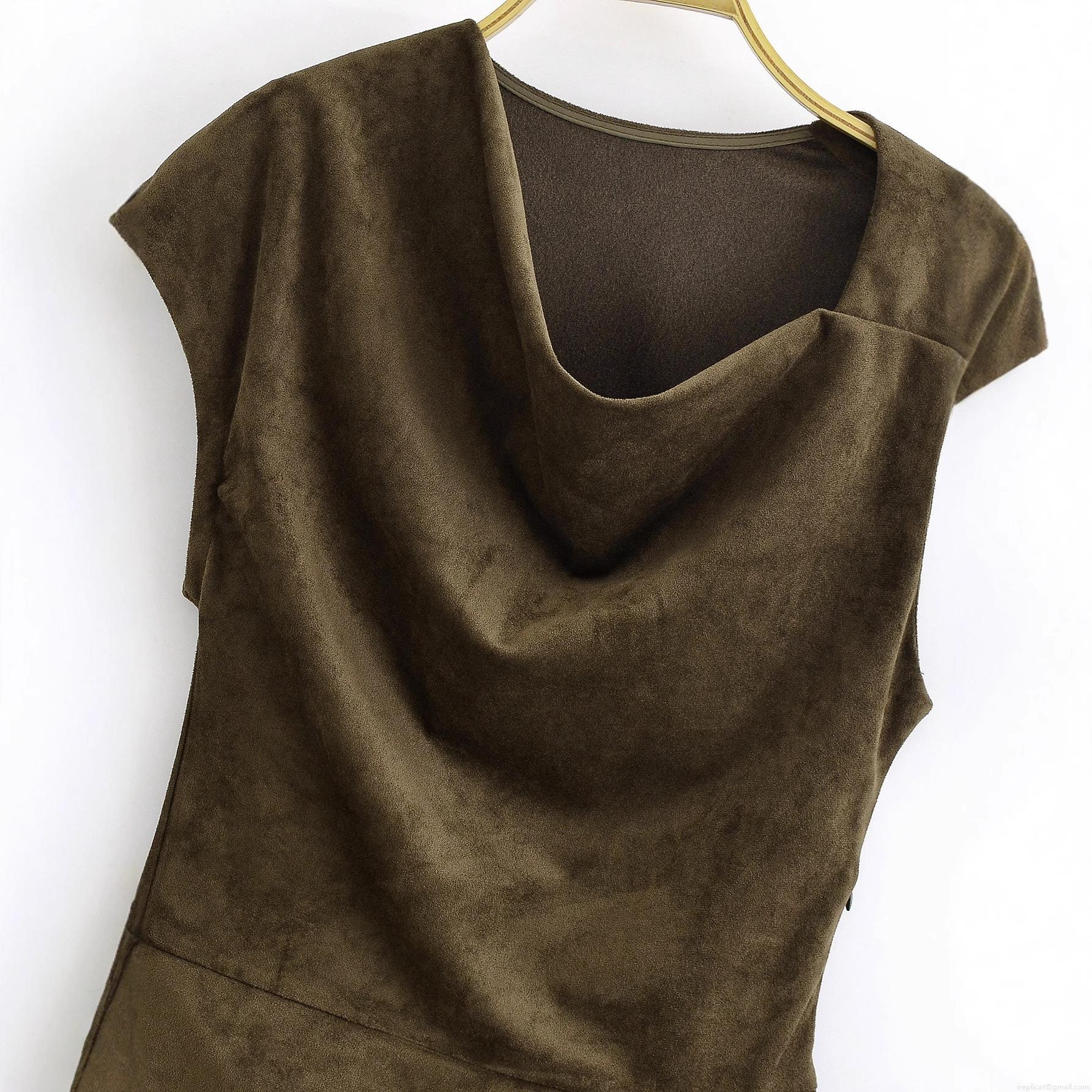 • Women Sleeveless Suede Effect Midi Dress Cowl Neck Asymmetrical Hem Metal Ring Belted Waist Elegant Party Evening Dress Ladies Solid Color A-Line Sundress