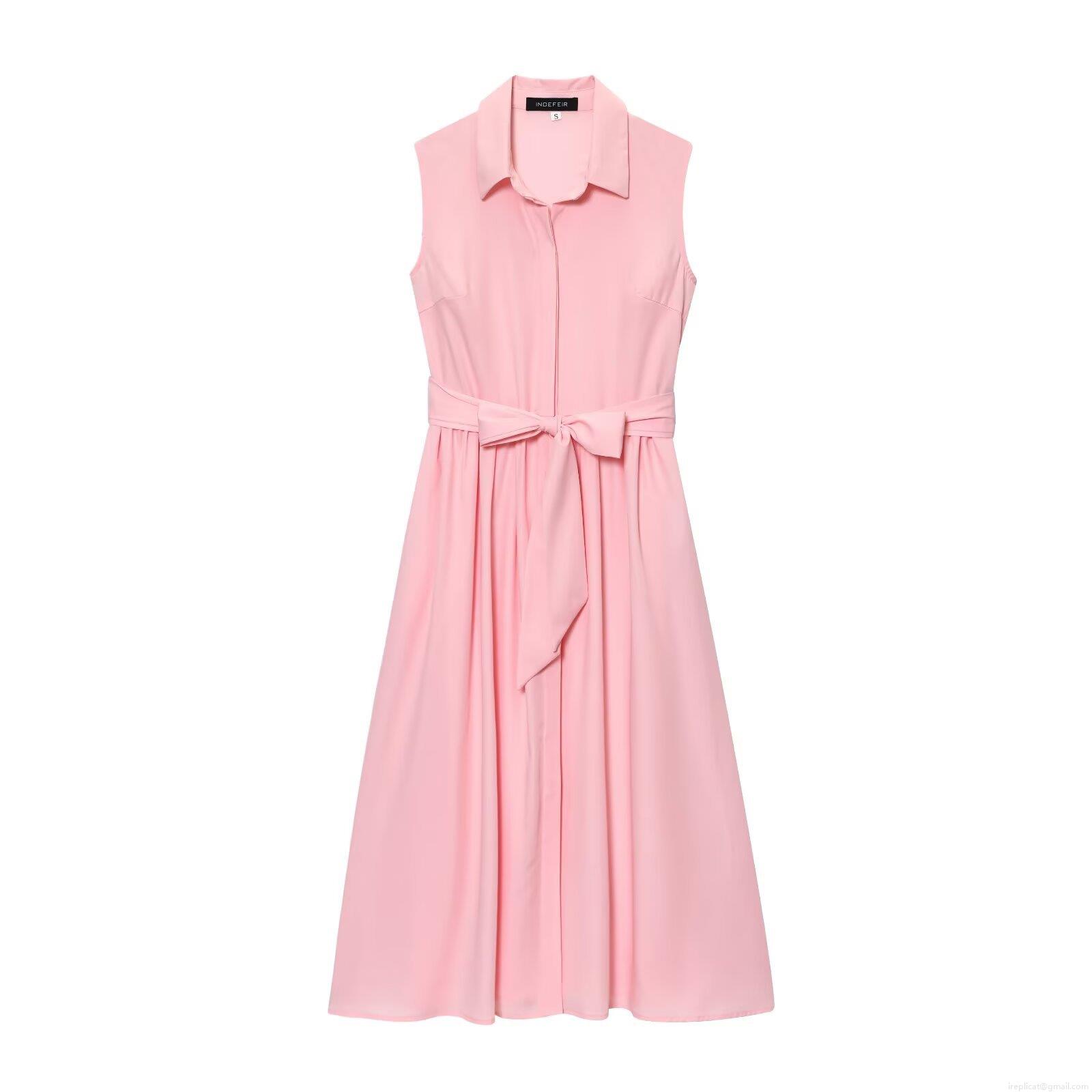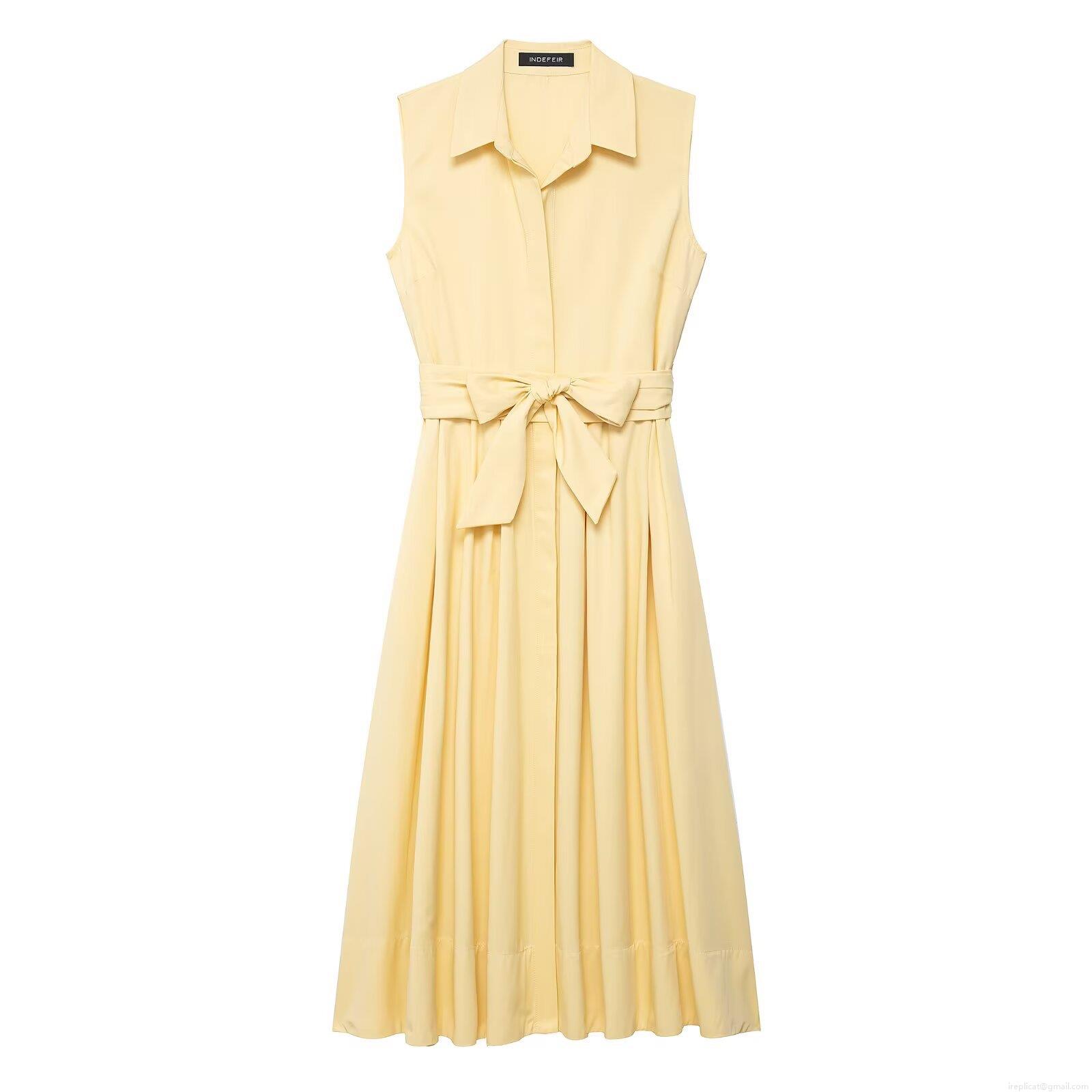 Women Solid Color Sleeveless Shirt Dress With Bow Waist Tie Elegant Lapel Midi A-Line Dress Polyester Casual Party Gown For Lady