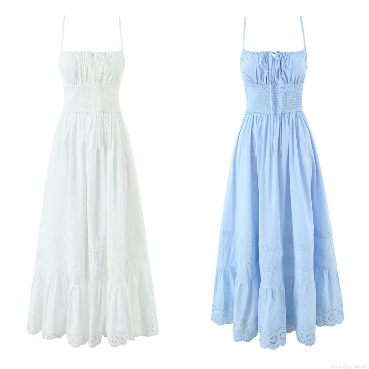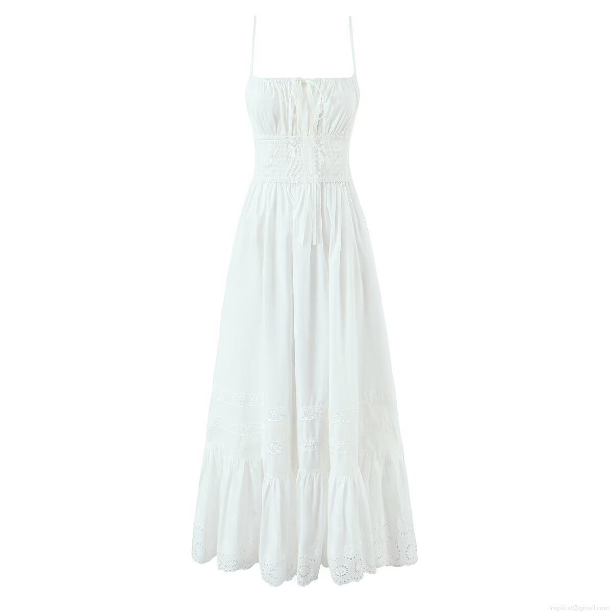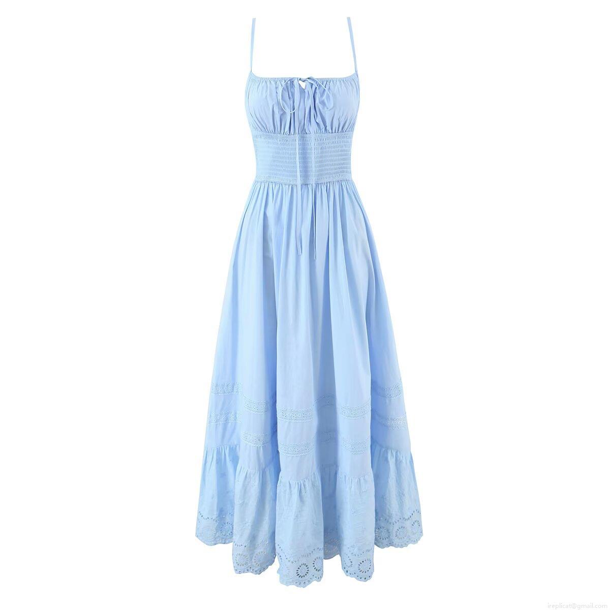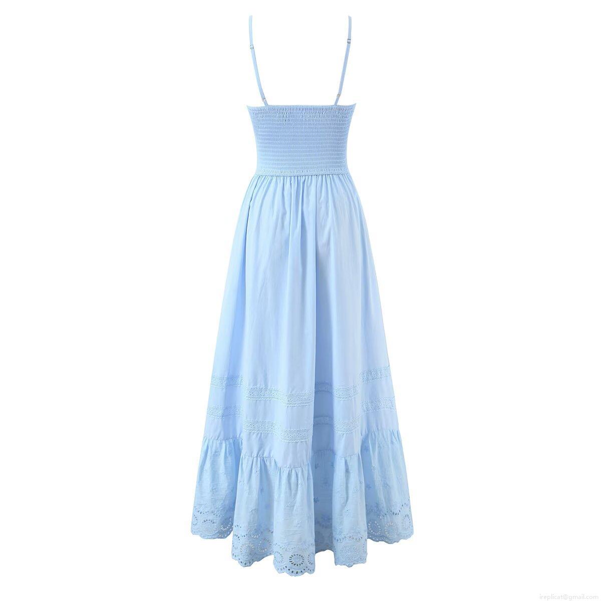 • Women Spaghetti Strap Maxi Dress 100% Cotton Eyelet Embroidery Lace Patchwork Smocking Waist Tiered Ruffle Hem Boho Summer Vacation Dress