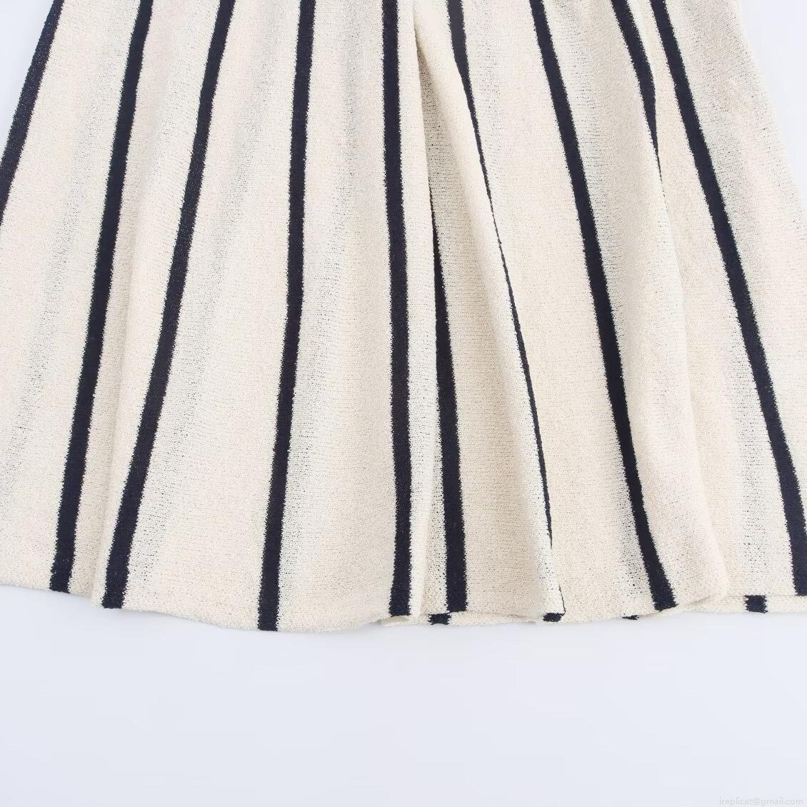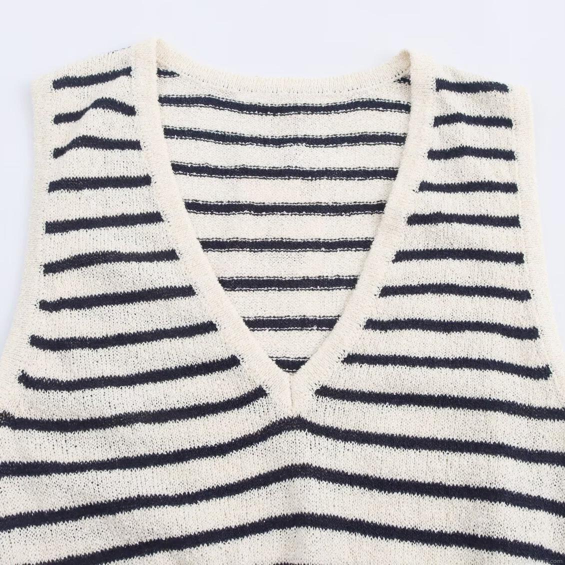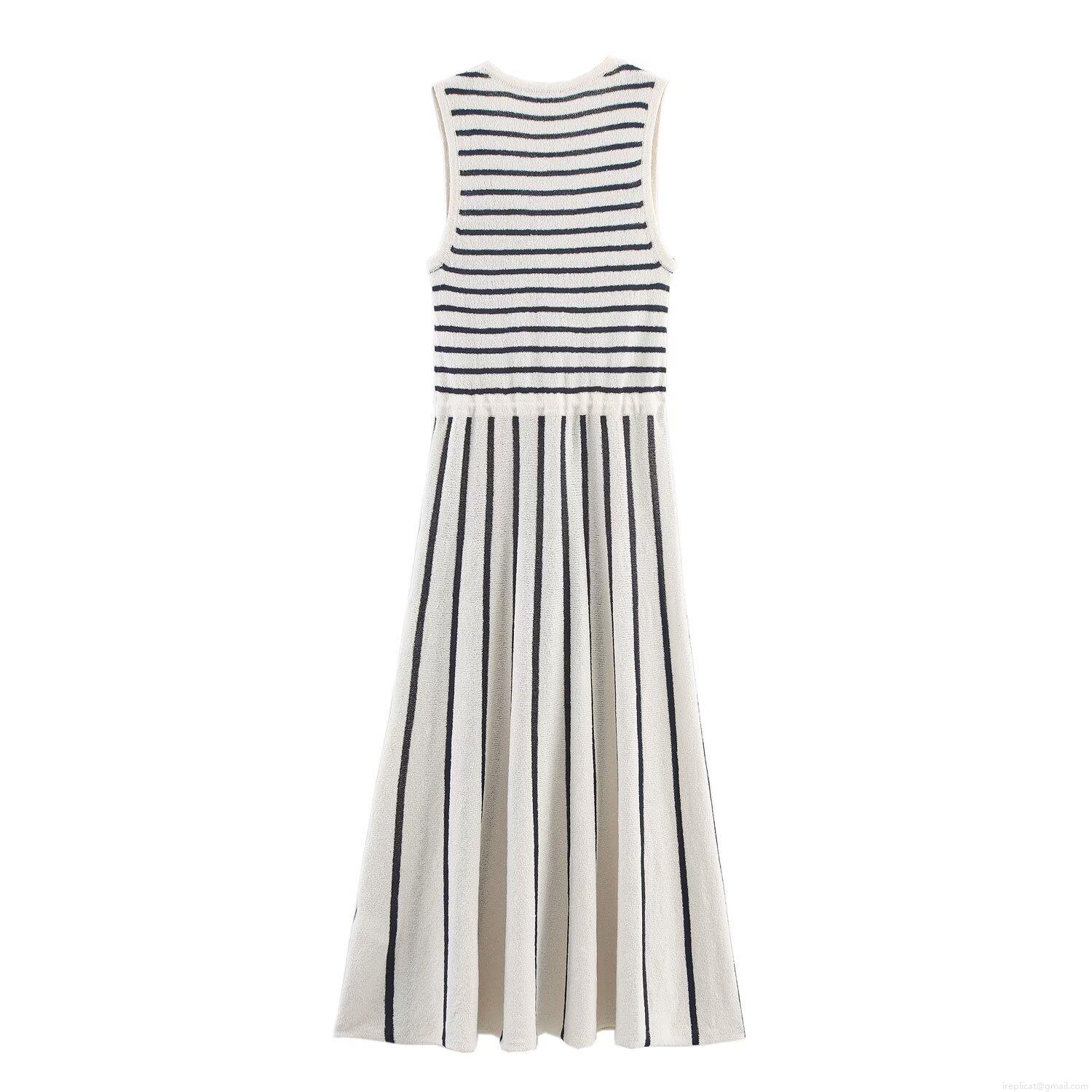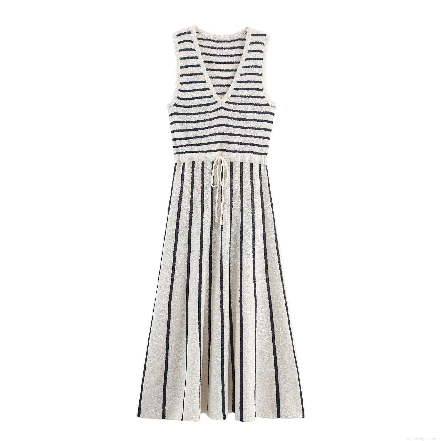 • Women Striped Knit Midi Dress Sleeveless V-Neck Splicing Drawstring Waist Polyester Spandex Casual Summer Sundress Elegant Slim Fit Sleeveless Stripe Knitted Gown