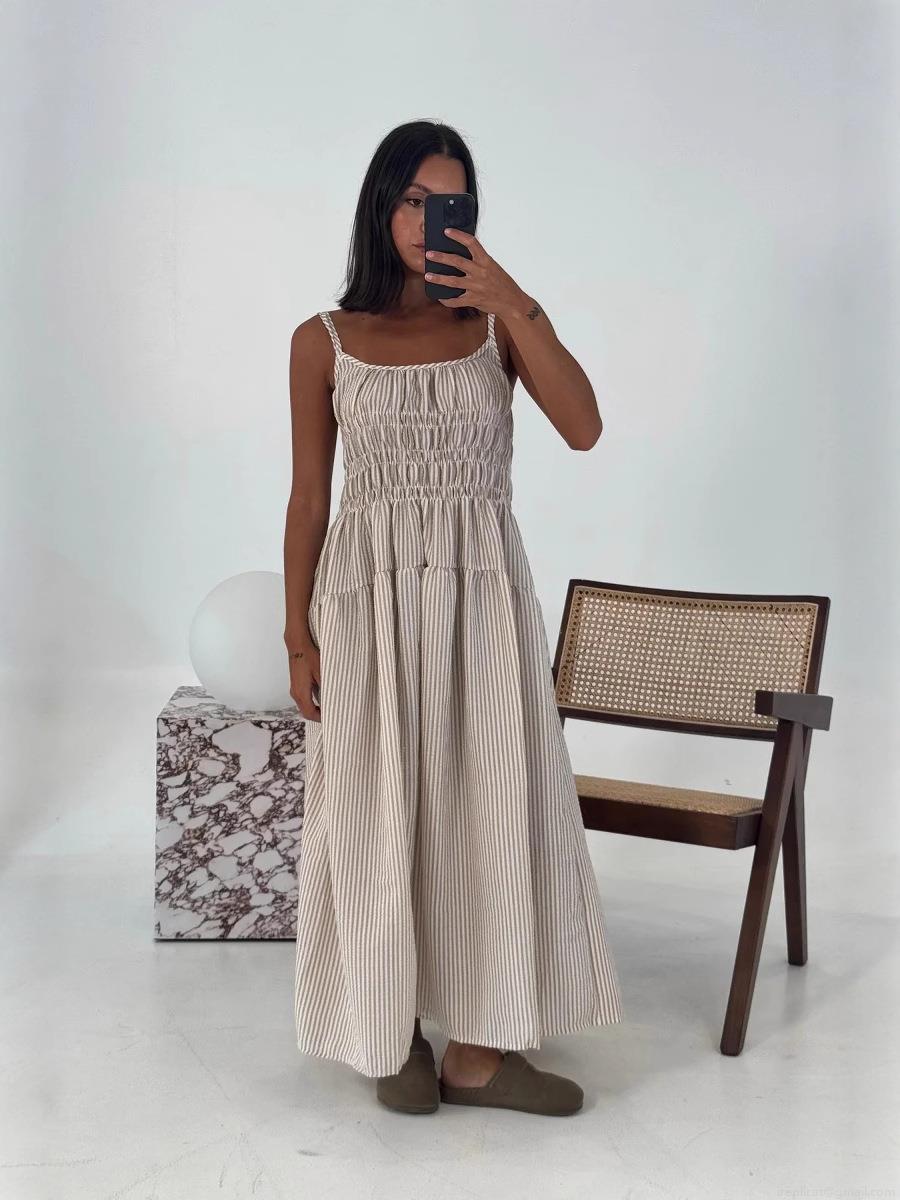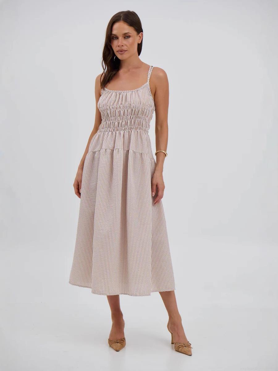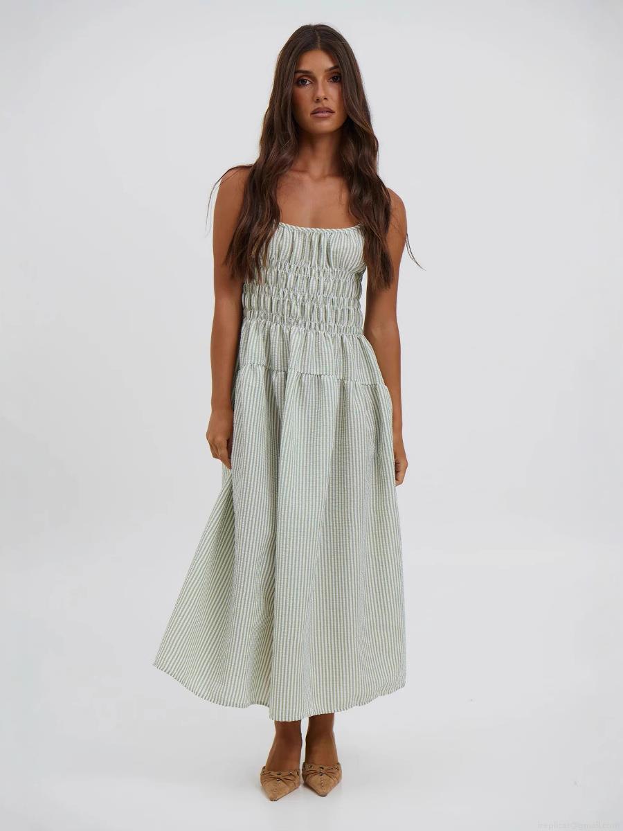 • Women Striped Smocked Strappy Midi Dress Polyester Spandex Summer Sexy A-Line Tiered Skirt Casual Beach Holiday Party Dress