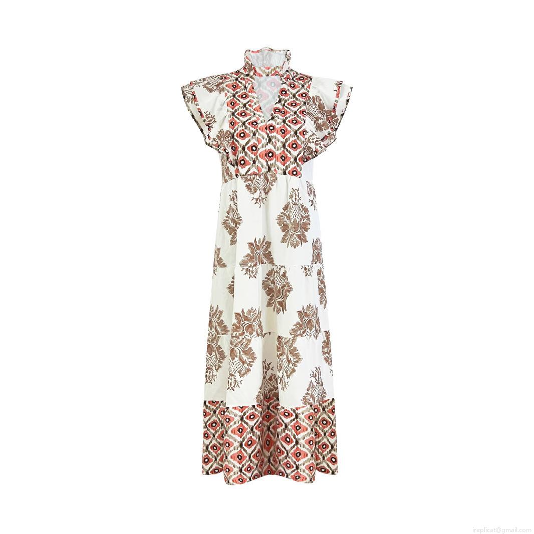 • Women Summer Bohemian Floral Print Midi Dress V Neck Ruffle Sleeve Tiered A-Line Sundress Vacation Beachwear Casual Polyester Spandex Dress