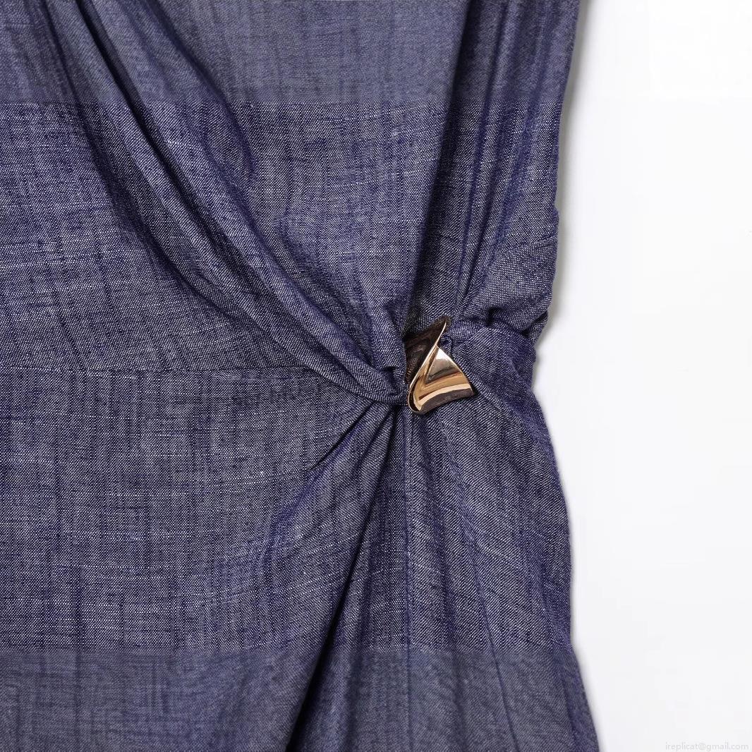 Women Summer European Style Sleeveless Round Neck Midi Dress With Gold Triangle Buckle Ruched Side Slit Textured Polyester Fabric Streetwear Party Dress