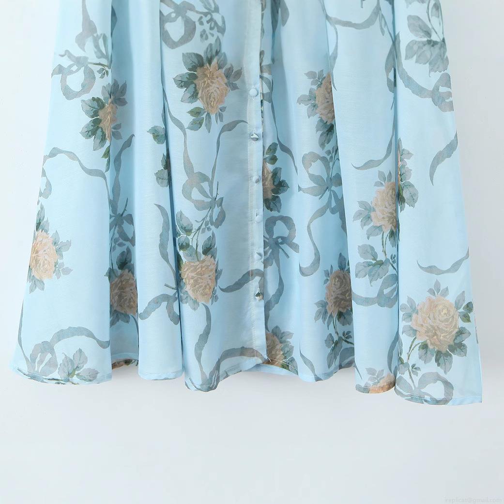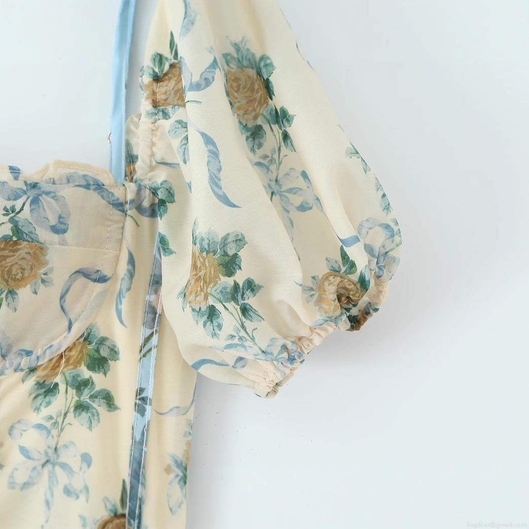 Splice, Bow, Floral Pattern, Rose, Printing, Zipper, Buckle, Puff Sleeves, Square Collar, Waist Tie