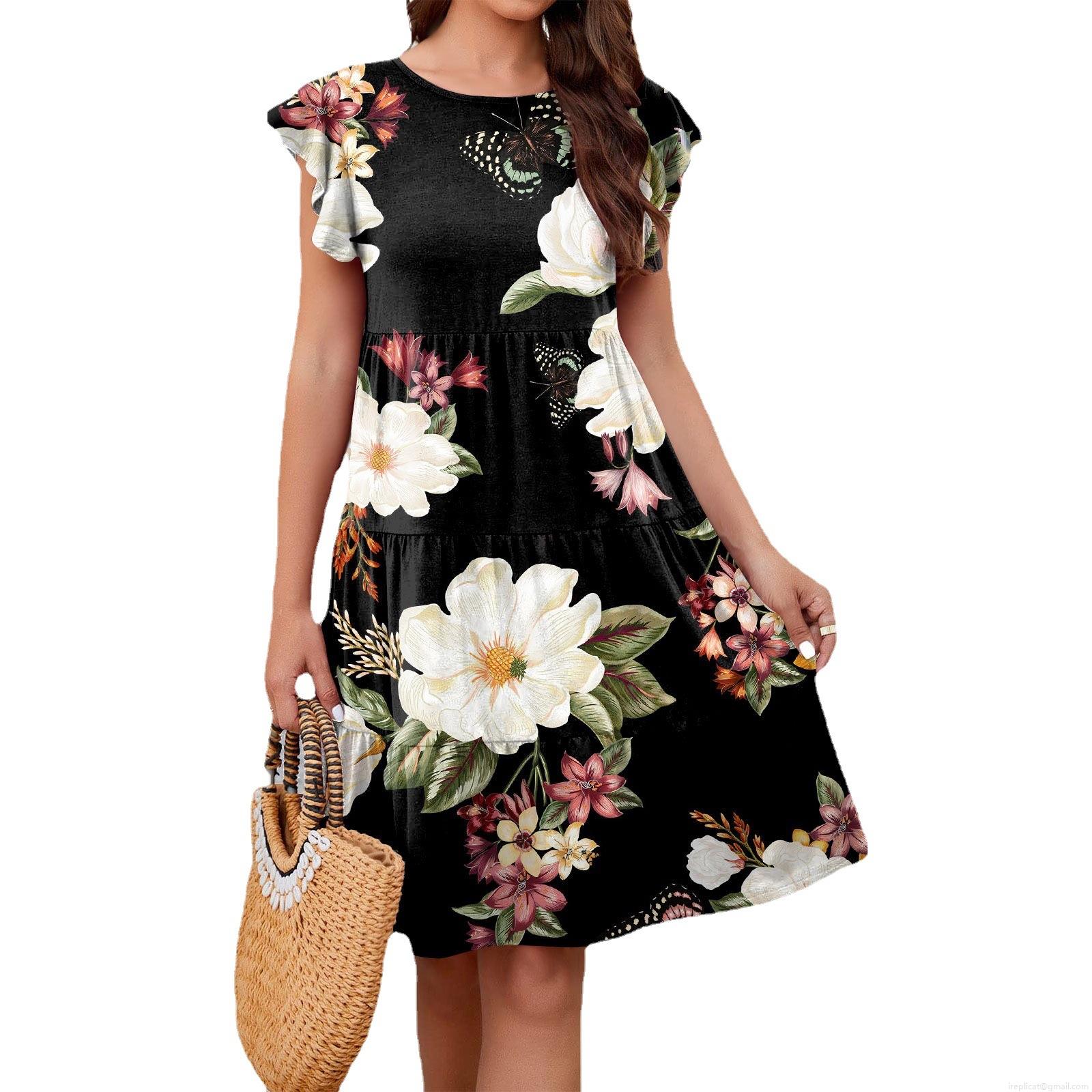 • Women Summer Floral Printed Tiered Midi Dress Ruffle Flutter Sleeve Round Neck Casual Vacation Cake Skirt Polyester Spandex Butterfly Print Dress