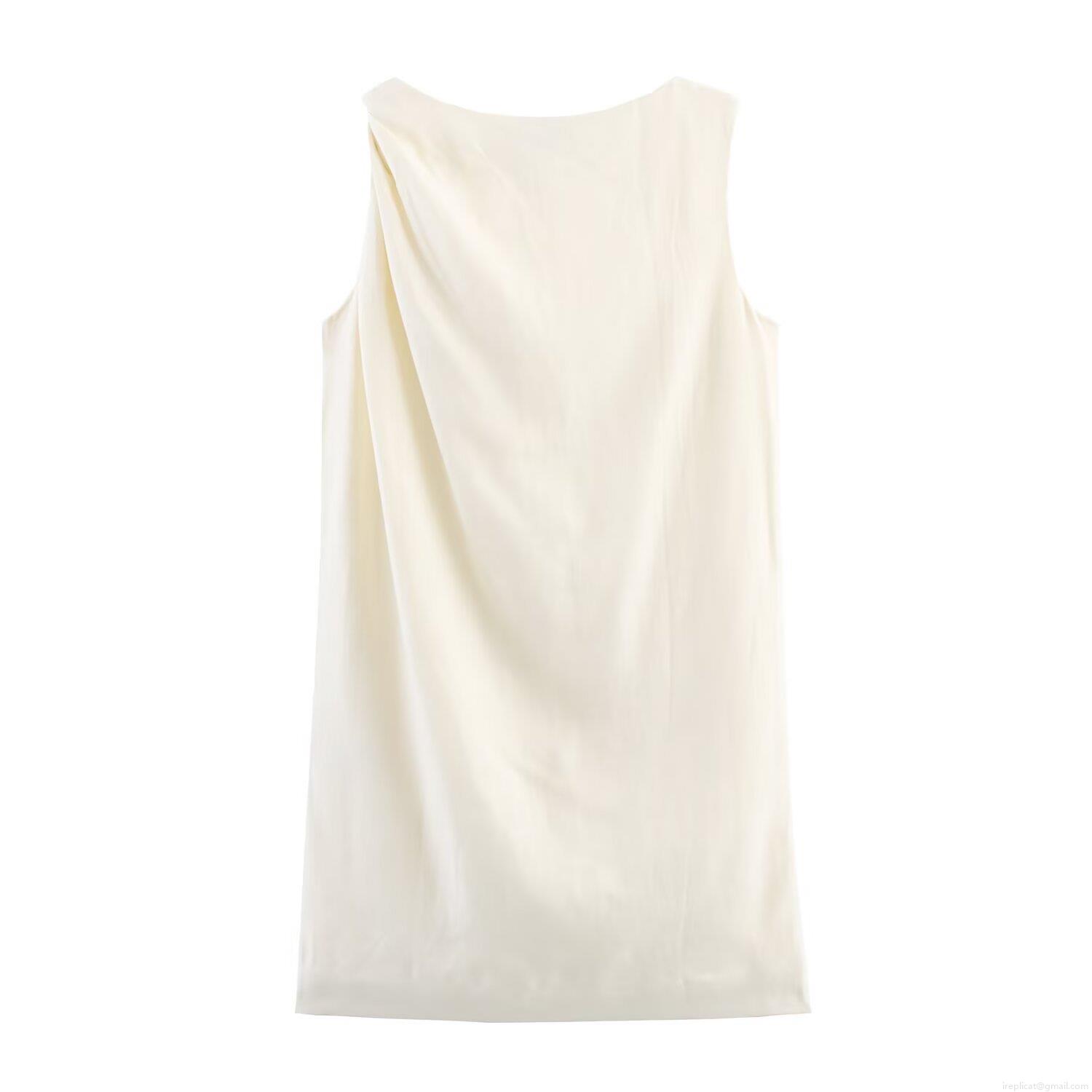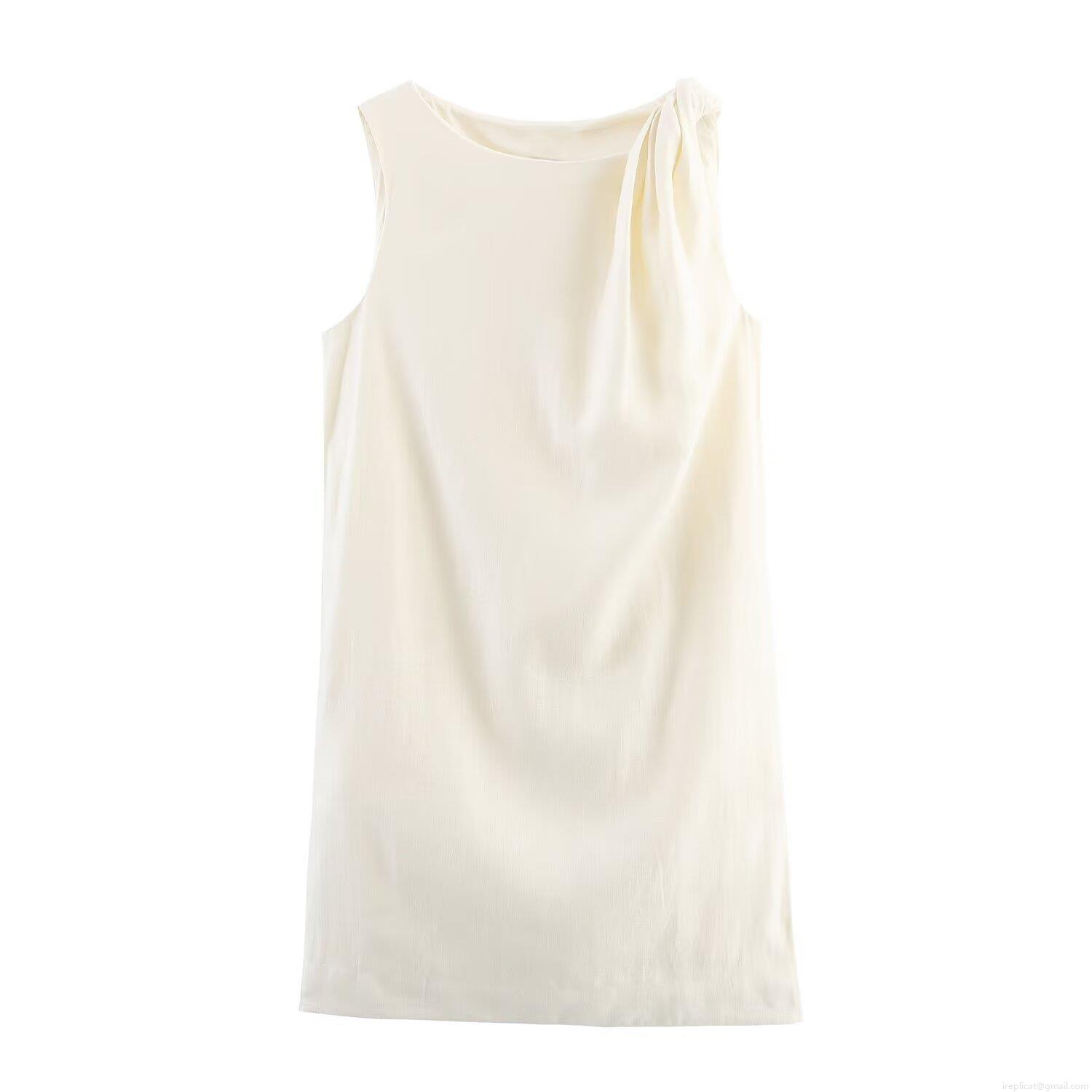 • Women Summer Sleeveless Knotted Solid Color Natural Linen Dress Elegant Round Neck Midi Dress Minimalist Streetwear Casual Vacation Vestido