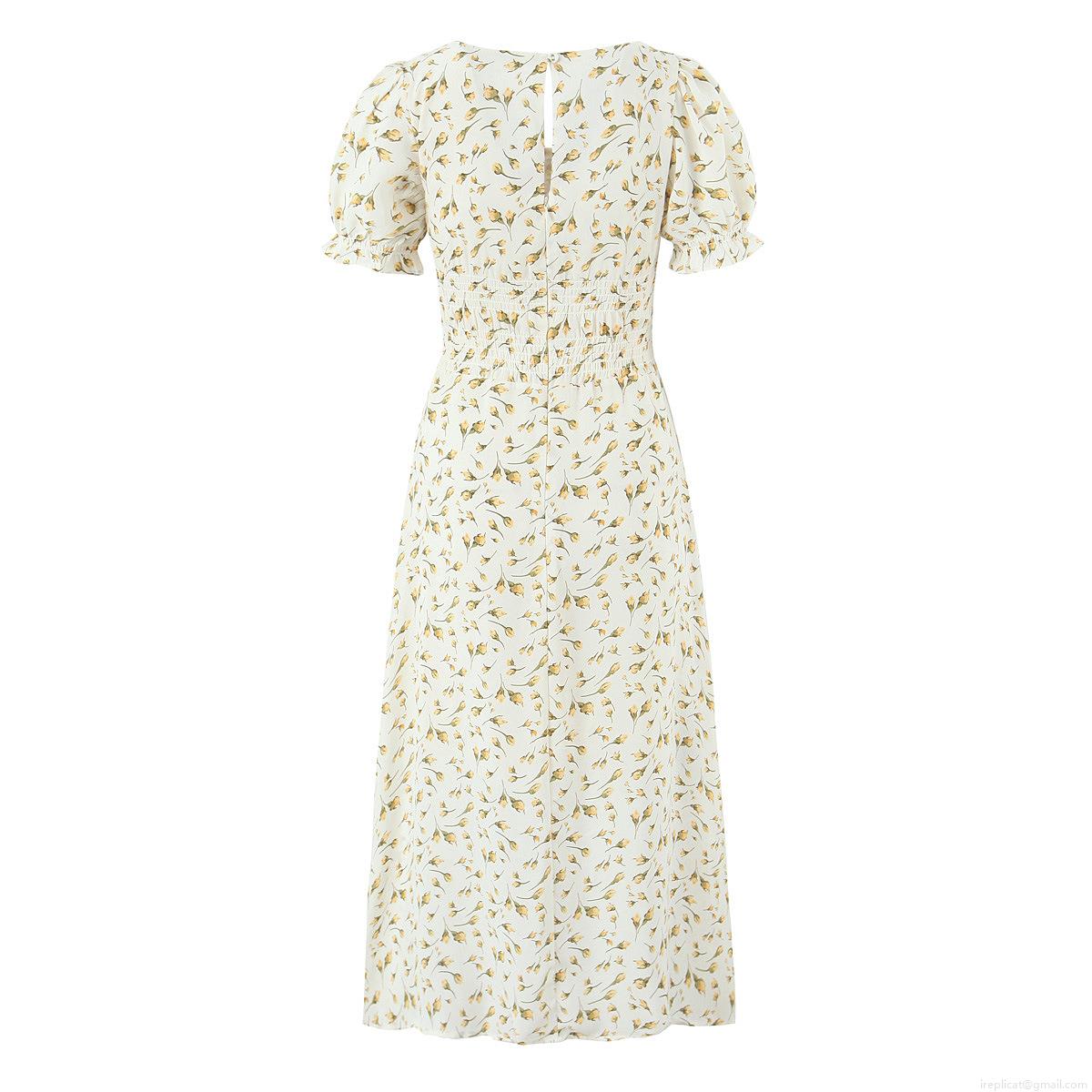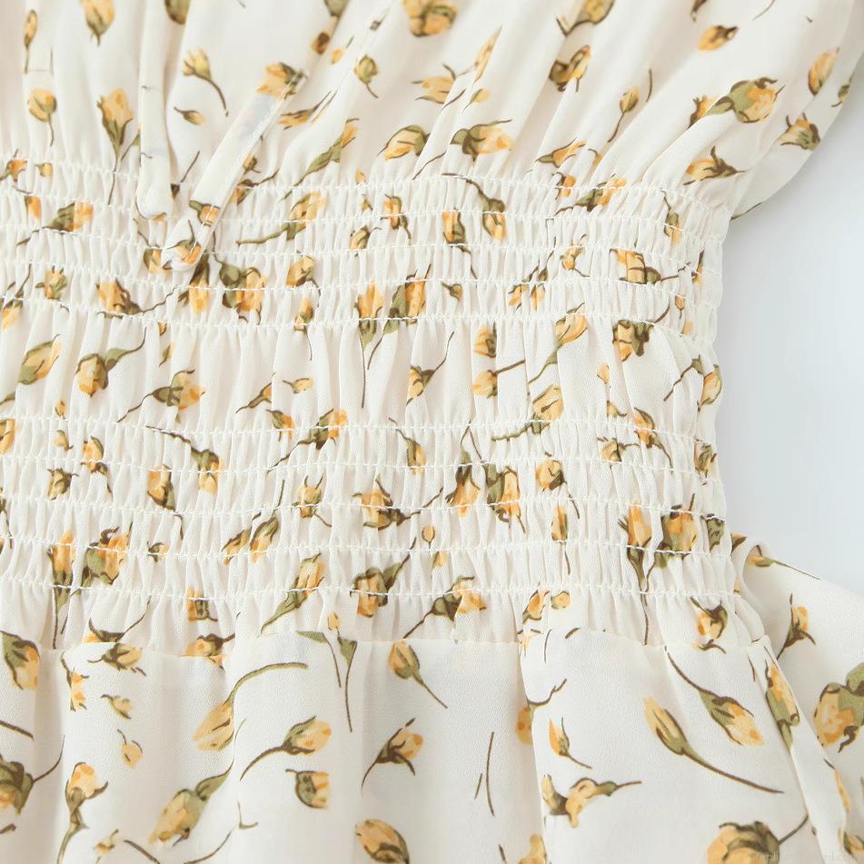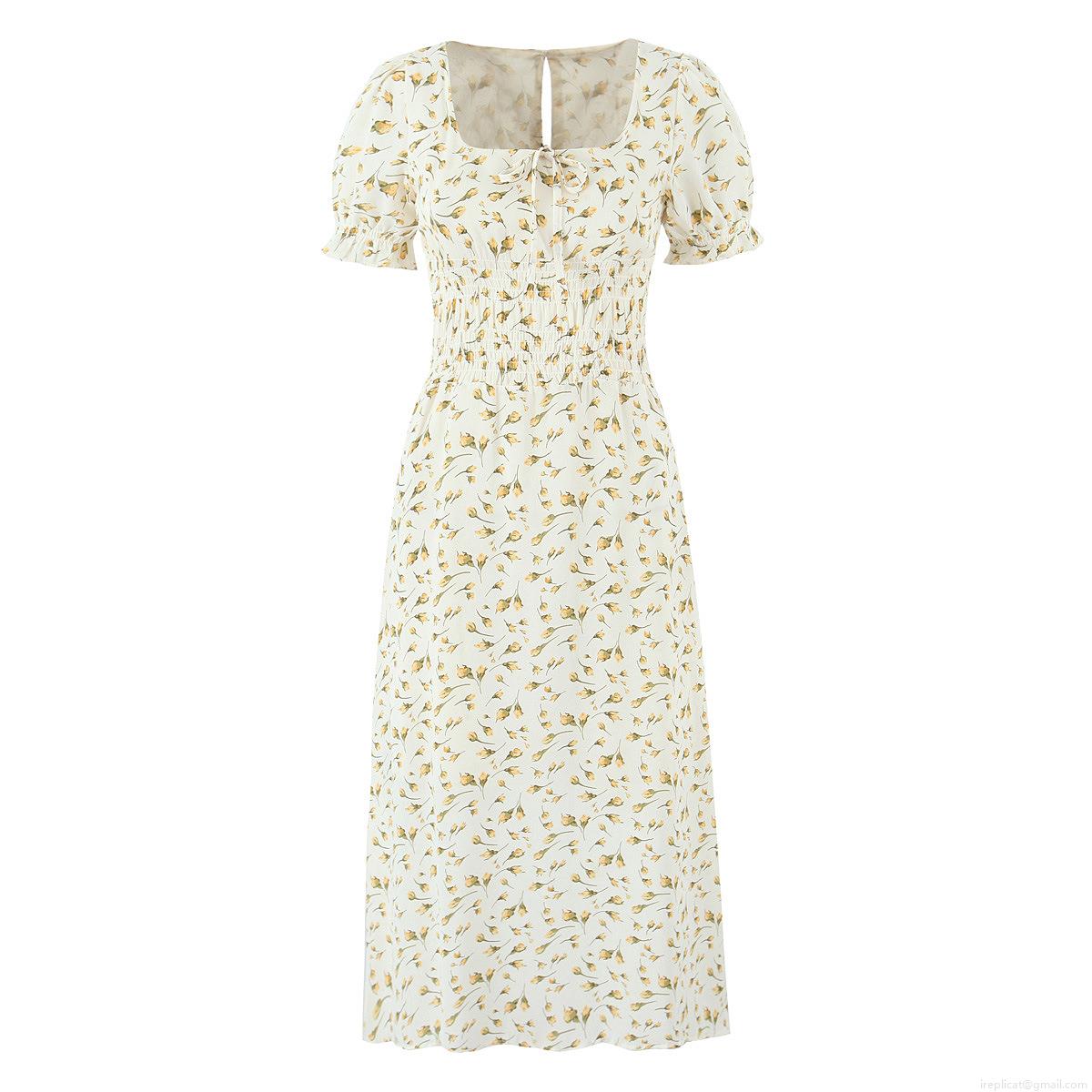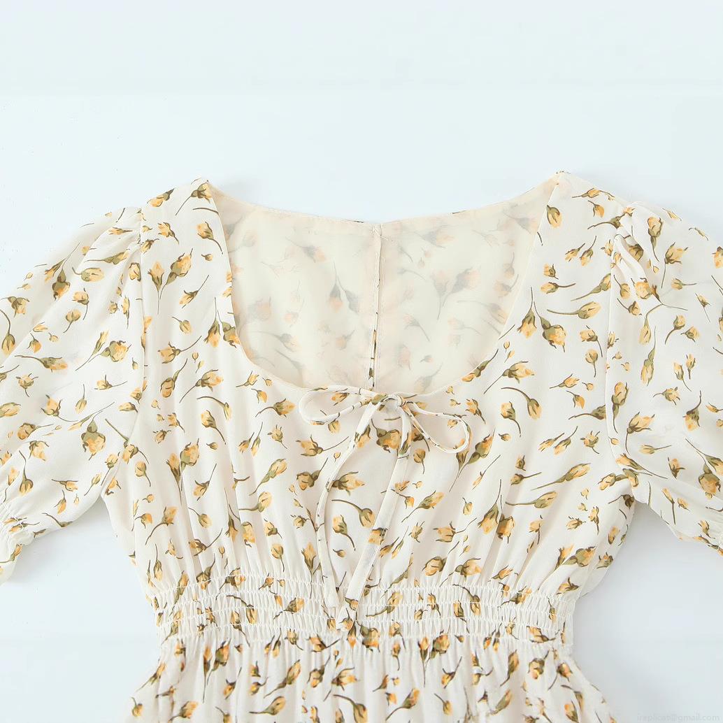 • Women Summer Square Neck Puff Sleeve Floral Midi Dress French Vintage Style Smocked Elastic Waist Pale Yellow A-Line Casual Sun Dress