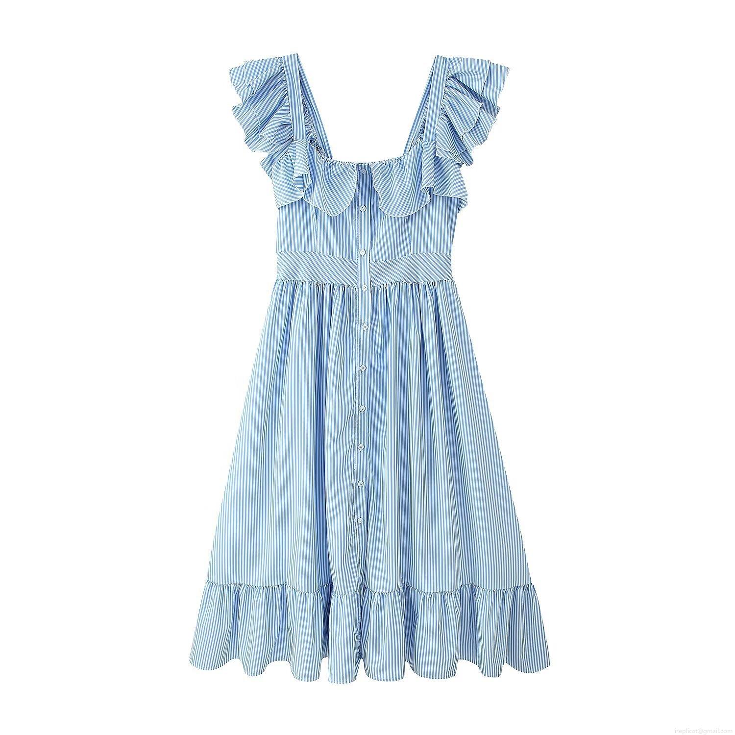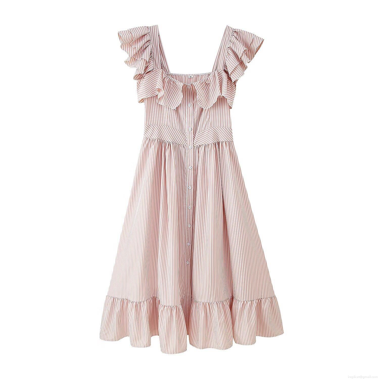 • Women Summer Striped Sleeveless Midi Dress V Neck Ruffle Shoulder Button Front Slim Waist A Line Beach Sundress