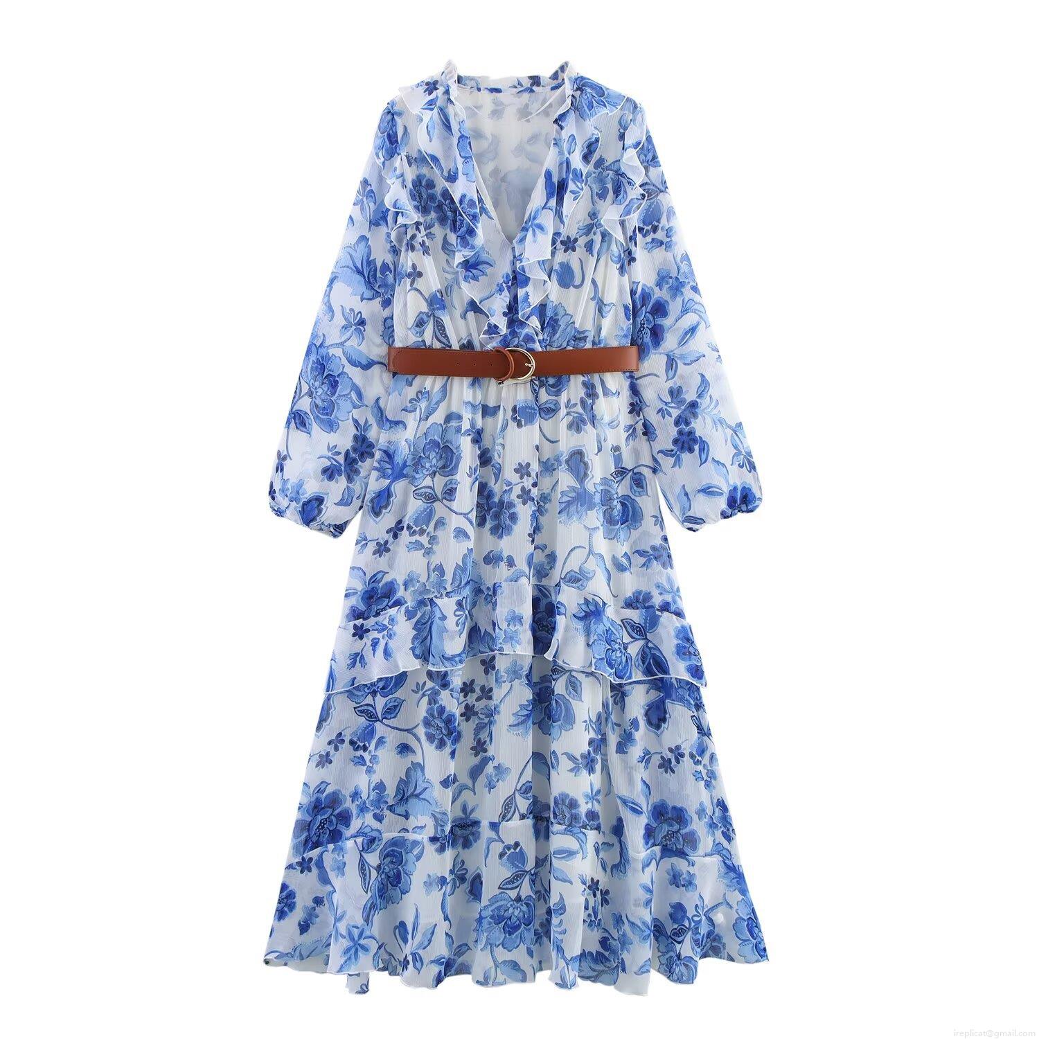 • Women V-Neck Floral Print Midi Dress With Belt Long Lantern Sleeve Chiffon Ruffle Tiered Skirt Bohemian Summer Vacation Party Casual Dress