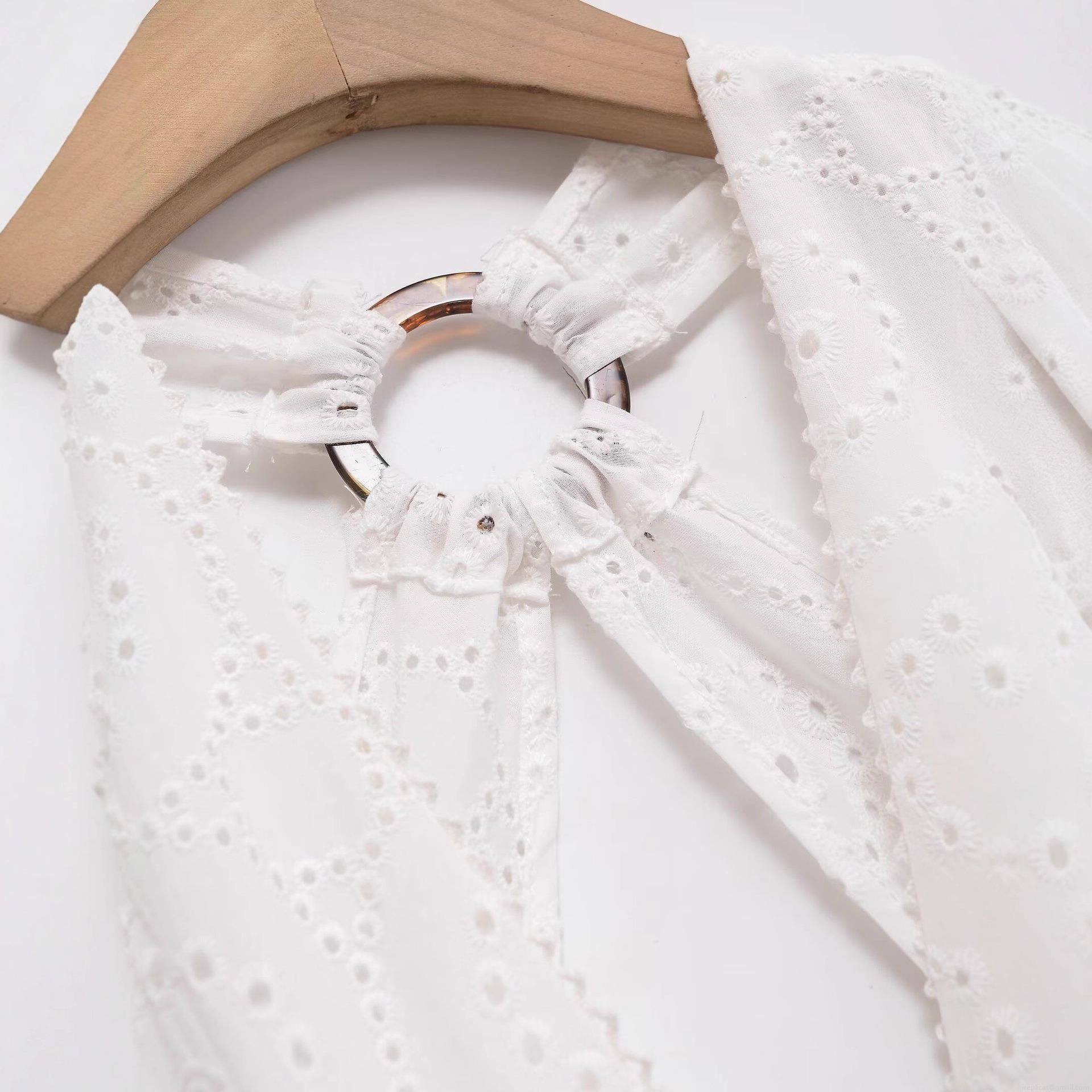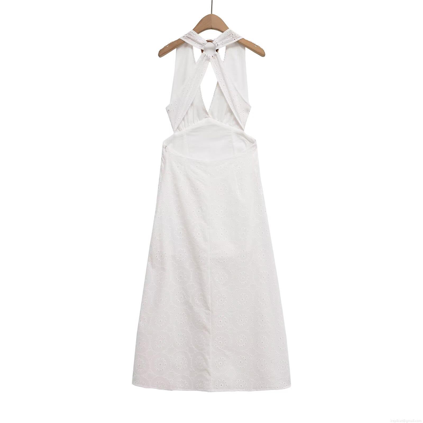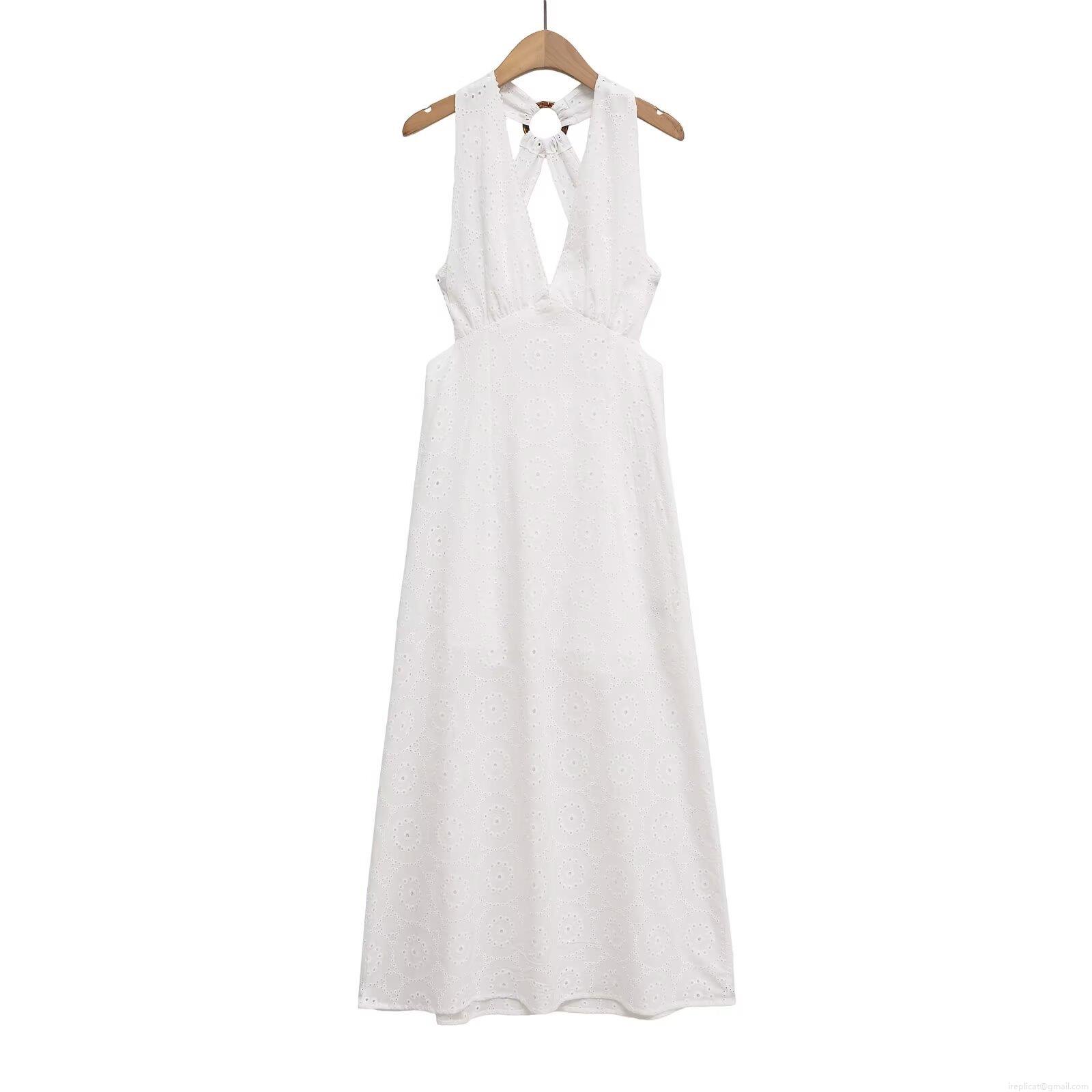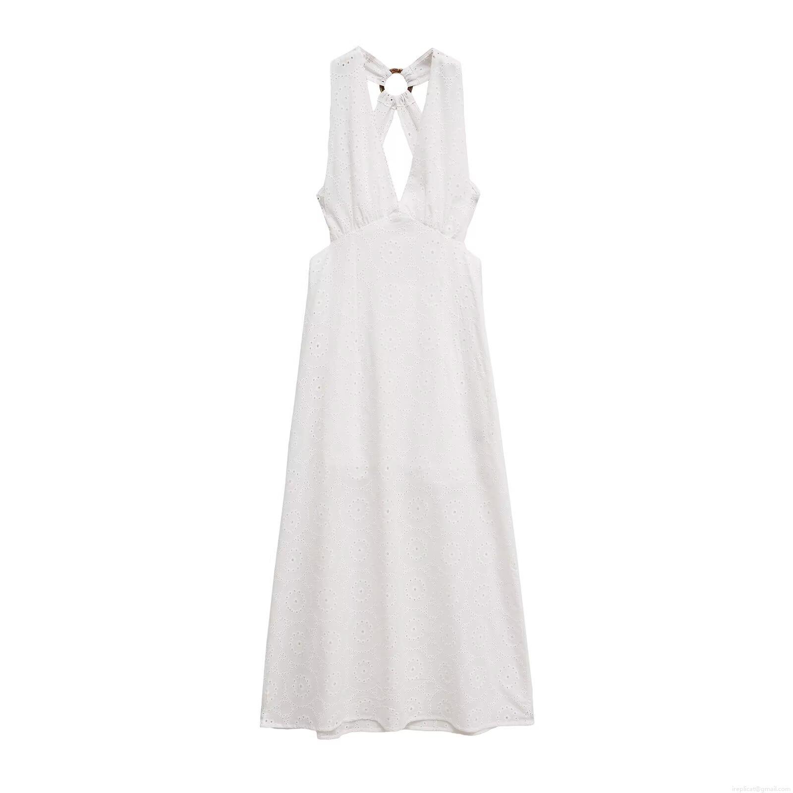 • Women White Polyester Eyelet Embroidery Halter Midi Dress With Resin Ring Backless Hollow Out Sexy V Neck Summer Vacation Beach Party Sleeveless A-Line Dress
