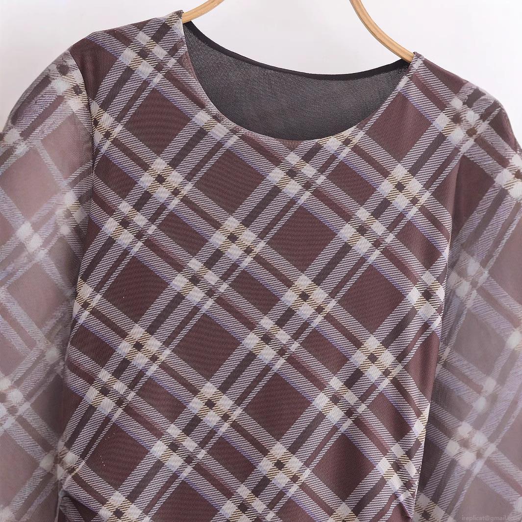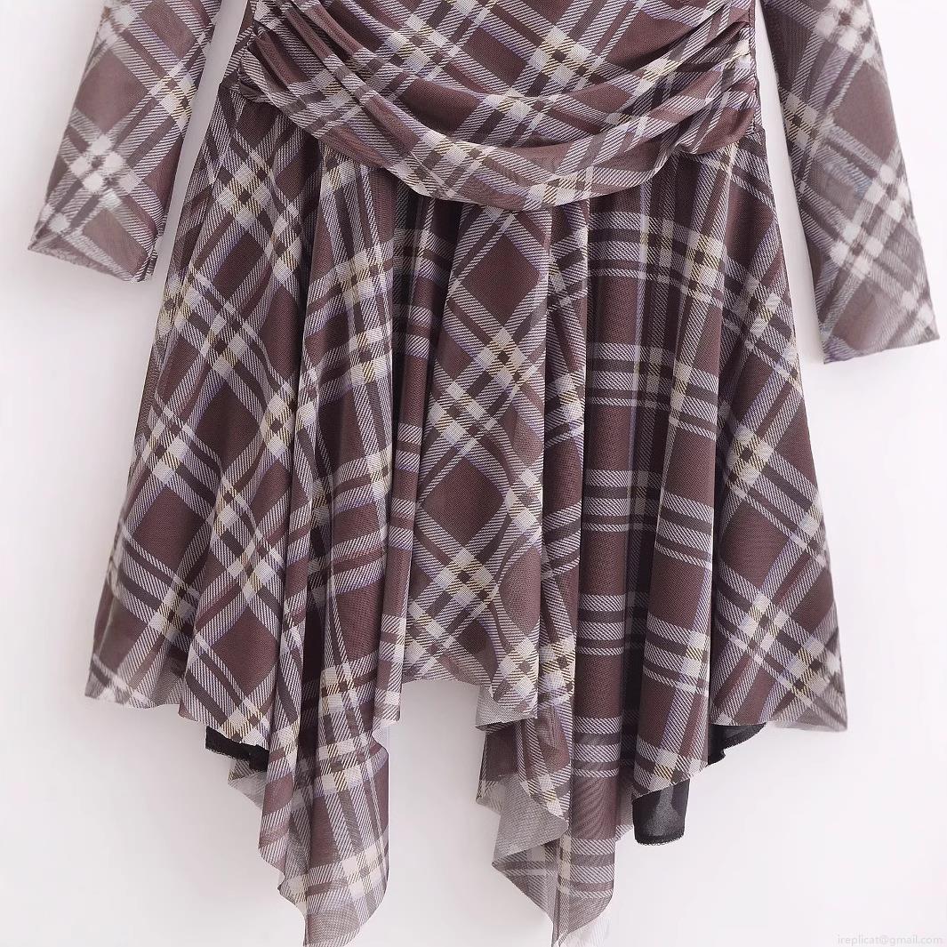 • Women's 100% Polyester Mesh Brown Plaid Dress Long Sleeve Round Neck Ruched Asymmetric Hem Midi Dress Elegant Retro Streetwear Summer Bodycon Dress