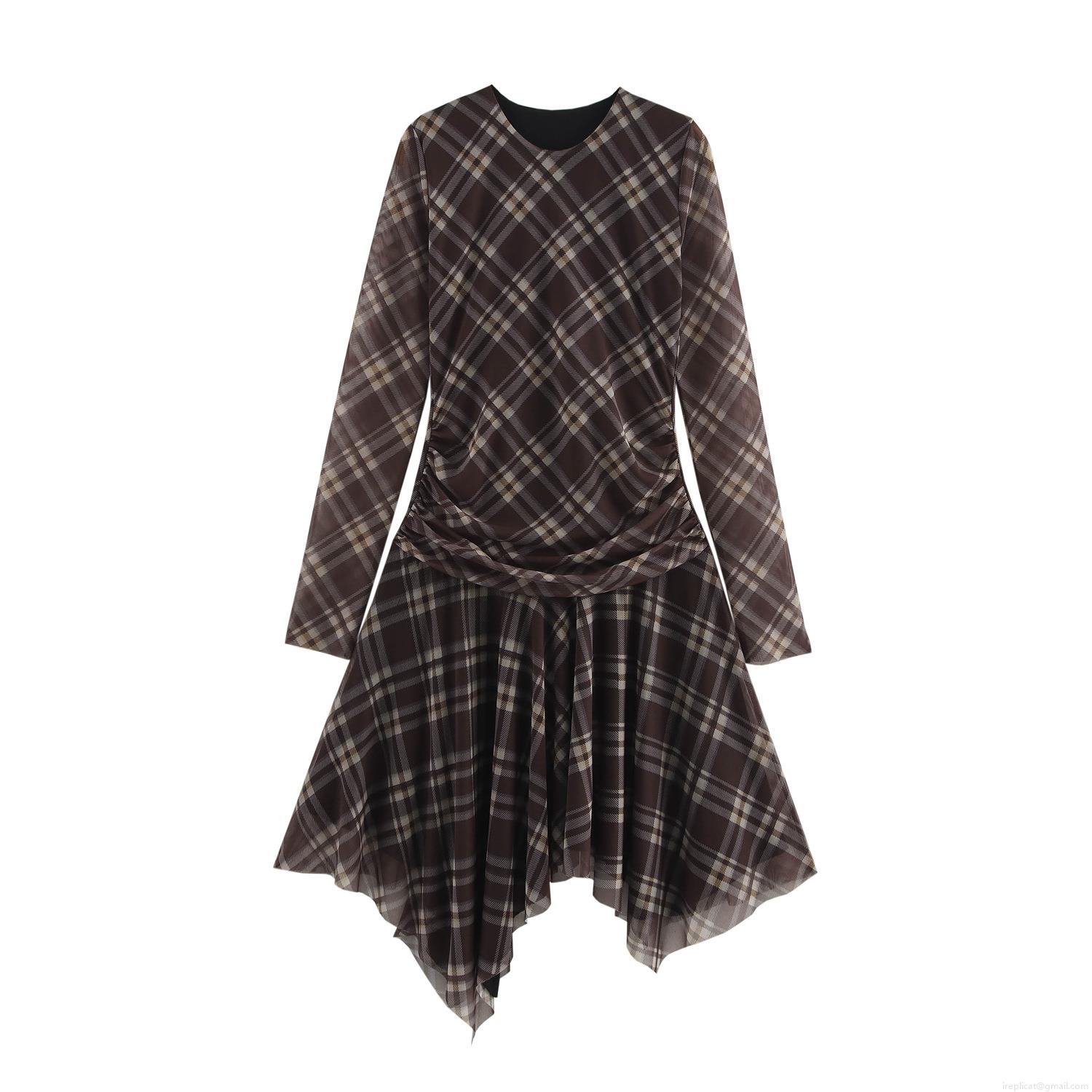 • Women's American Vintage Plaid Midi Dress Irregular Hem Long Sleeve Round Neck Ruched Waist Mesh Dress Elegant Office Lady Party Clothing