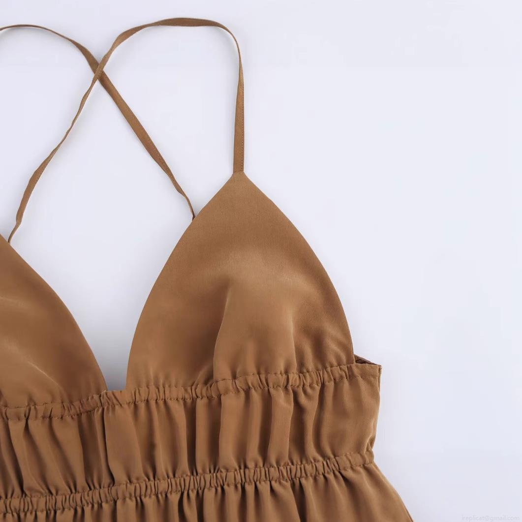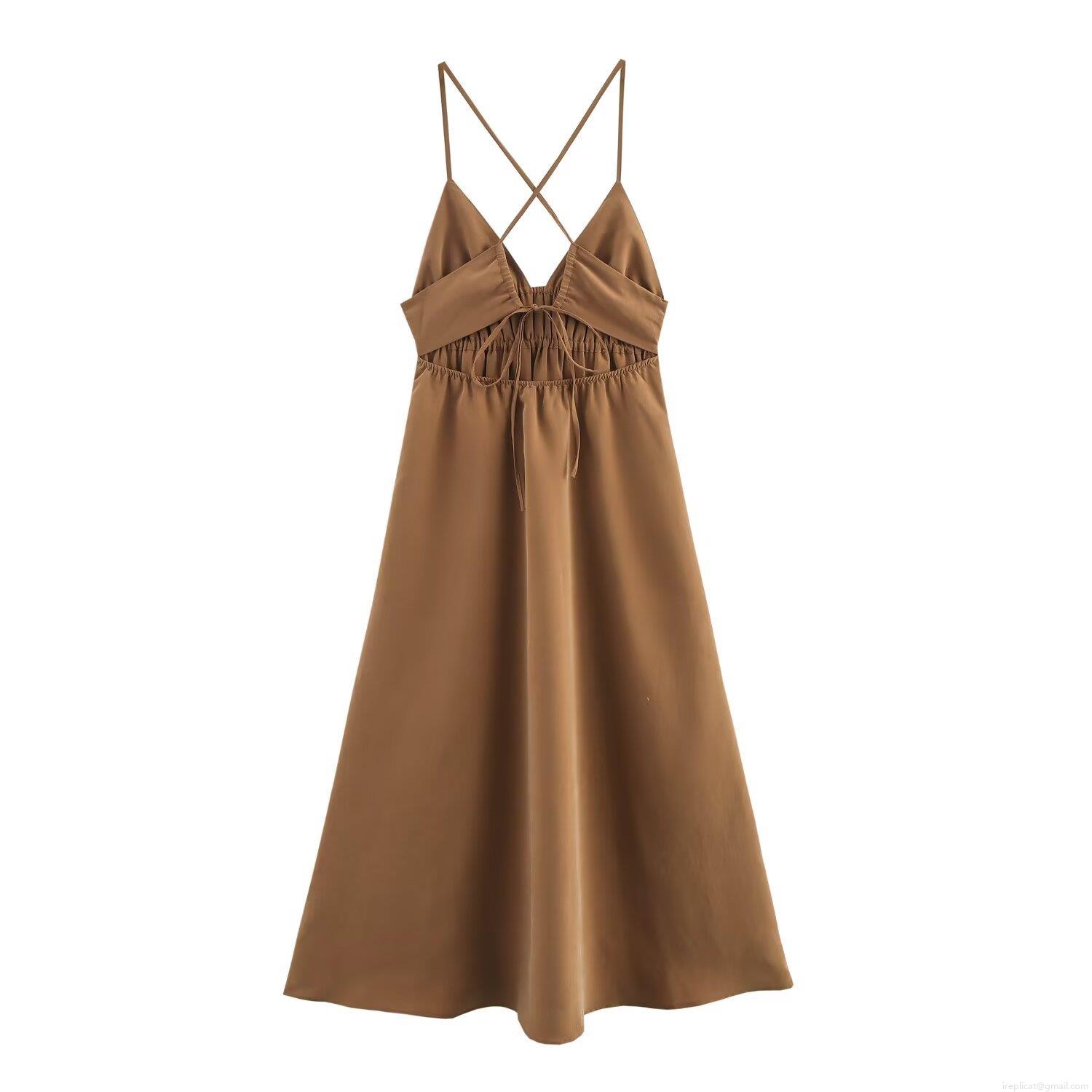 • Women's Backless Satin Cami Midi Dress Cross Straps V Neck Ruched Waist Sexy Bodycon Sundress Deep Brown Evening Party Dress Summer Outfits For Women