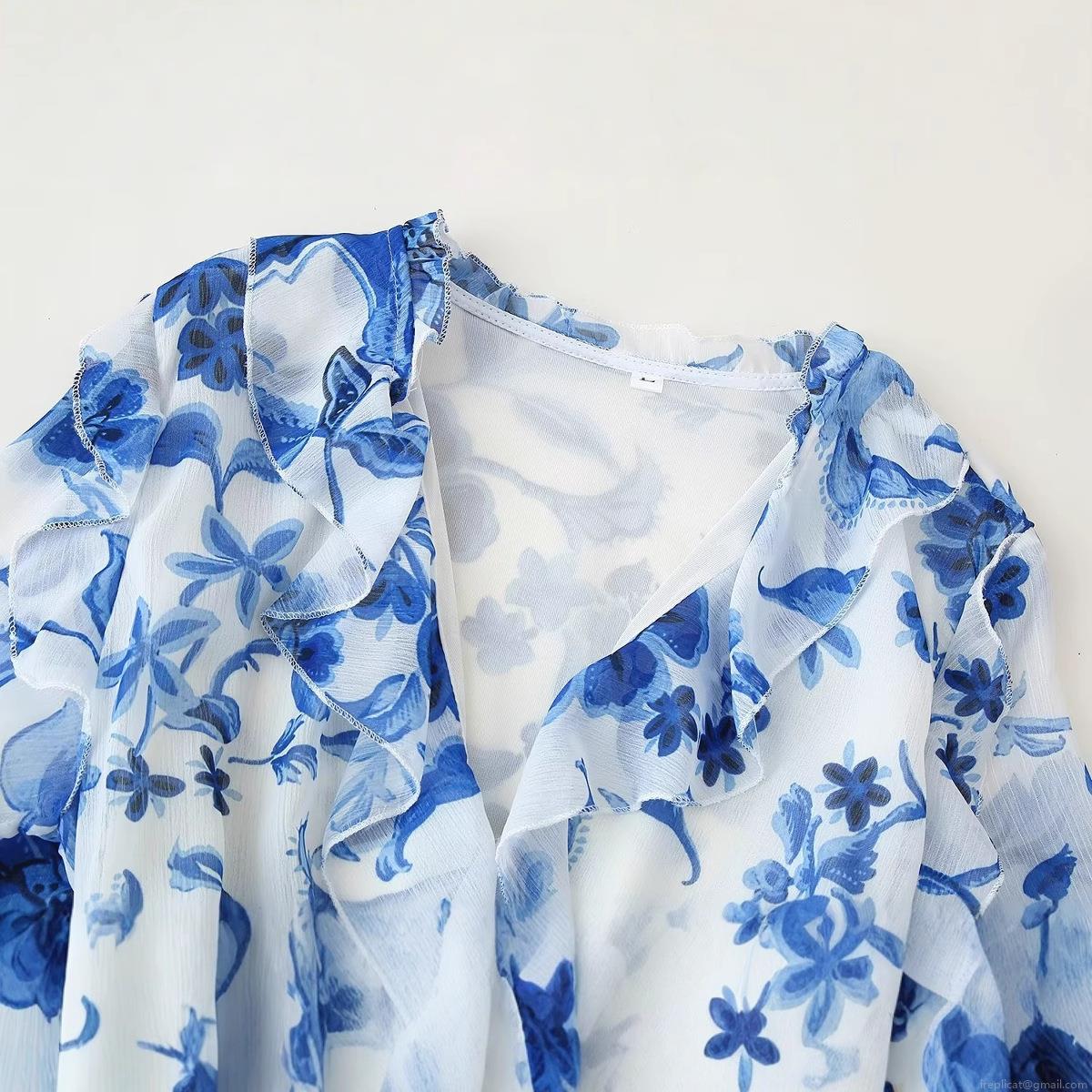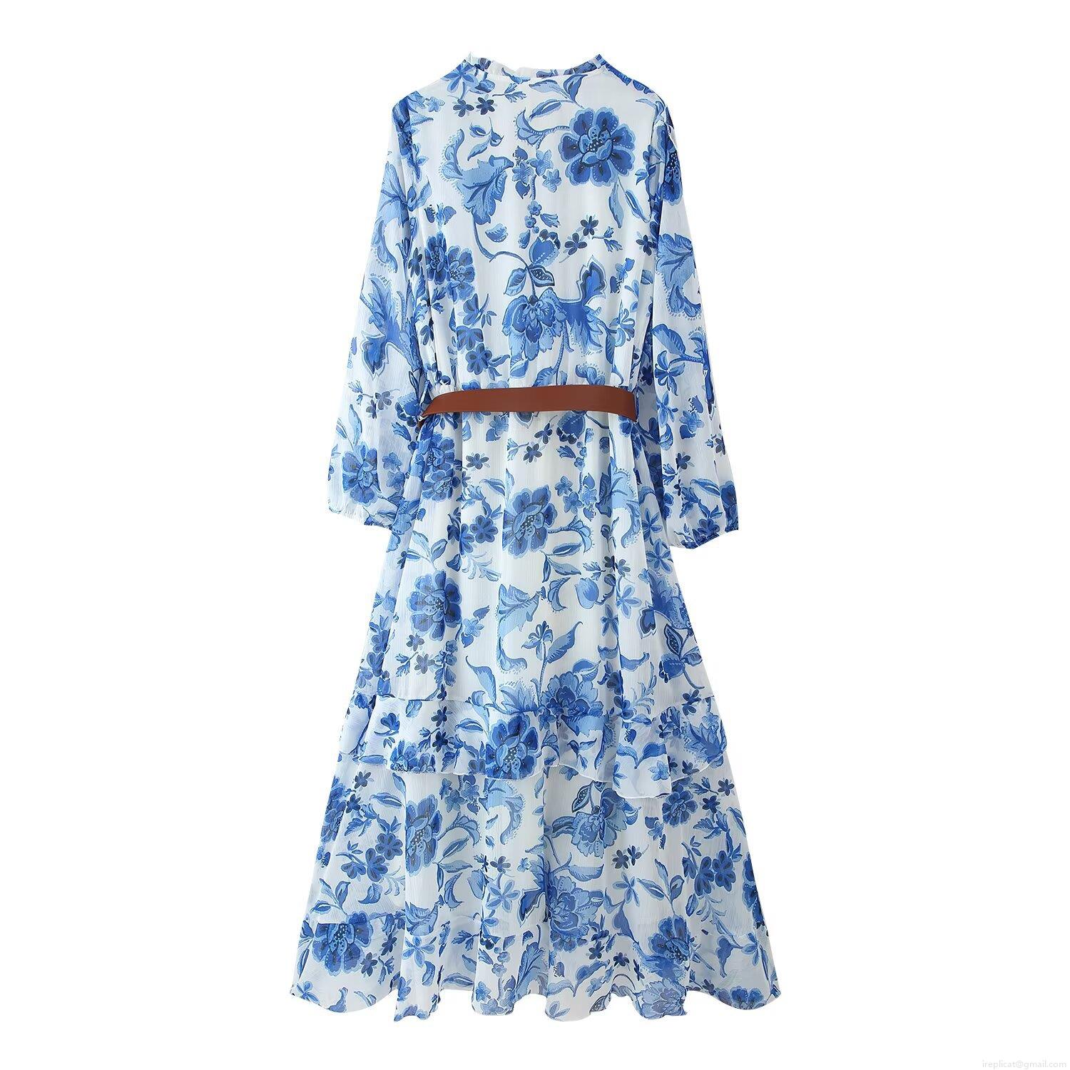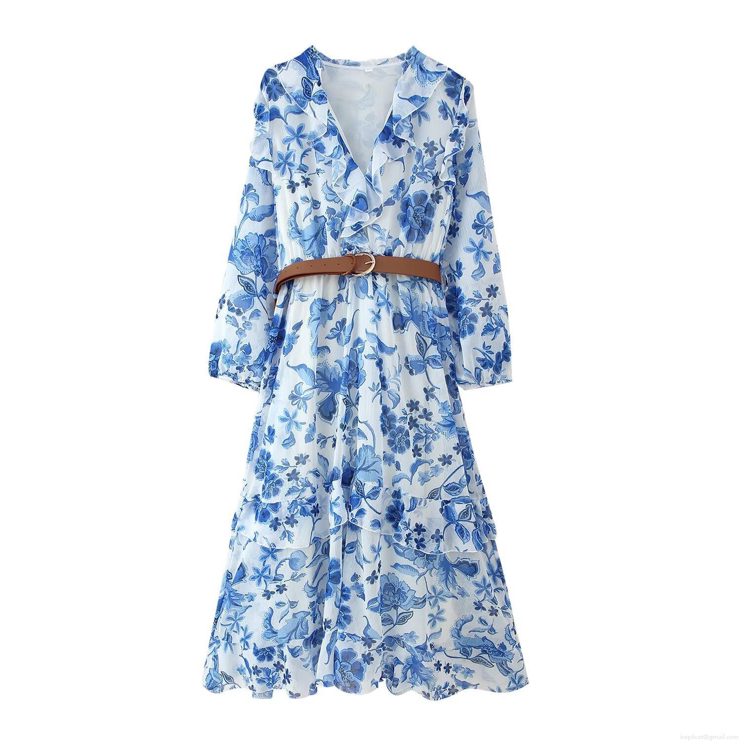 • Women's Blue Floral Chiffon Midi Dress V-Neck Long Sleeve Elegant Vacation Beach A-Line Dress With Belt Lightweight Printing Long Dress