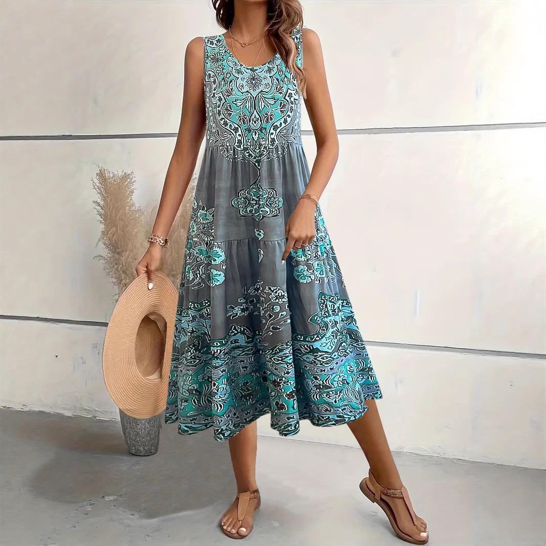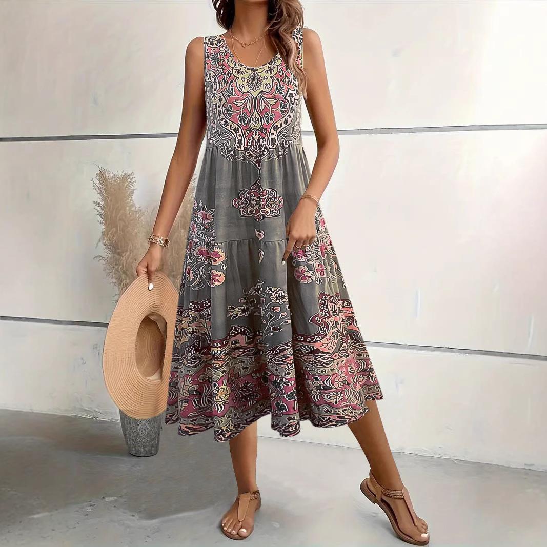 • Women's Bohemian Floral Print Sleeveless Midi Dress Elegant Polyester Spandex Blend Round Neck A-Line Summer Vacation Beach Pullover Long Sundress