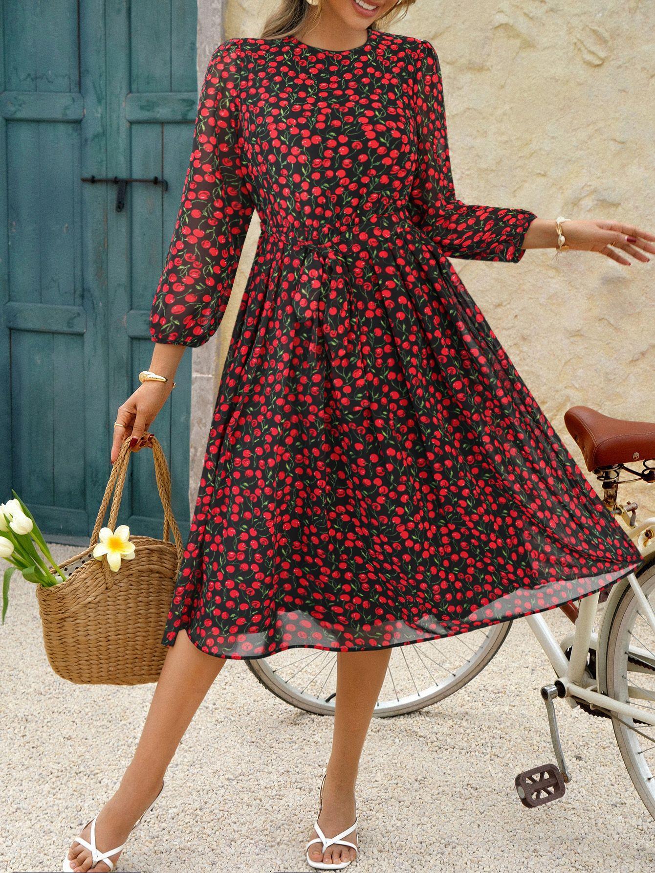 Cherry, Polka Dots, Floral Pattern, Floral Print, Lantern Sleeves, Pleated Skirt, Waist-cinching Belt