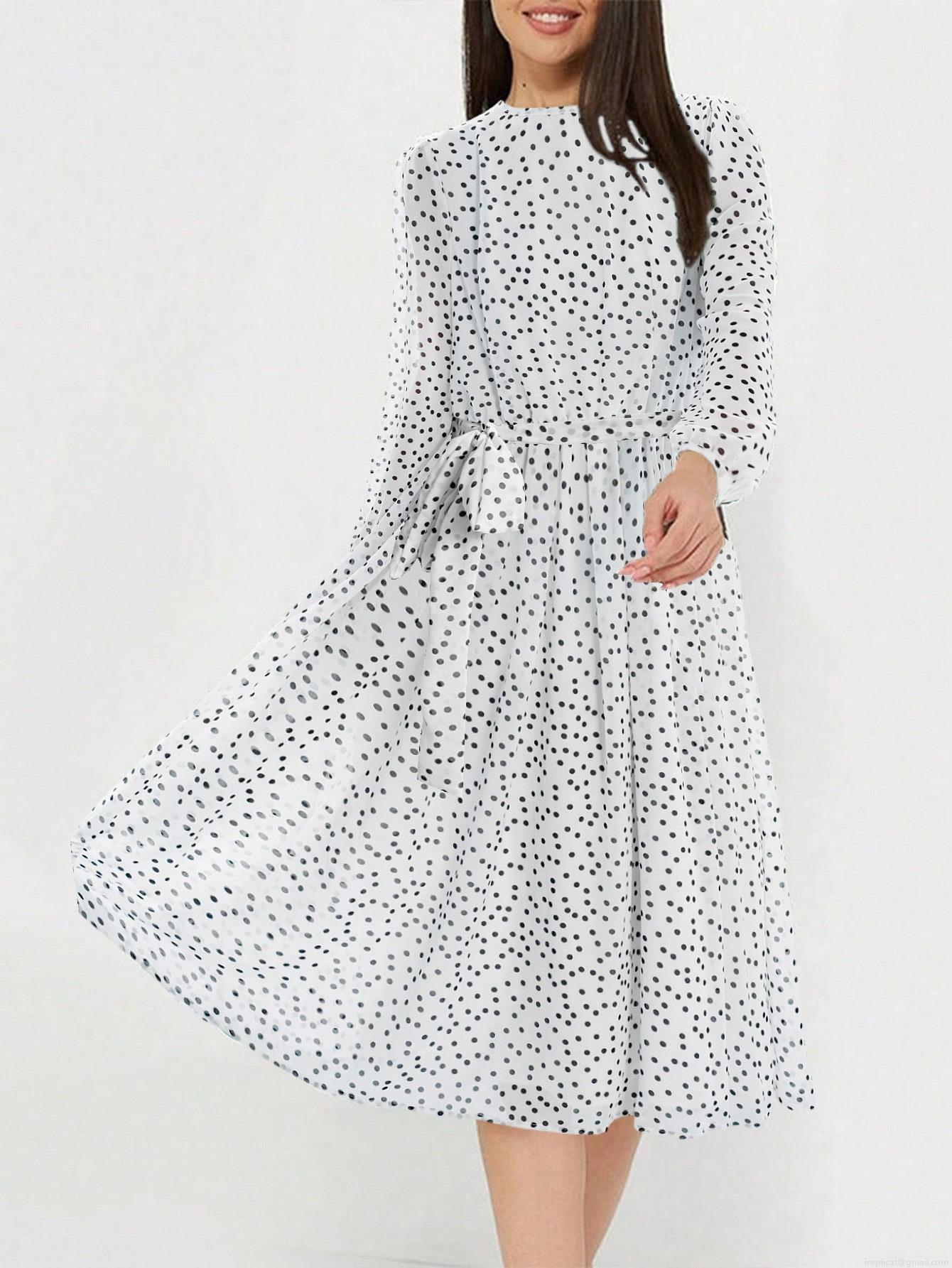 • Women's Casual Polyester Floral Polka Dot Long Sleeve Dress Lantern Sleeve Tie Waist A-Line Midi Dress For Vacation Lady Chic Spring Wear