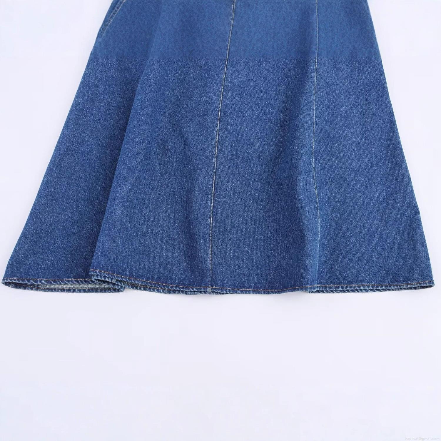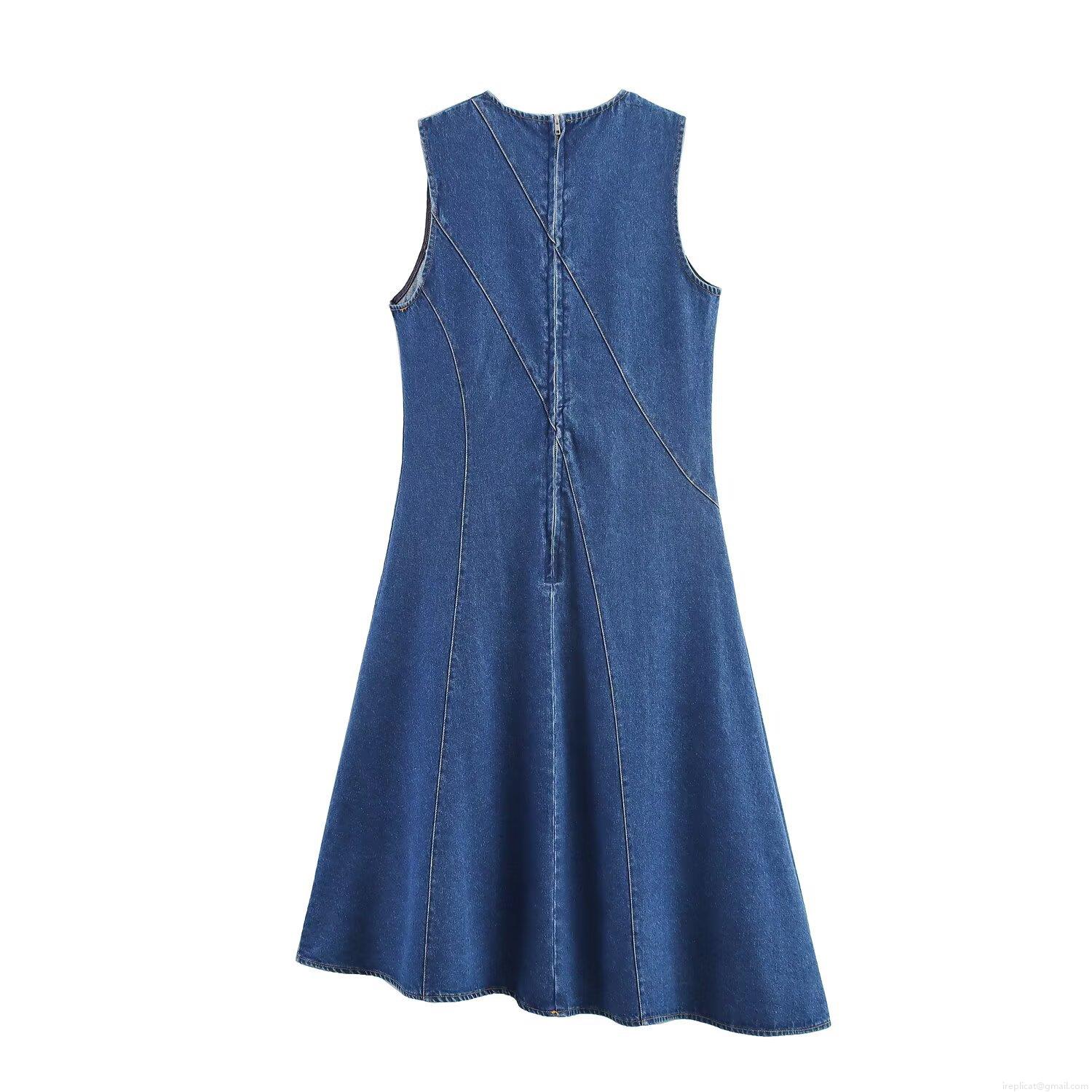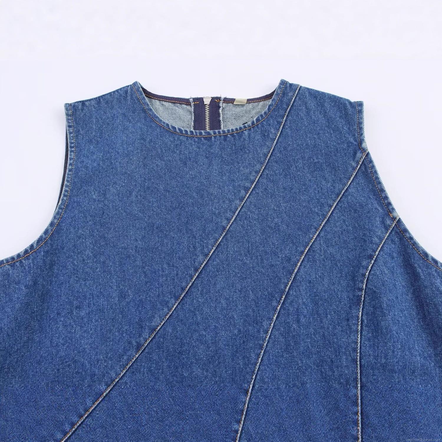 • Women's Casual Sleeveless Denim Midi Dress With Round Neck And Asymmetrical Hem Patchwork Street Style Solid Color One-Piece Denim Dress For Women