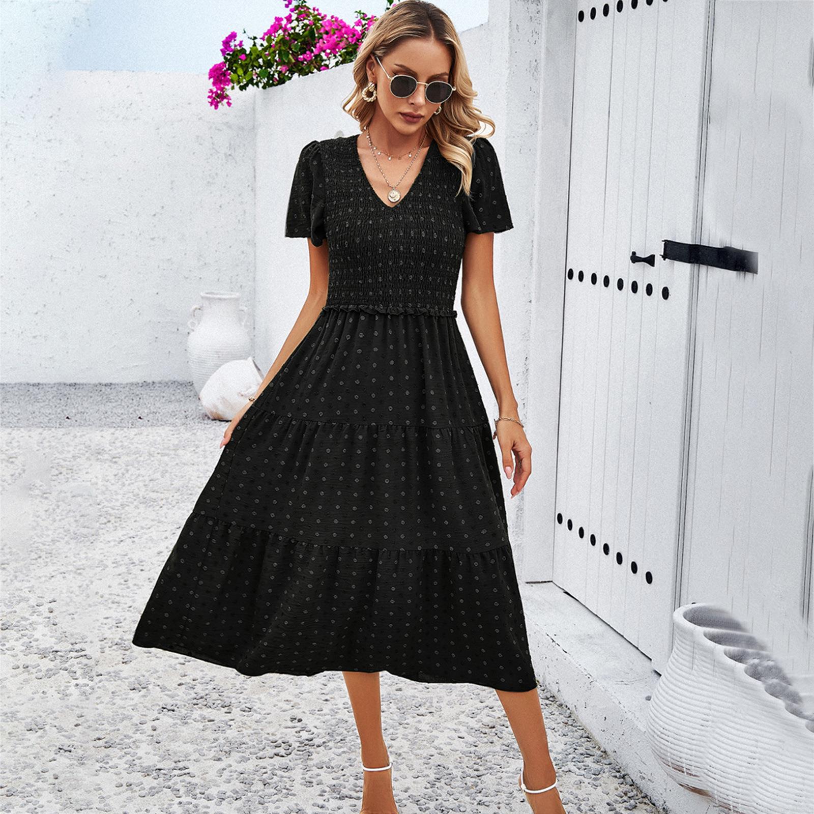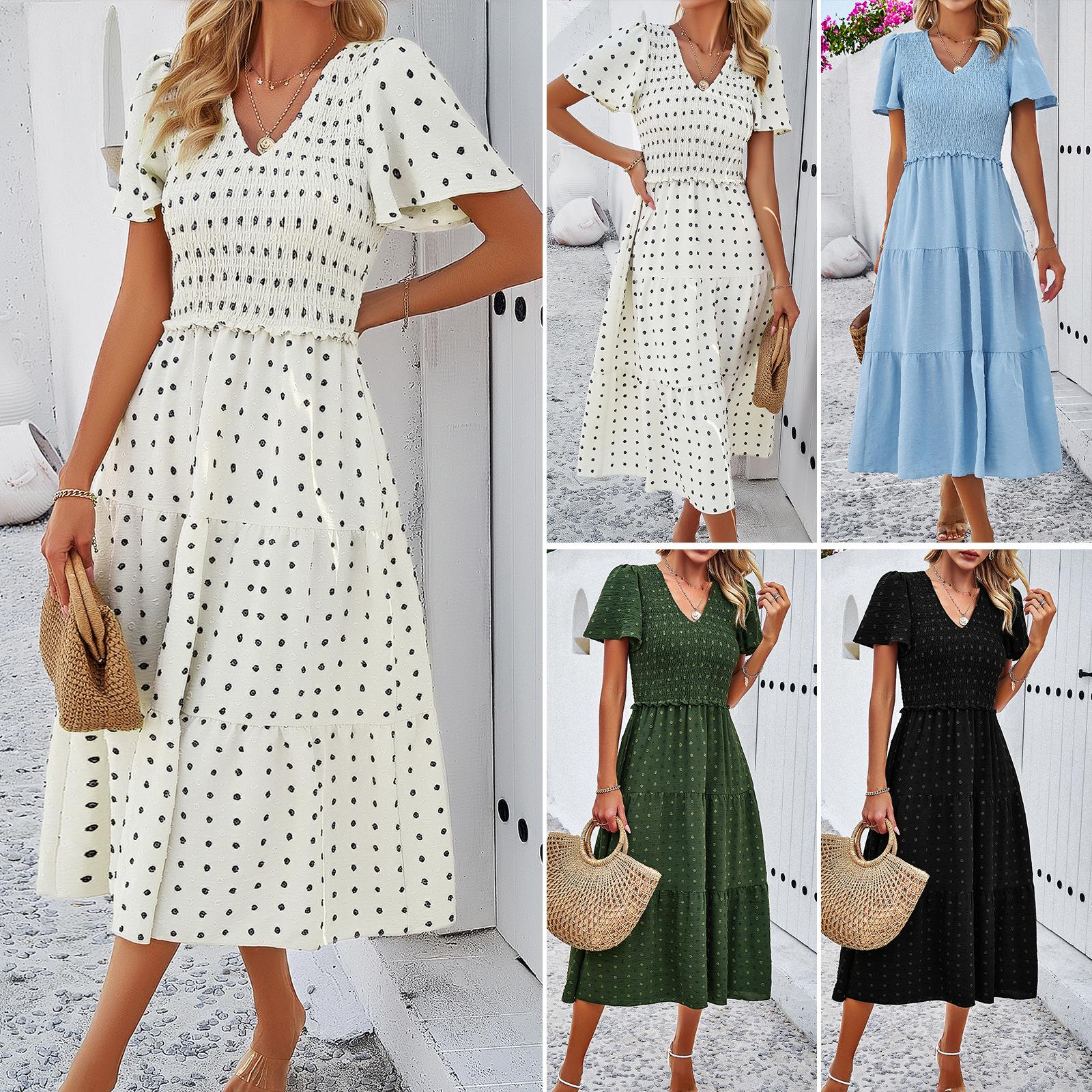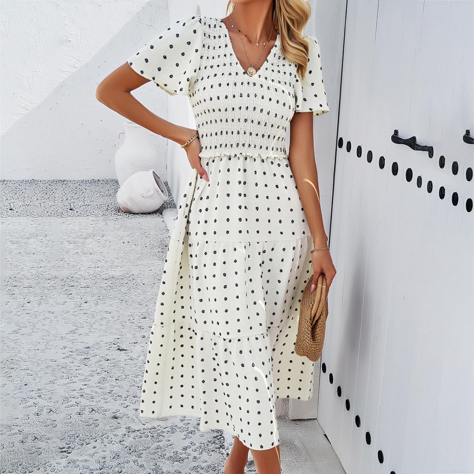 • Women's Casual V-Neck Polka Dot Smocked Tiered Midi Dress Summer Short Sleeve High Waist Bohemian A-Line Vacation Sun Dress