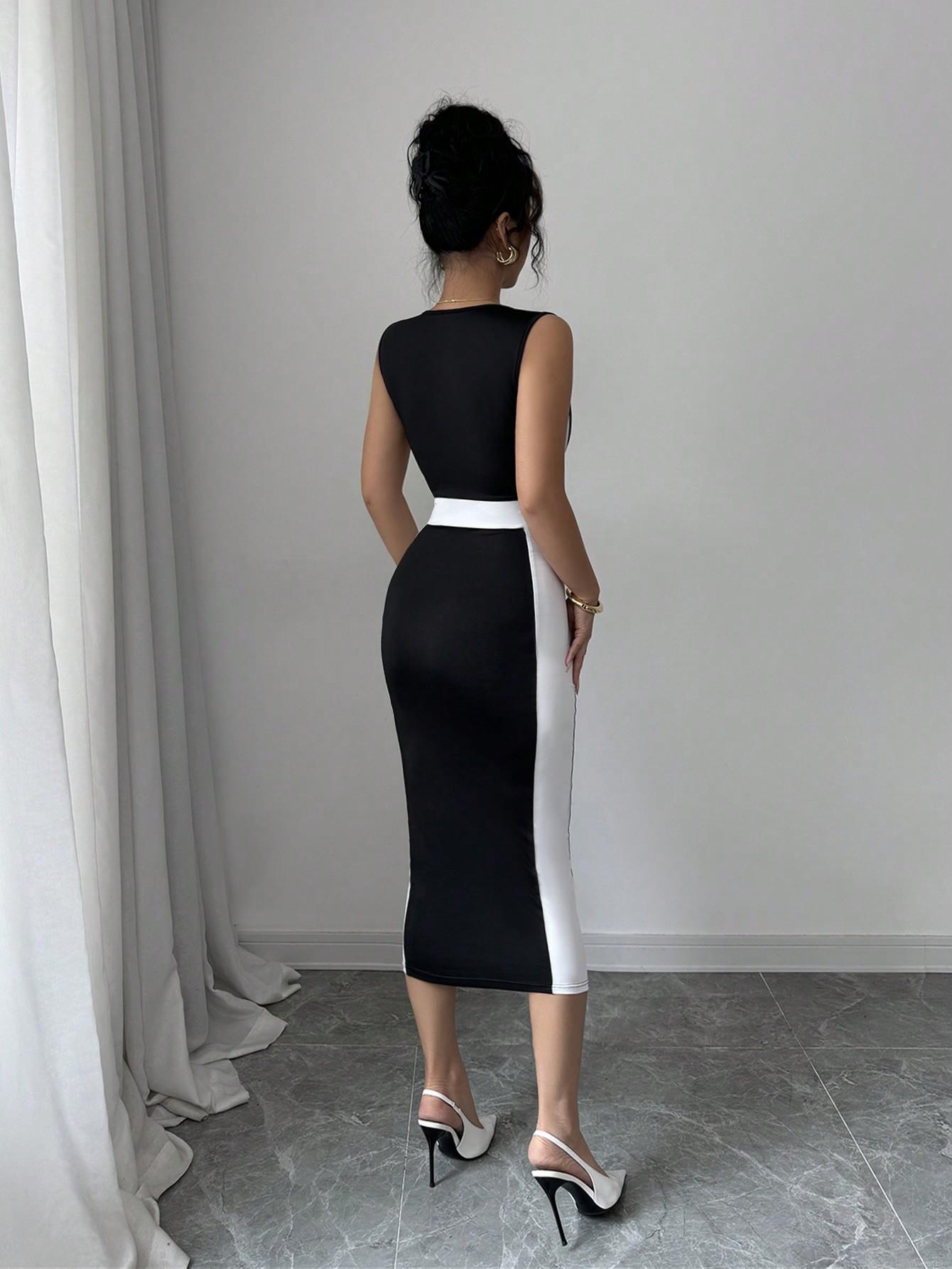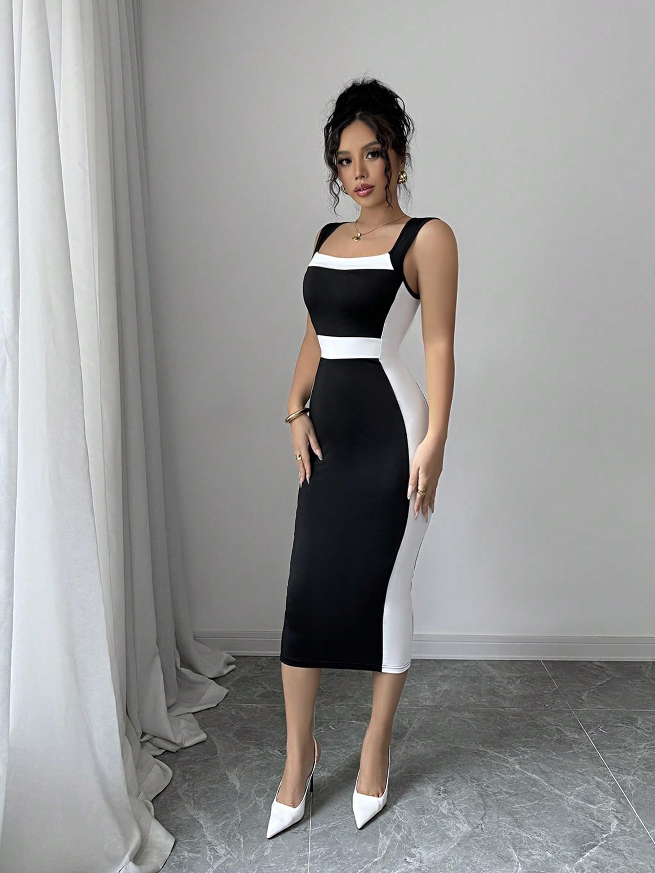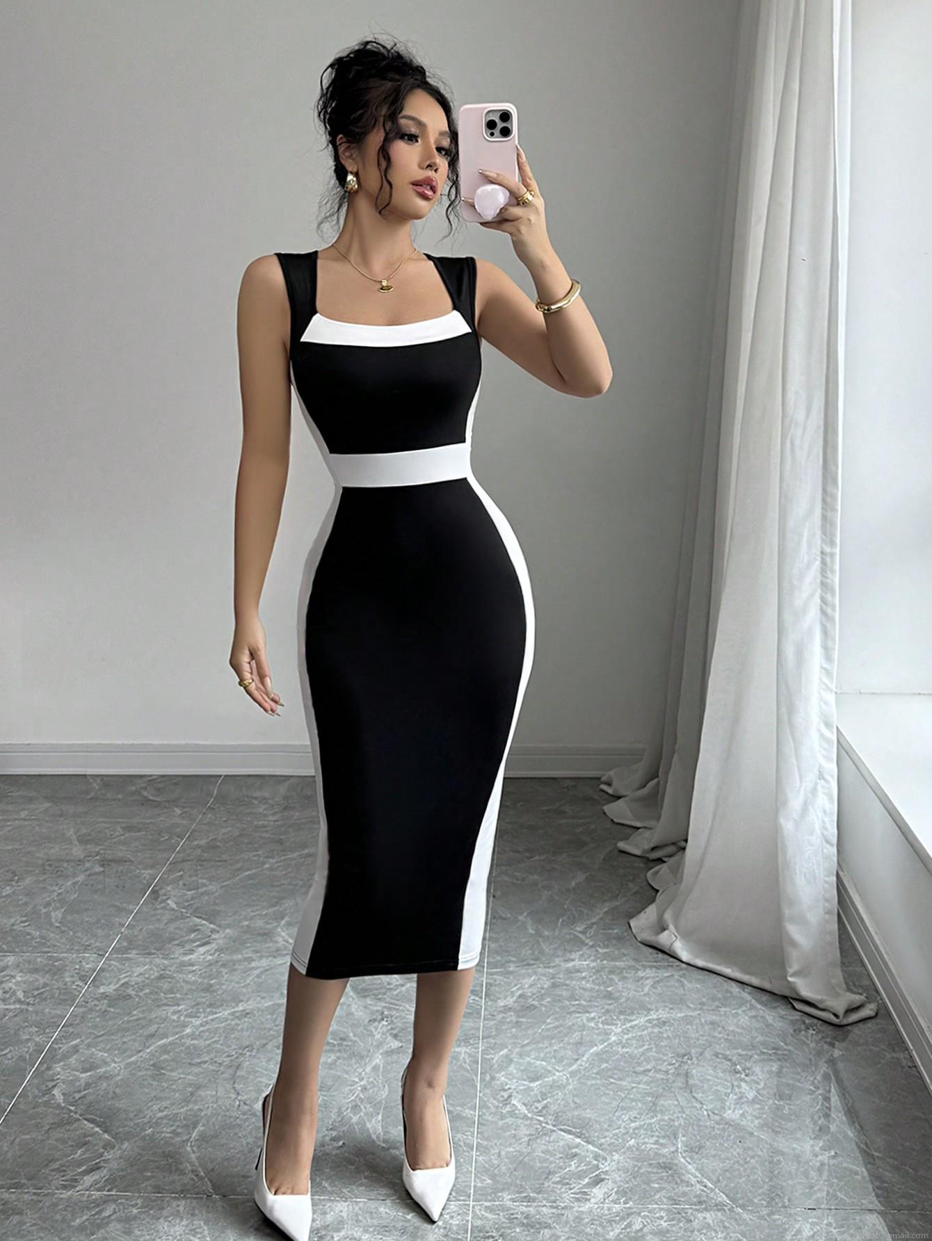 • Women's Contrast Color Block Knitted Midi Dress Sleeveless Square Neck Slim Fit Bodycon Pencil Dress For Summer Party Clubwear