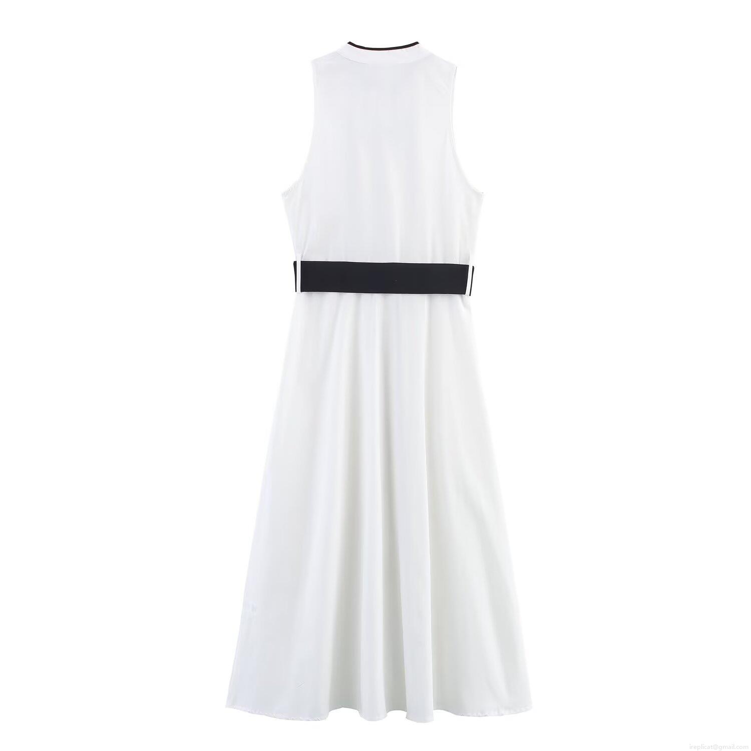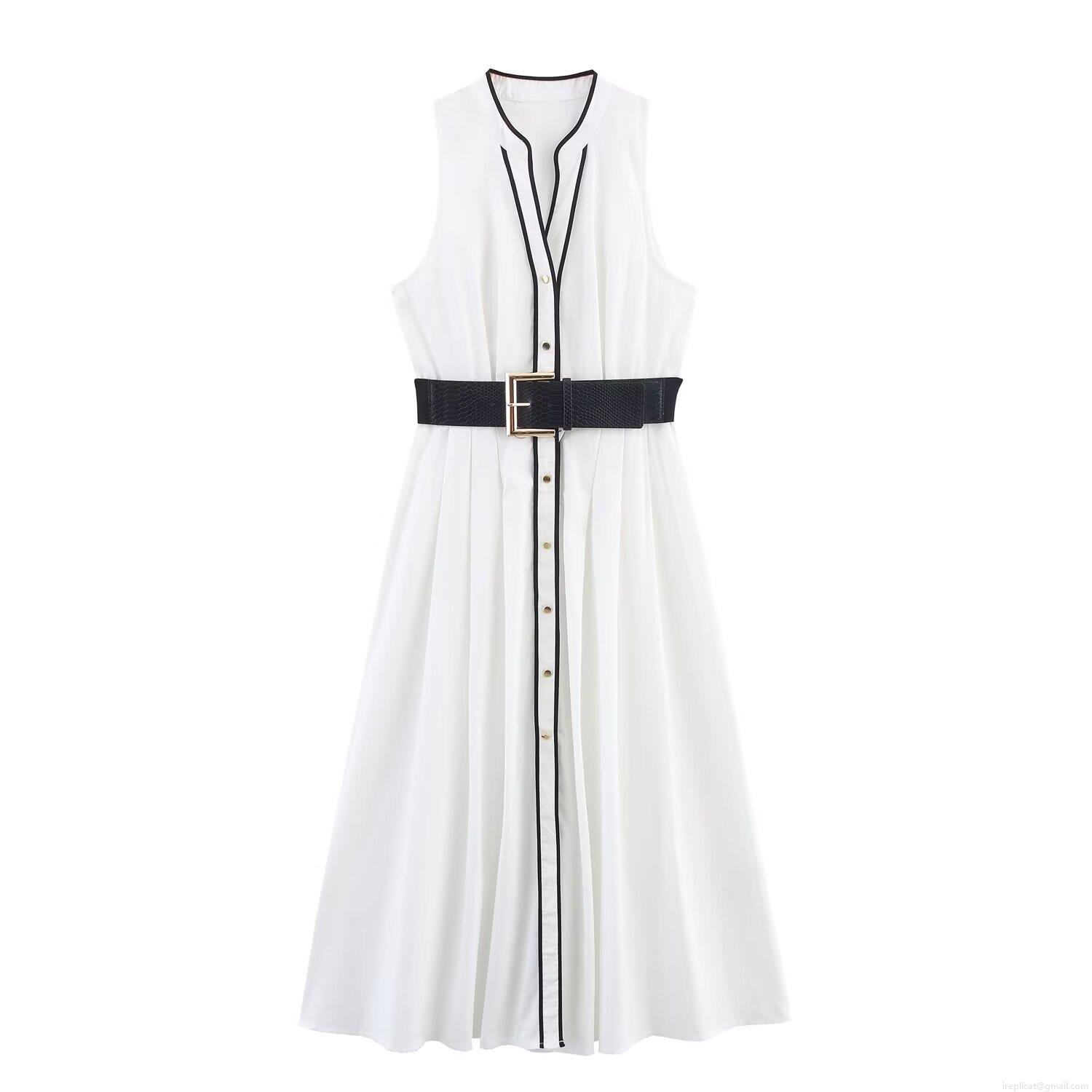 Women's Contrast Trim Sleeveless Belted Midi Dress Polyester Single Breasted V Neck Long Vest Dress Summer Street Style Elegant Party Lady Casual Outfits