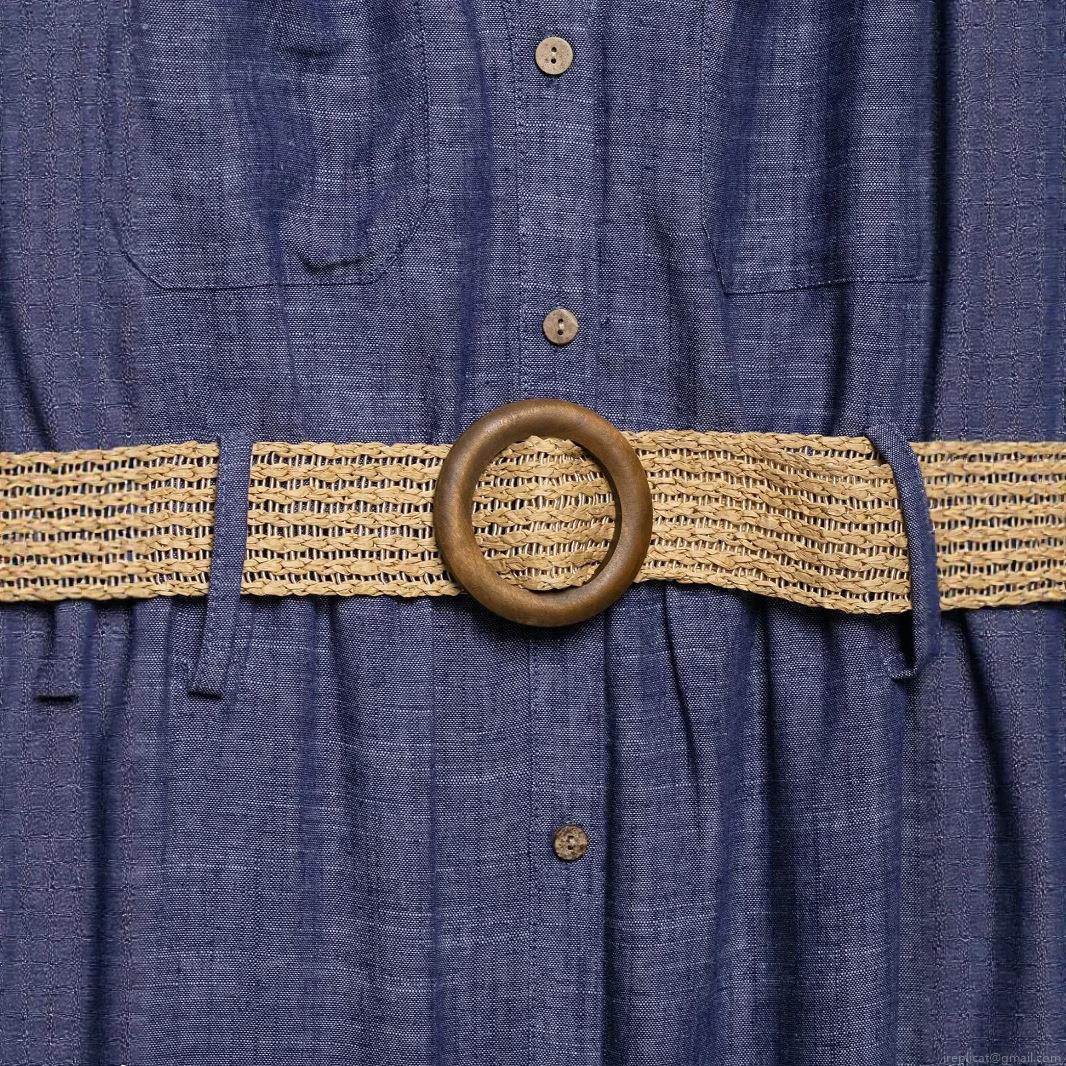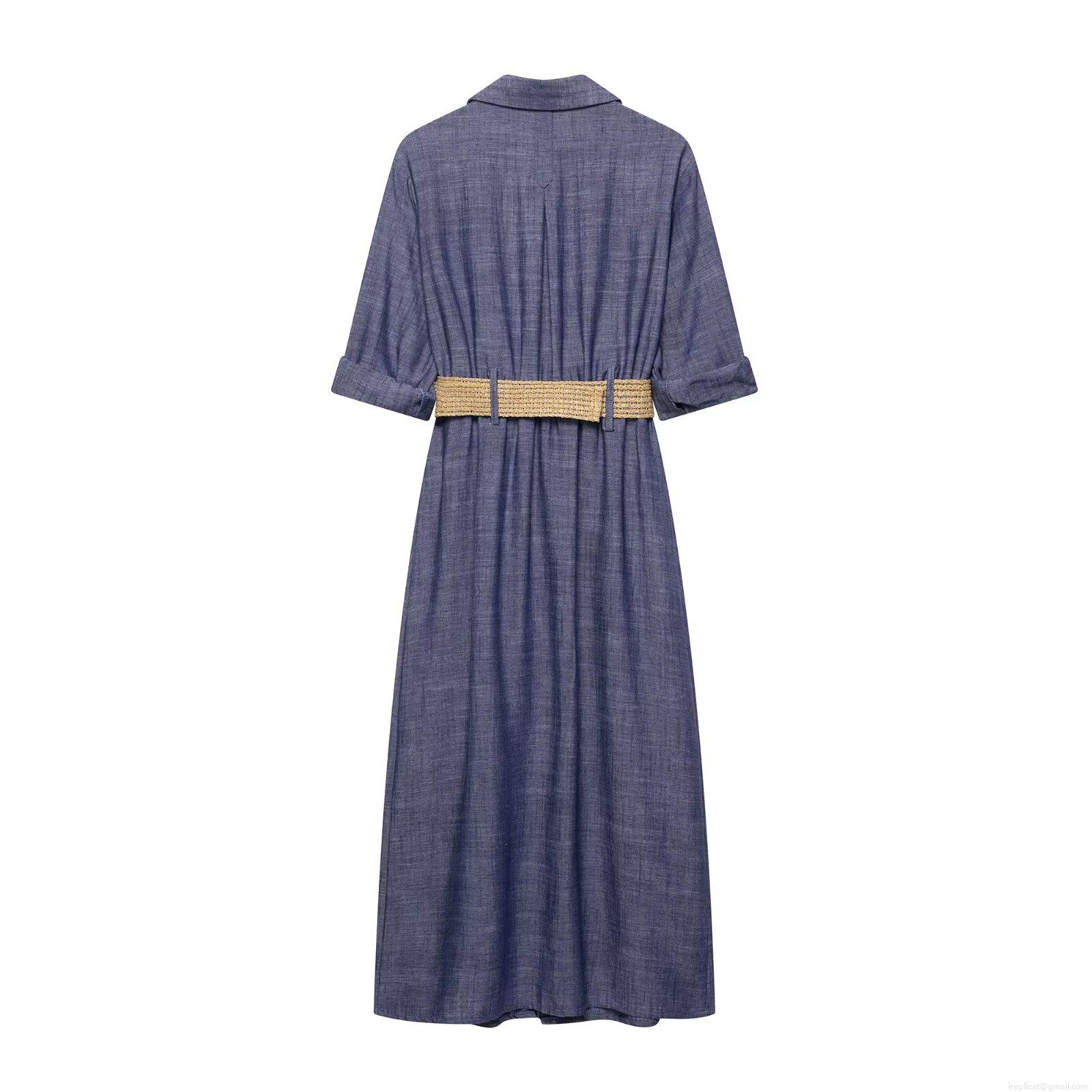 • Women's Deep Blue Midi Shirt Dress Polyester Cotton Linen Blend Short Sleeve V-Neck Single Breasted Long Dress With Wood Buckle Straw Belt Elegant Casual European Style