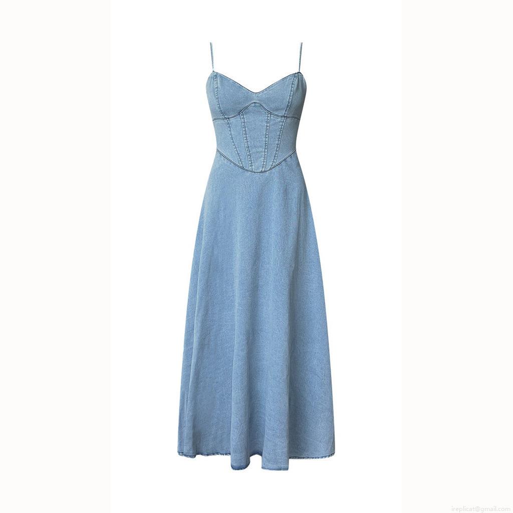 • Women's Denim Cami Dress Sexy V Neck Corset Washed Light Blue Midi Dress High Waist Elastic Back Sleeveless A-Line Long Dress for Summer Vacation Party