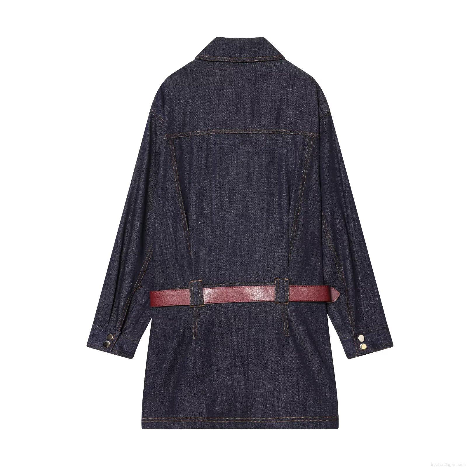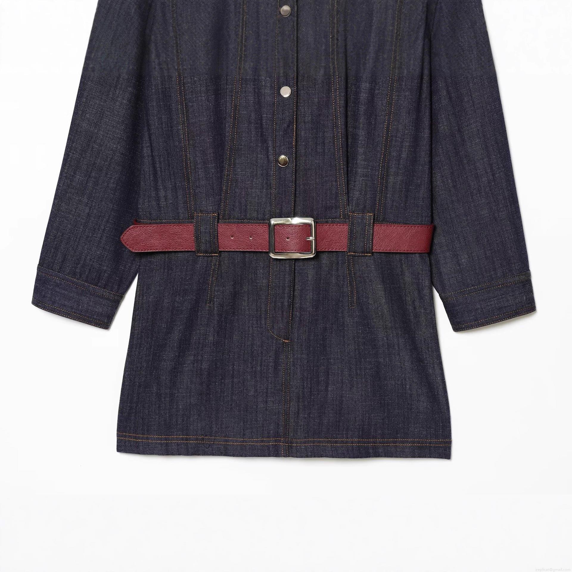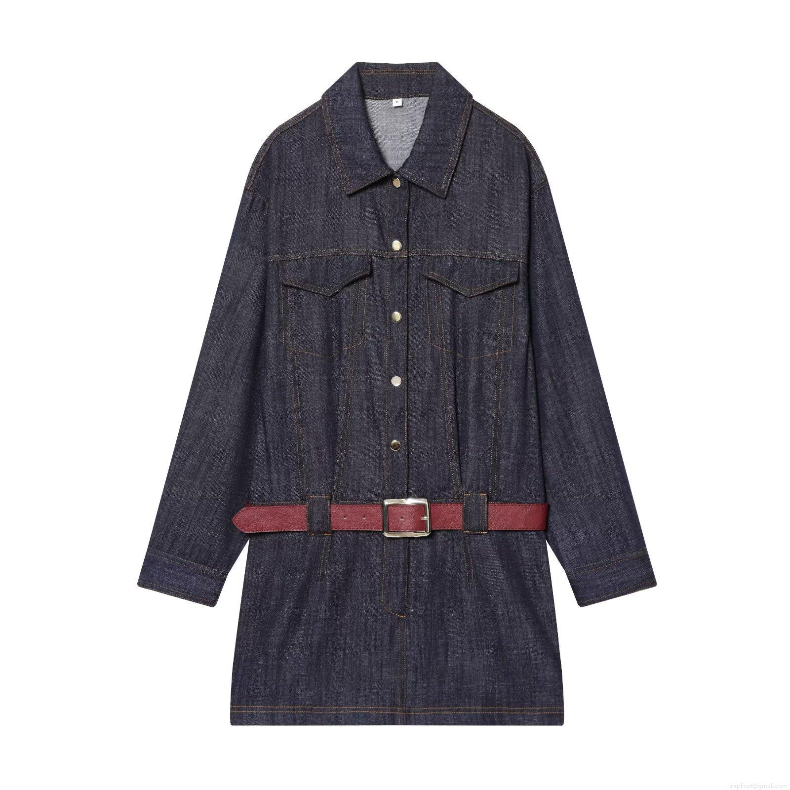 • Women's Denim Midi Dress Long Sleeve Lapel Single Breasted Jean Shirt Dress With Red Belt Casual Streetwear Fall Fashion Deep Blue