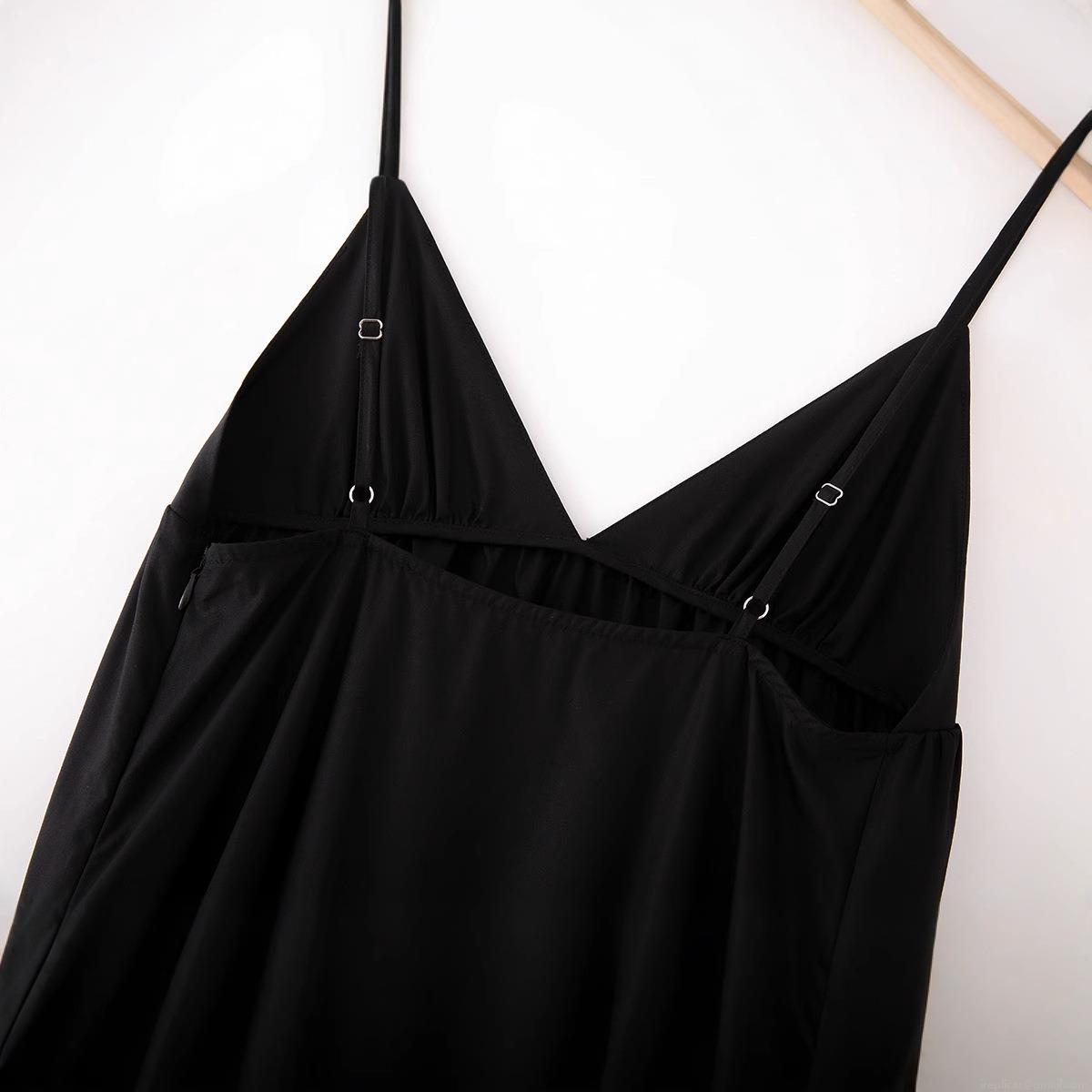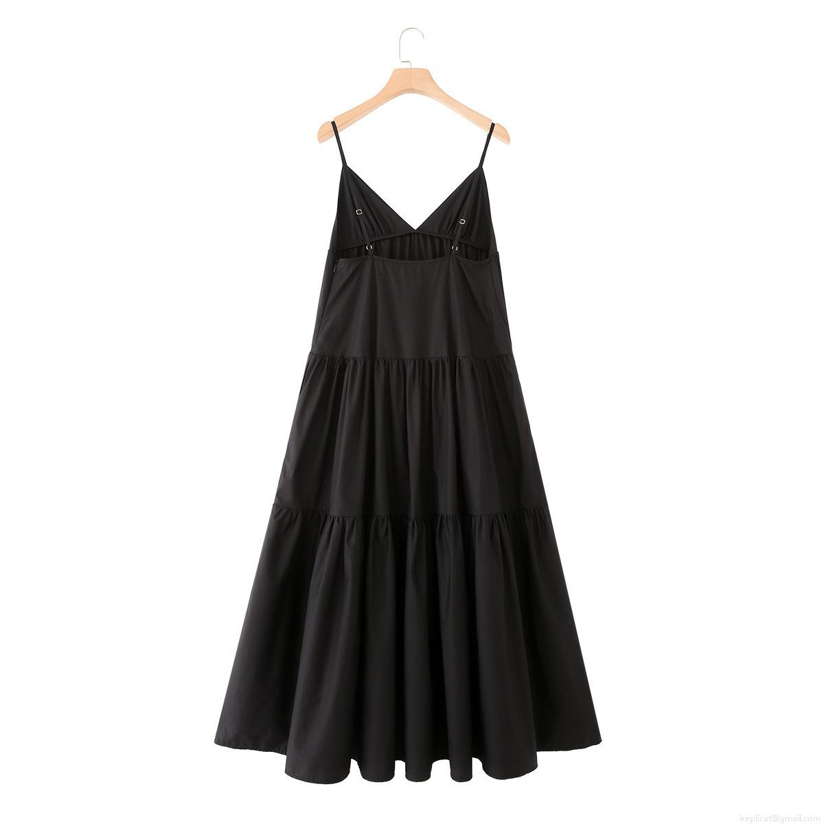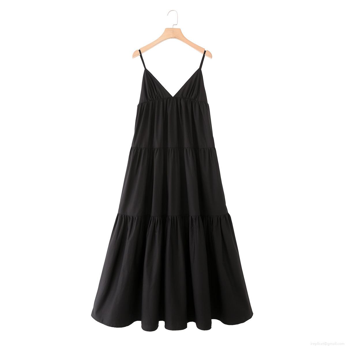 • Women's Elegant 100% Cotton V Neck Spaghetti Strap Tiered Midi Dress Solid Black Sleeveless Multi Layer Cake Skirt Sun Dress for Vacation Party Summer