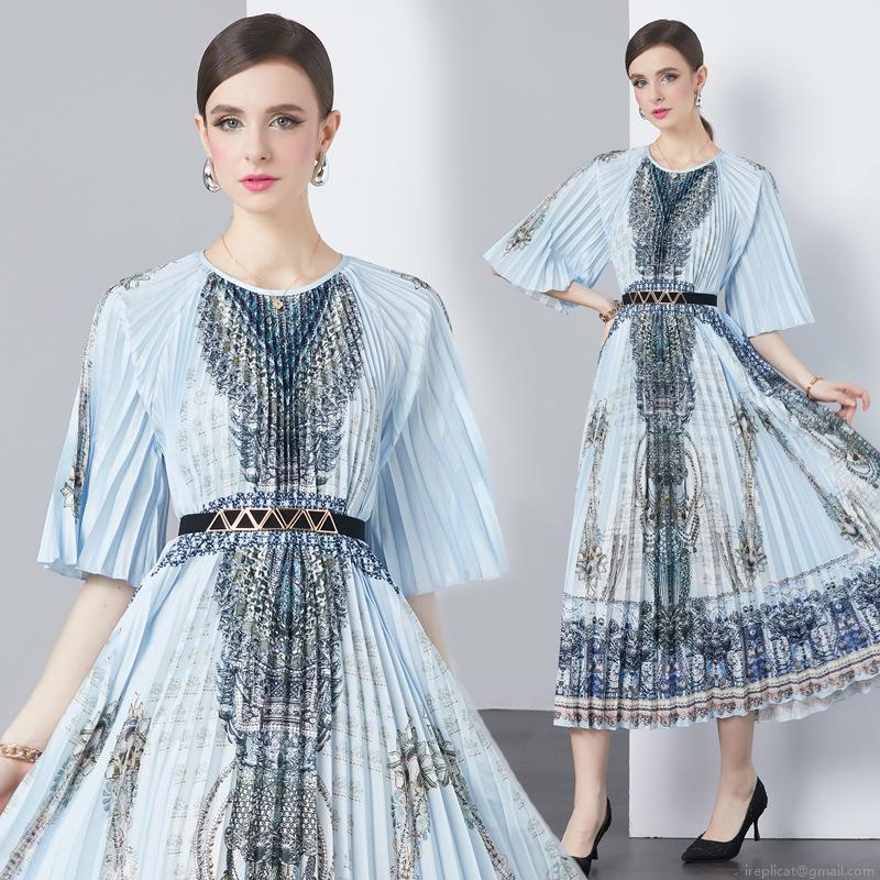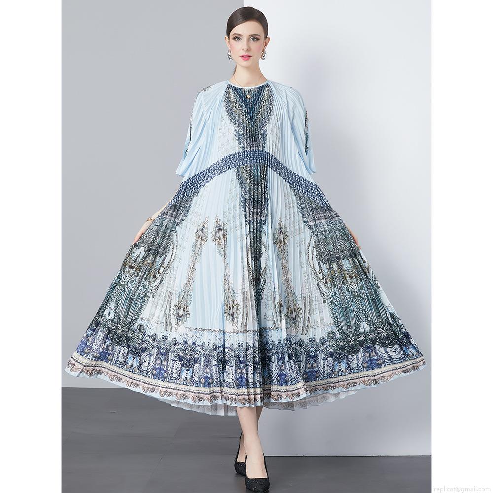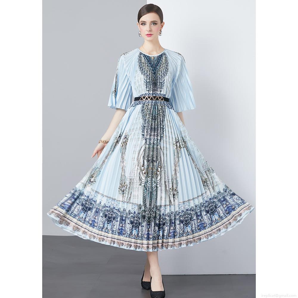 • Women's Elegant Accordion Pleated Midi Dress Retro Baroque Print Round Neck Ruffle Sleeve Flowy Long Dress With Geometric Buckle Belt For Party Office