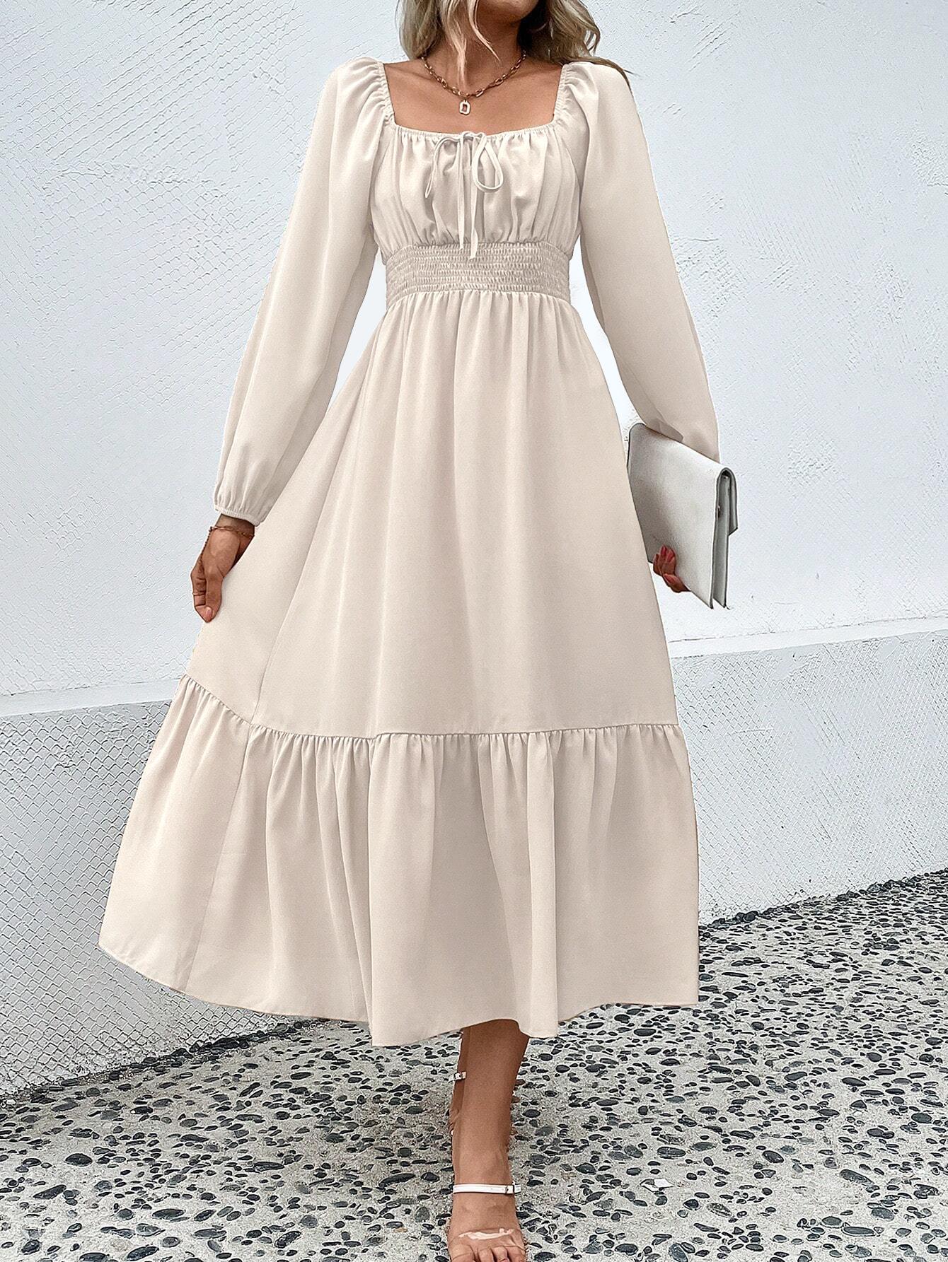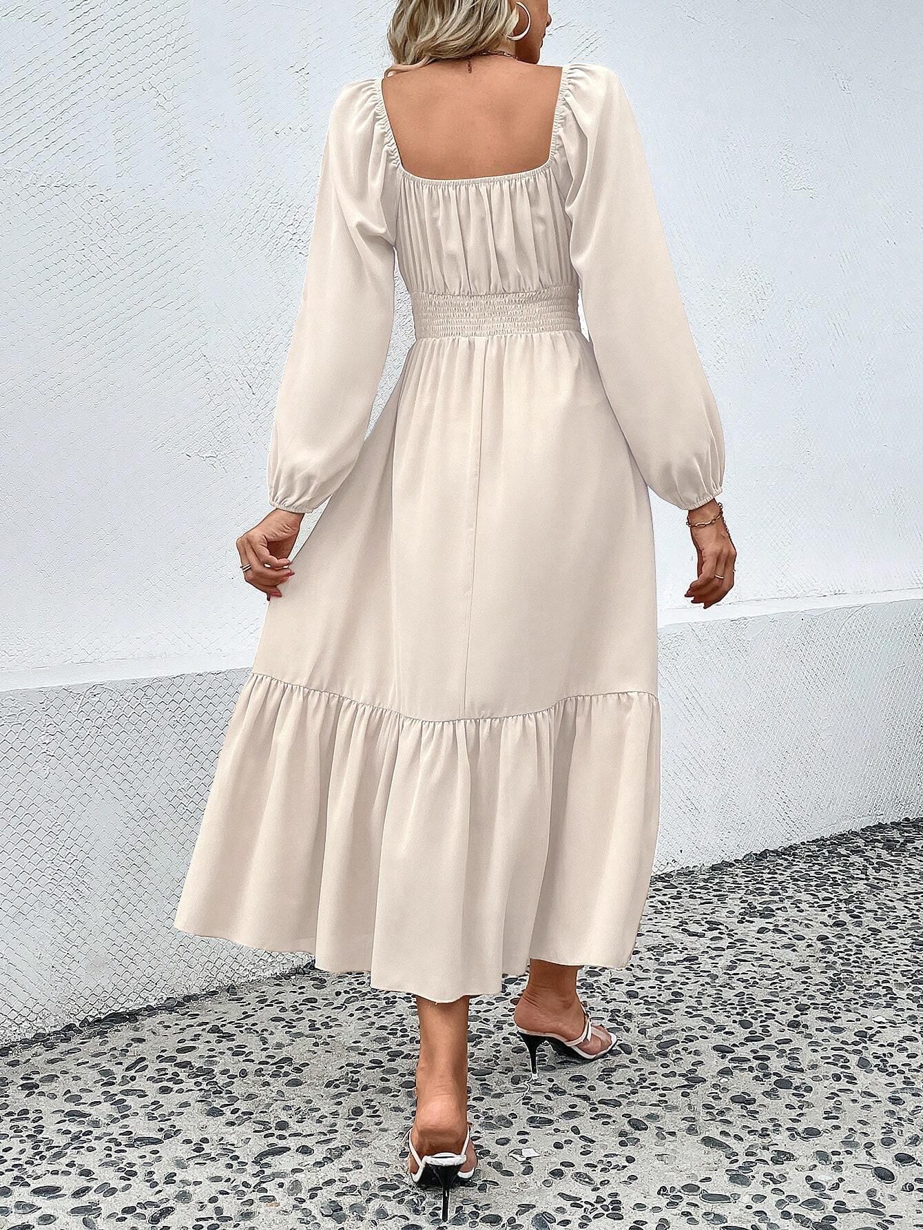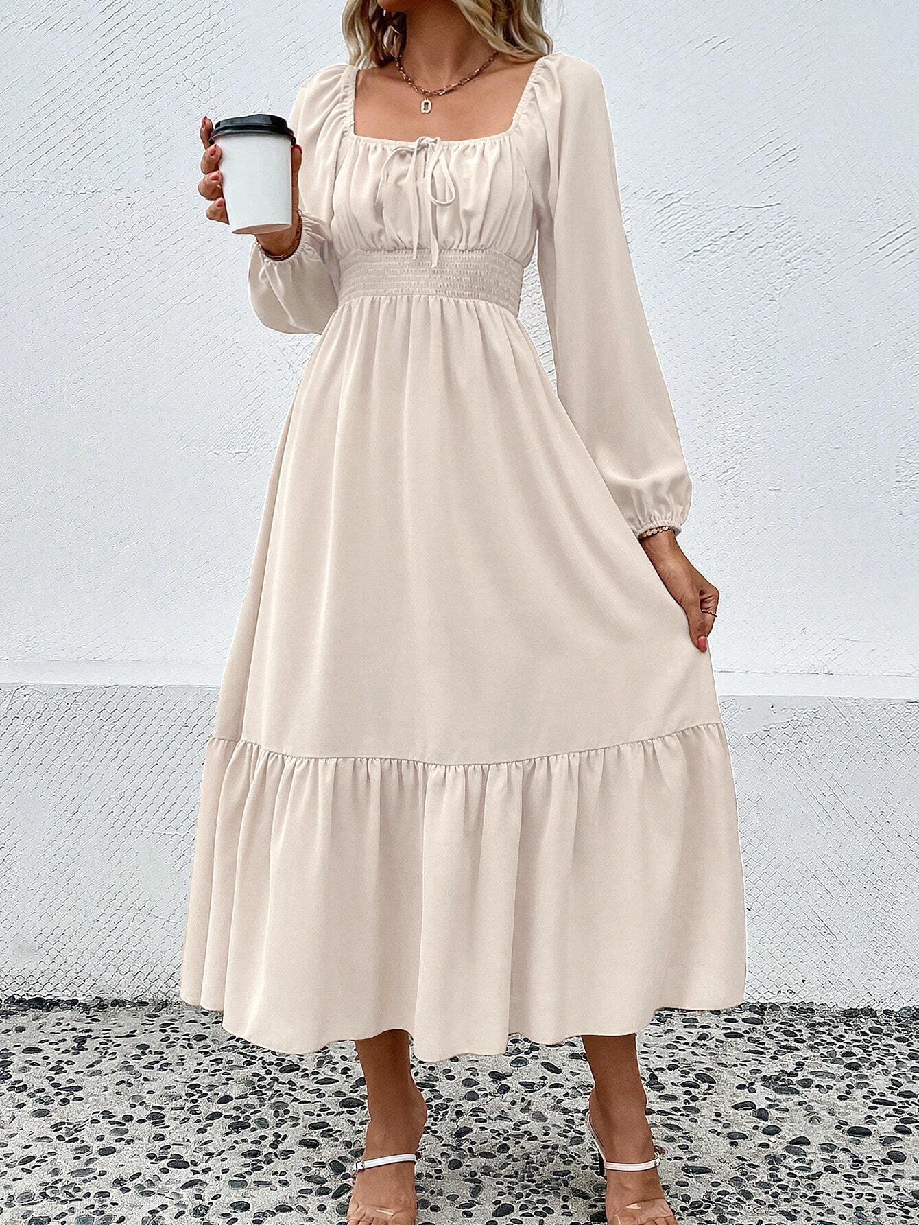 • Women's Elegant Apricot Long Sleeve Square Neck Dress Polyester Spandex Smocked High Waist Ruffle Hem Midi Dresses For Commute Dating Party Ladies Fashion Clothing