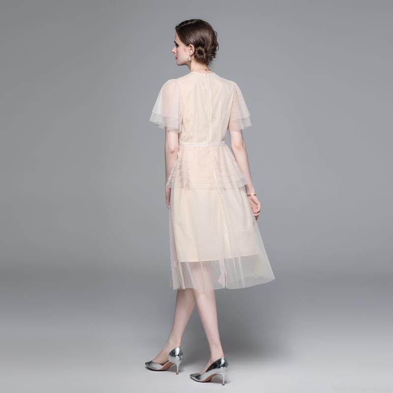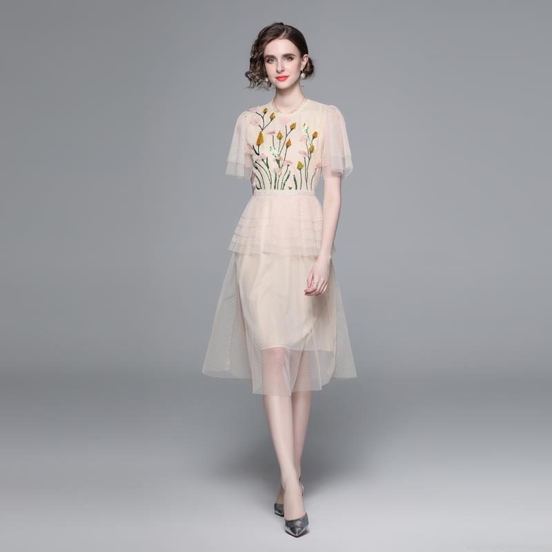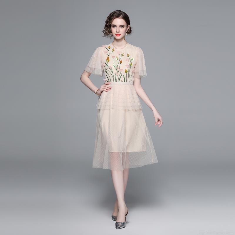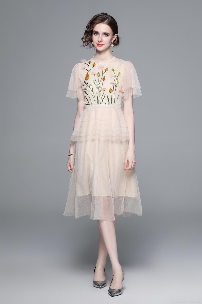 • Women's Elegant Apricot Mesh Embroidered Midi Dress Mesh Patchwork Floral Sequin Layered Cake Dress For Party Wedding Cocktail Casual Short Sleeve Ruffle Dress
