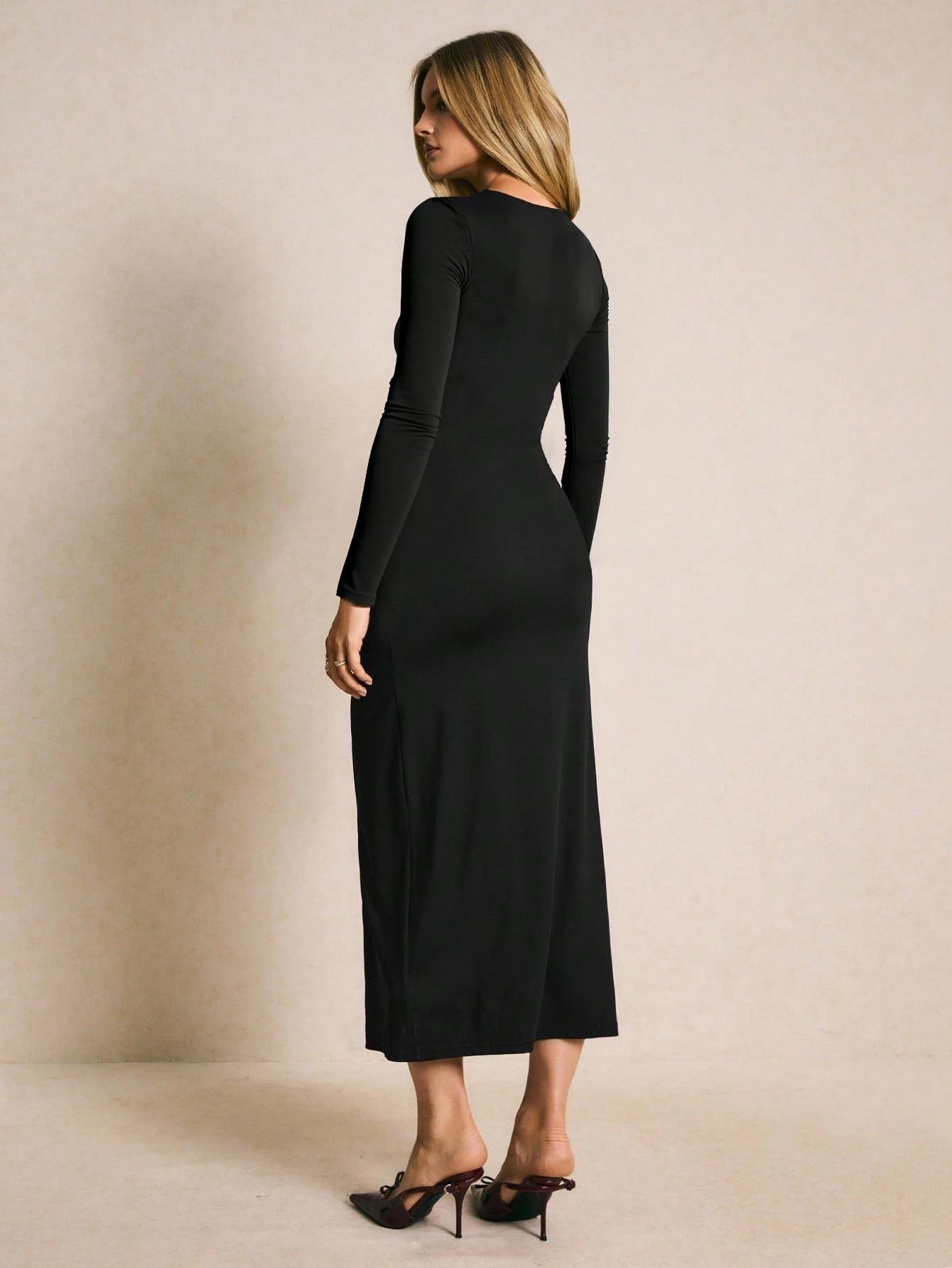 • Women's Elegant Black Bodycon Long Sleeve Maxi Dress With Gold Metal Buckle Sexy Side Slit Slimming Party Evening Dress