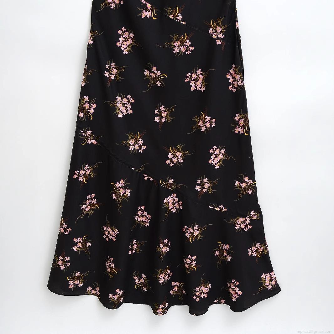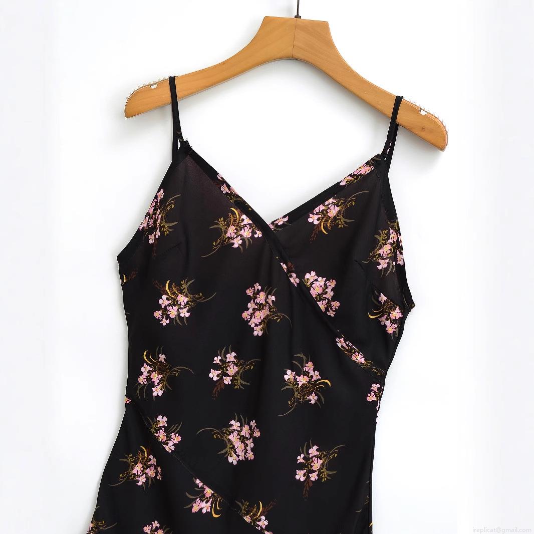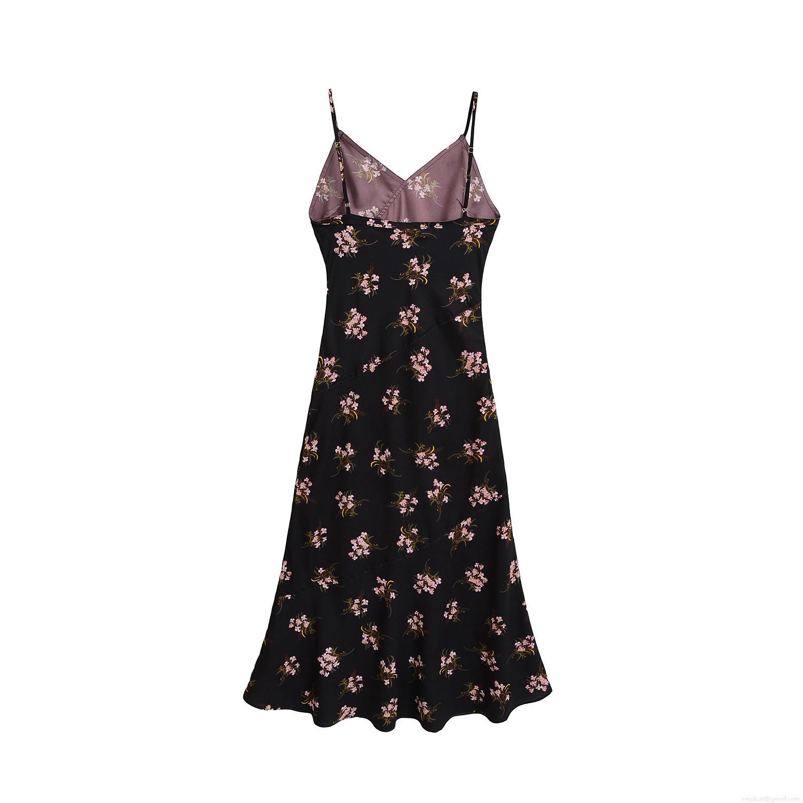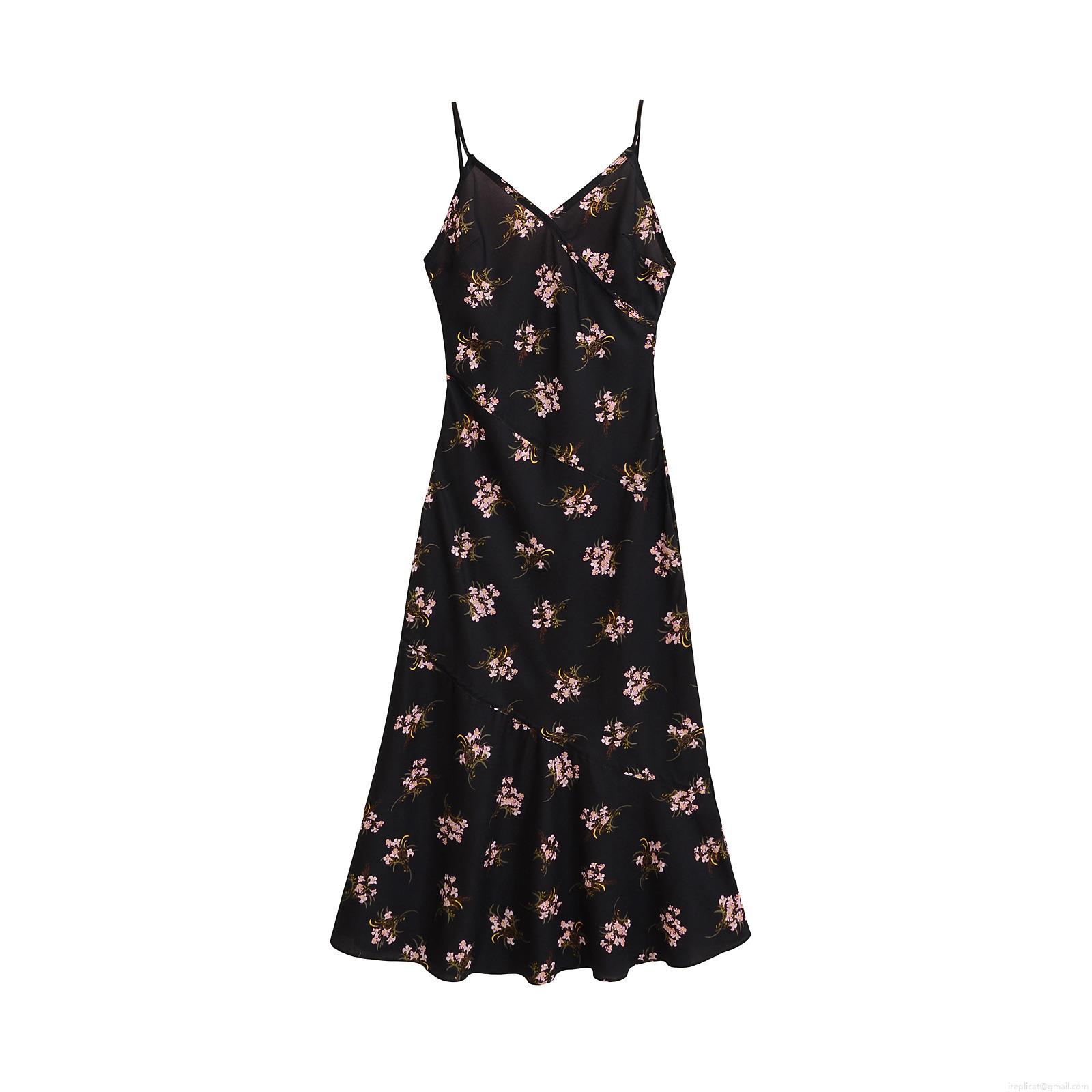 • Women's Elegant Black Floral Print V-Neck Midi Dress Sexy Adjustable Spaghetti Strap Satin Cami Dress French Style A-Line Party Sundress