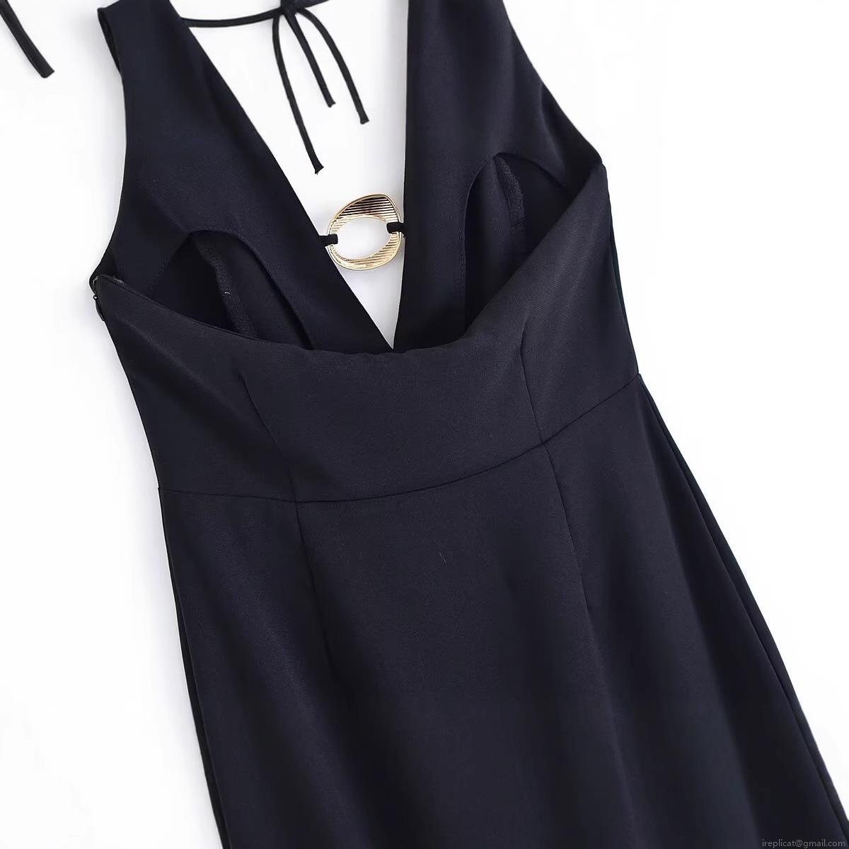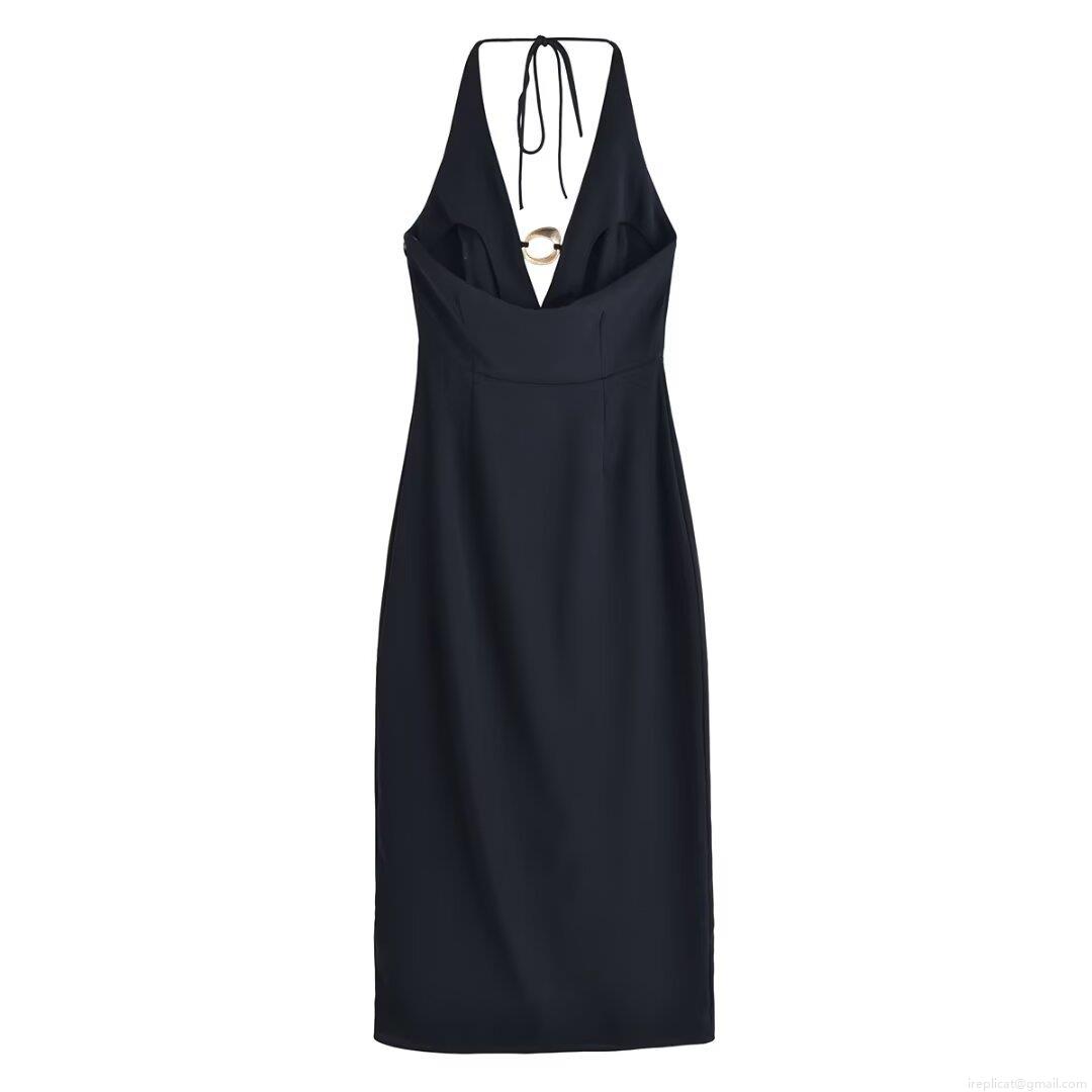 • Women's Elegant Black Halter Neck Midi Dress With Gold Metal Ring Detail Deep V Neck High Slit Sleeveless Backless Bodycon Evening Party Cocktail Dress