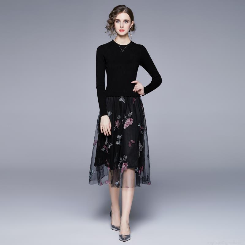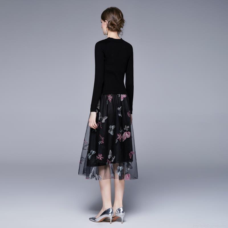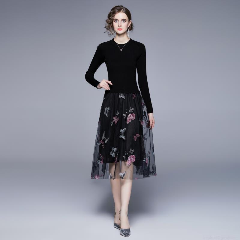 • Women's Elegant Black Knit Dress With Butterfly Embroidery Mesh Patchwork High Waist Long Sleeve Midi Party Dress For Women Casual Chic Fashion