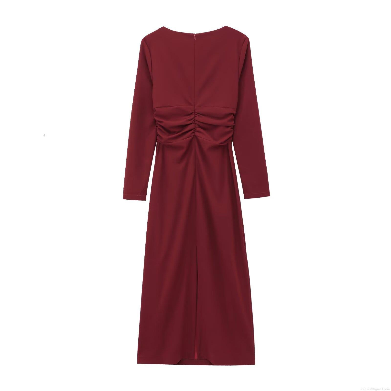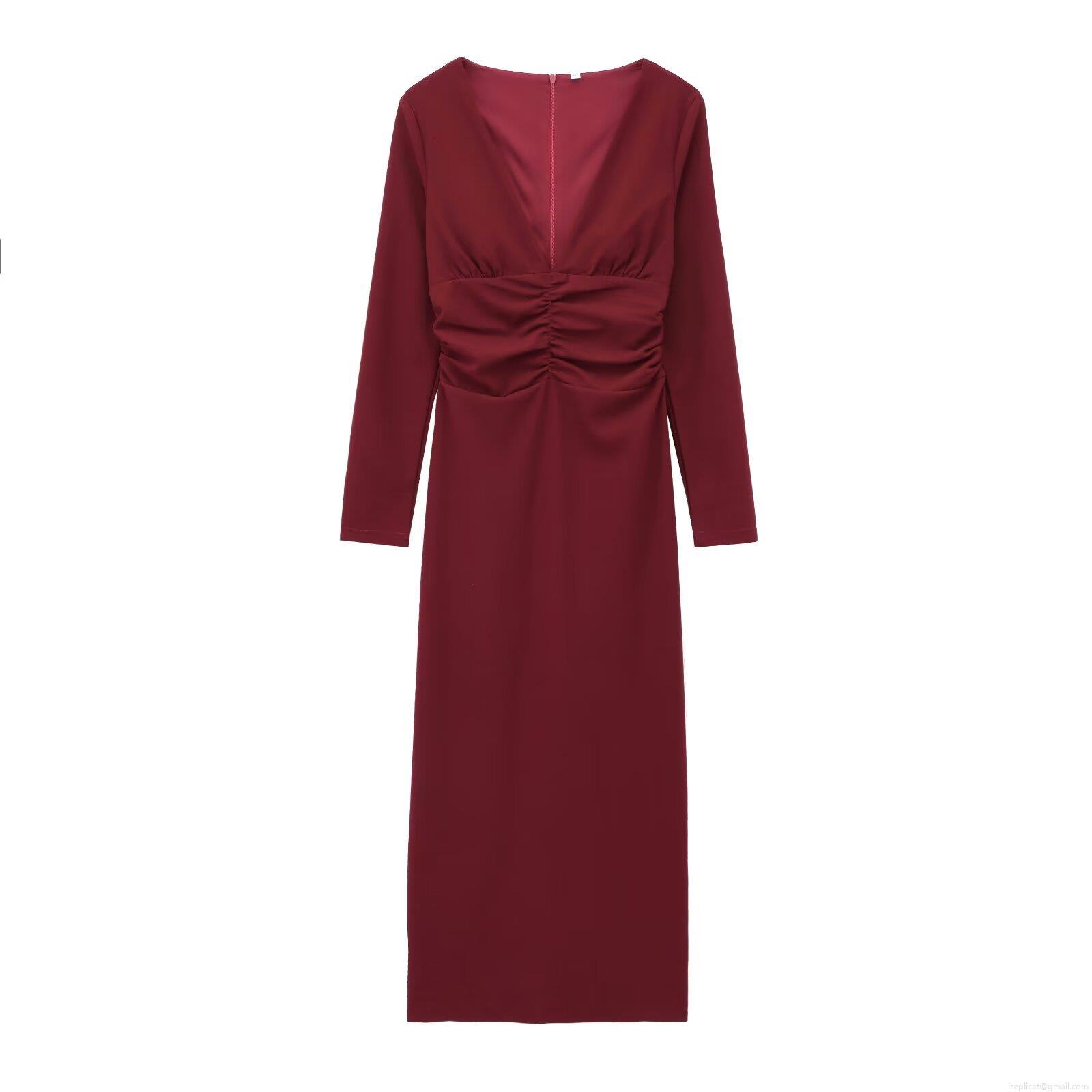 Women's Elegant Burgundy V-Neck Ruched Long Sleeve Midi Dress Slim Fit Back Slit Polyester Party Evening Bodycon Dress