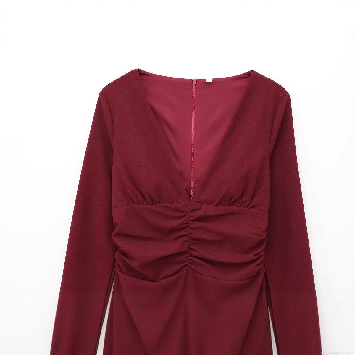 • Women's Elegant Burgundy V-Neck Ruched Long Sleeve Midi Dress Slim Fit Back Slit Polyester Party Evening Bodycon Dress