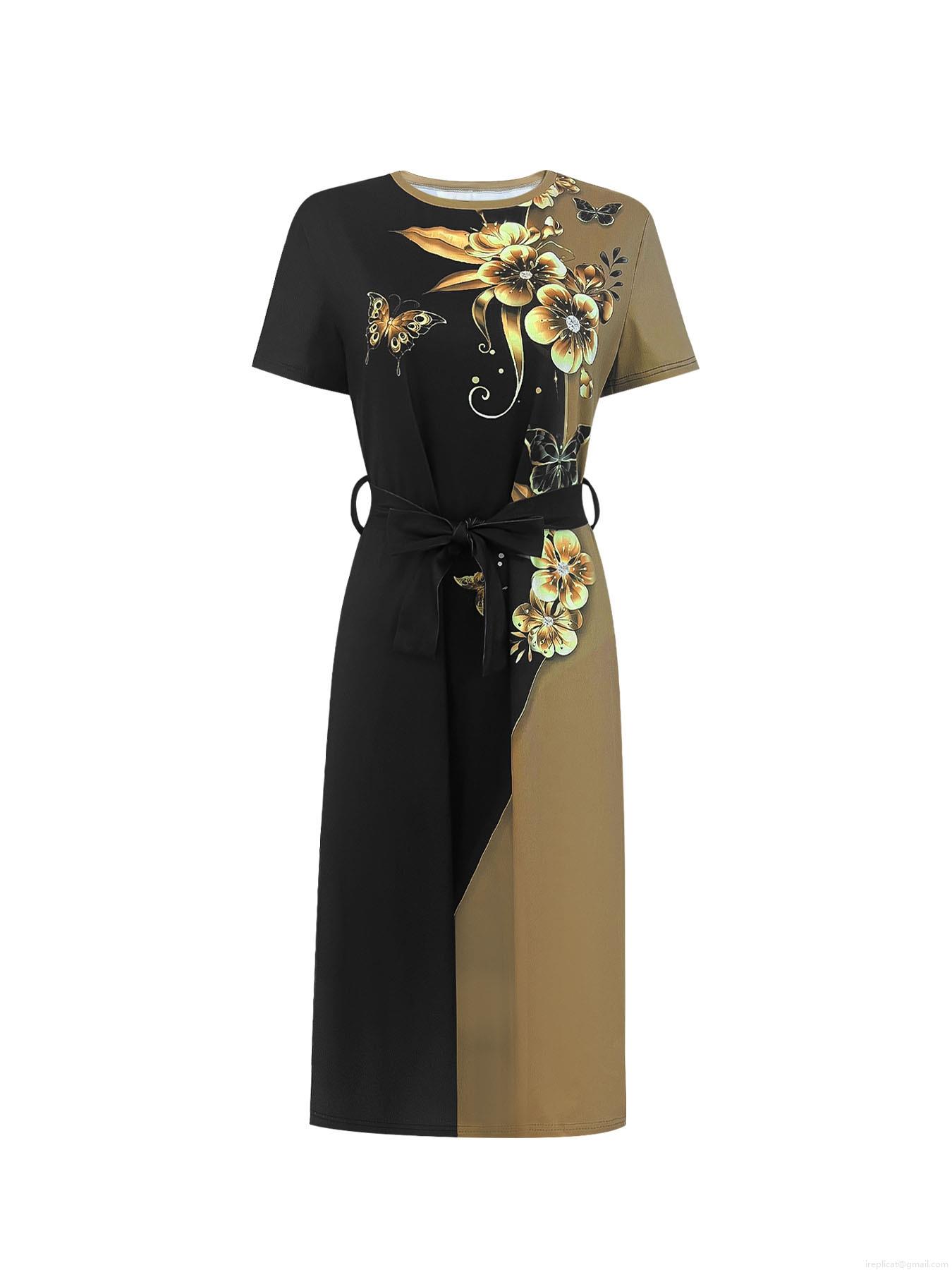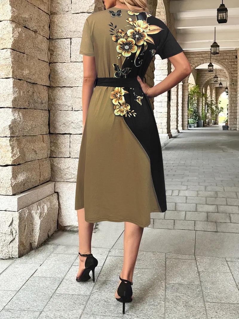 • Women's Elegant Color Block Midi Dress Short Sleeve Round Neck Gold Floral Butterfly Print A-Line Splicing Dress With Waist Belt For Office Commute Casual Summer Party Ladies Clothing