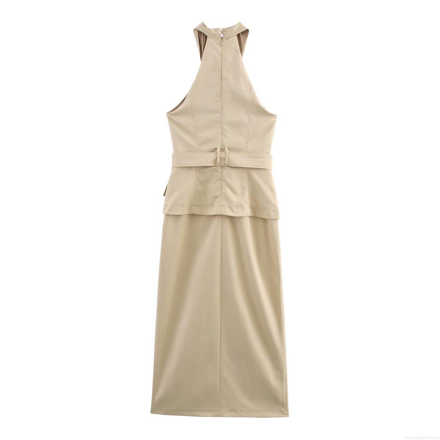 • Women's Elegant Cross Halter Midi Dress with Belt Solid Color Sleeveless Polyester Midi Dress for Commuting Office Party Lady Clothing