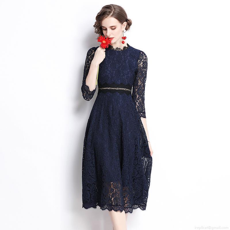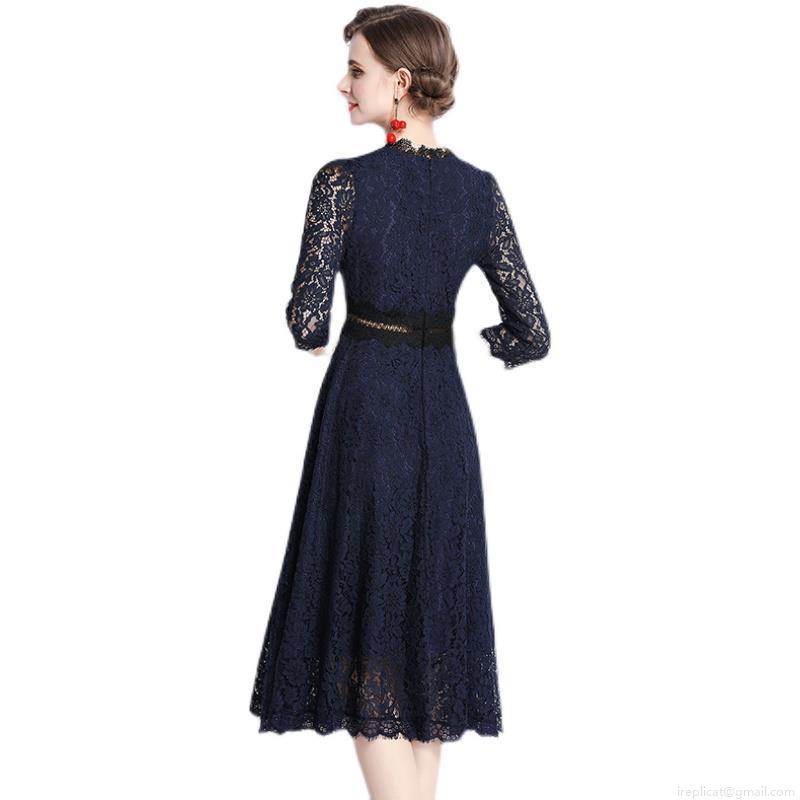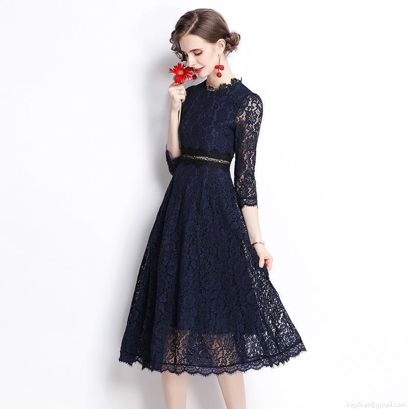 • Women's Elegant Dark Blue Lace Embroidery Midi Dress Round Neck A-Line Hollow Out 3/4 Sleeve Slim Fit Party Evening Dresses For Women
