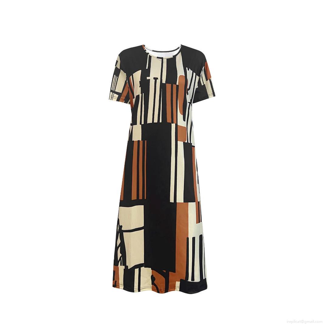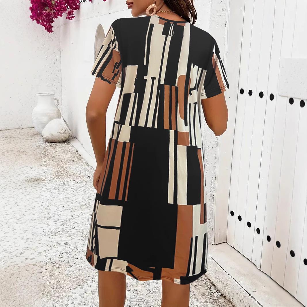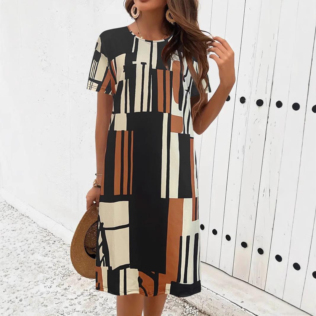 • Women's Elegant Floral Geometric Printed Dress Round Neck Short Sleeve Loose Midi Dress Summer Casual Plus Size Fashion Polyester Spandex Dress For Women