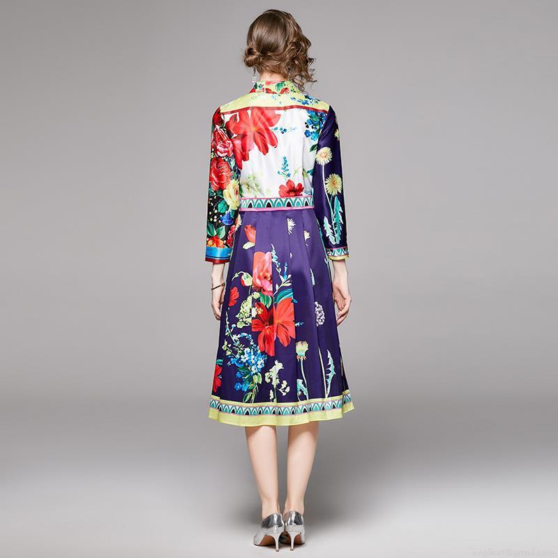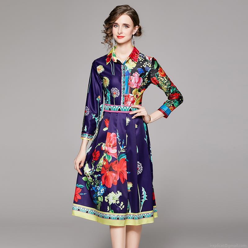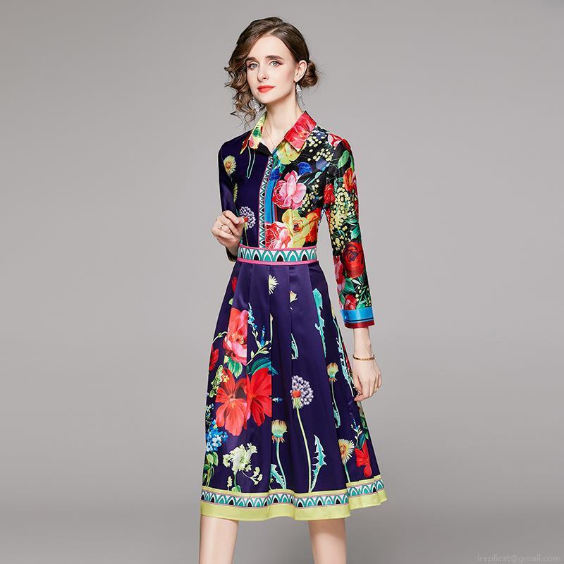 Floral, Retro Prints, Lapel, Slimming And Waist-cinching, A-line Skirt, Positioning Printing