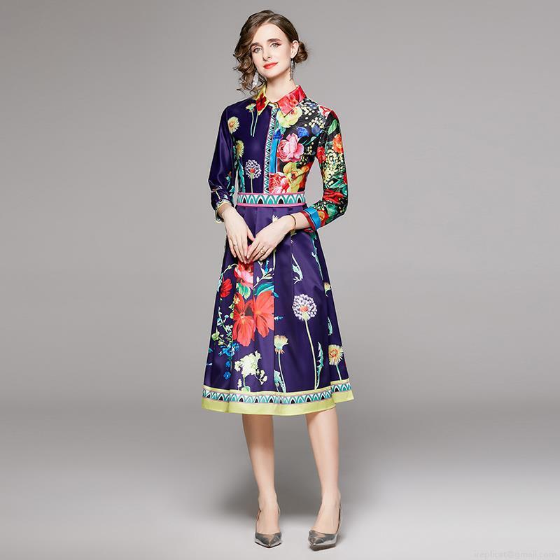 Women's Elegant Floral Print Long Sleeve Midi Dress Satin Texture Waist Slimming Shirt Collar A-Line Retro Purple Flower Party Gown