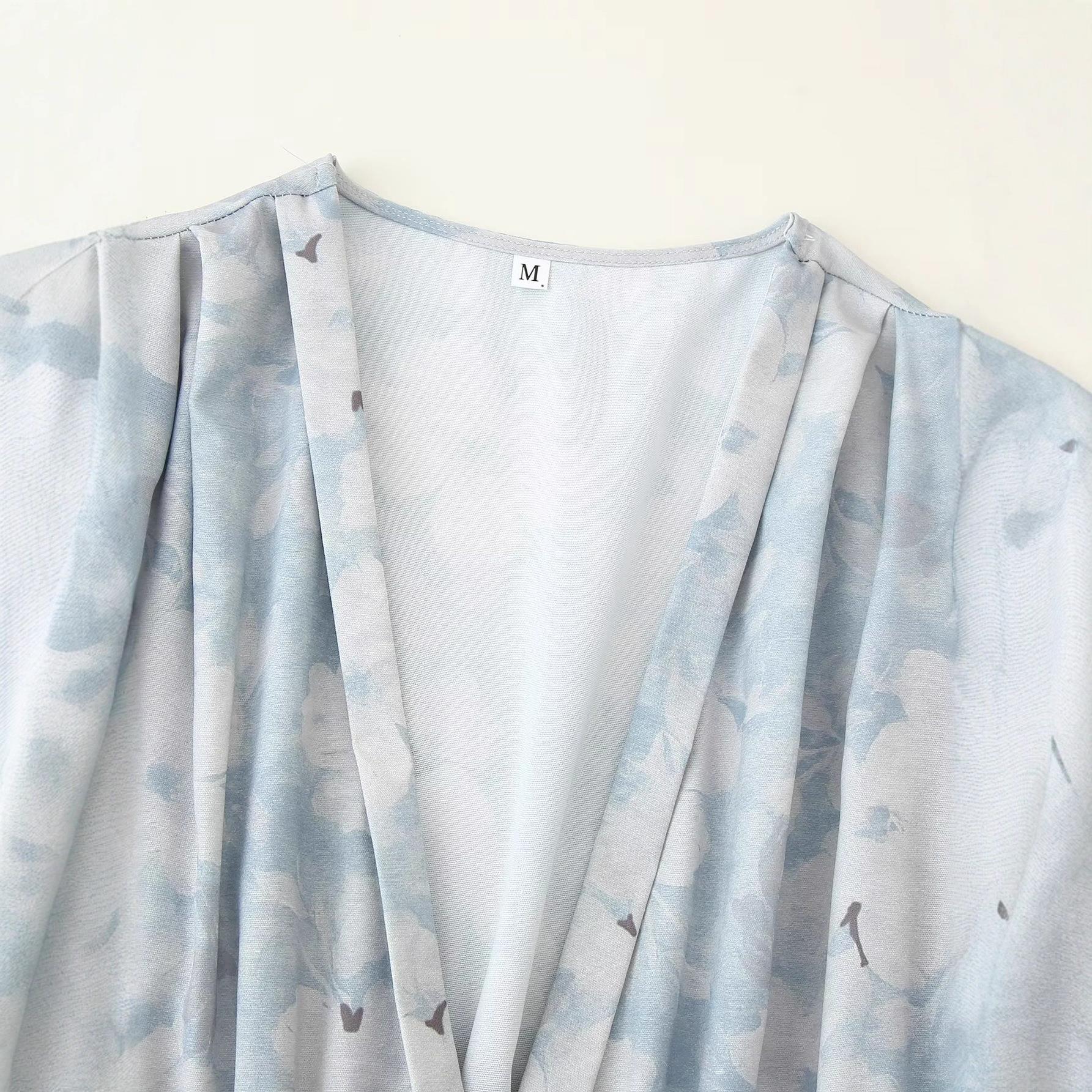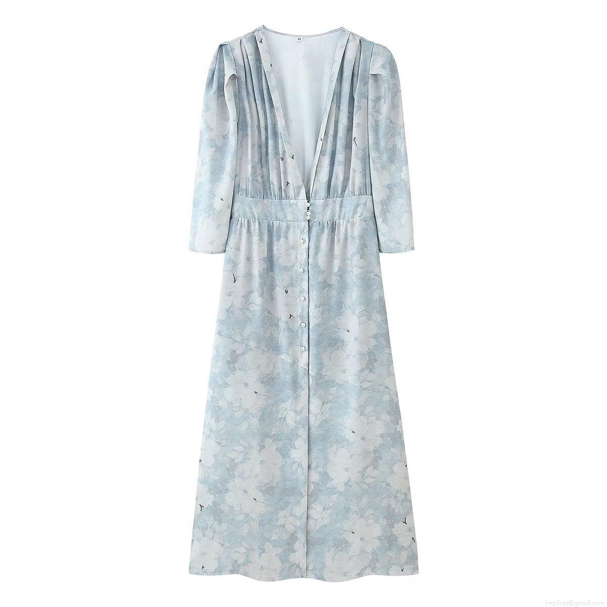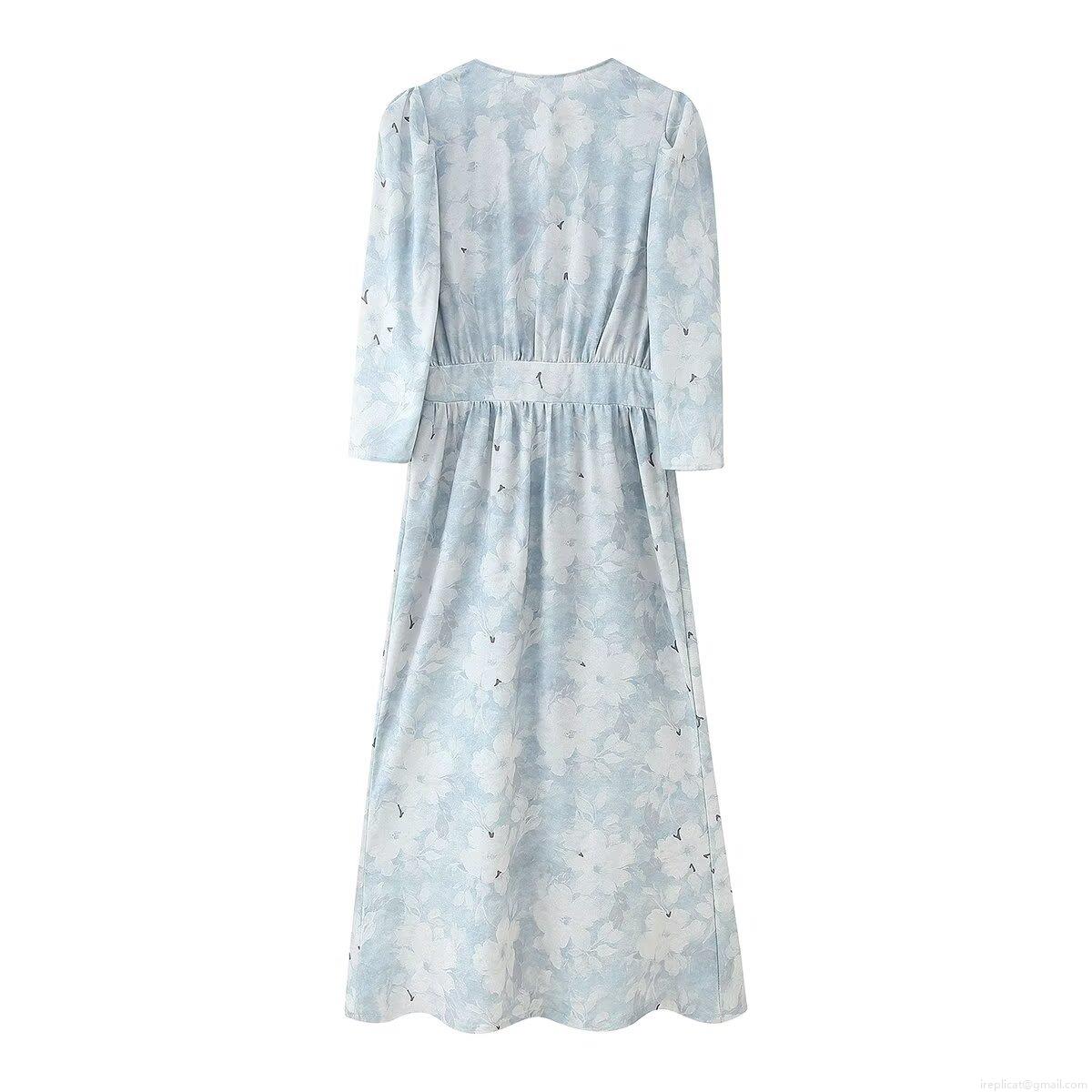 • Women's Elegant Floral Print V-Neck Long Sleeve Dress Light Blue Polyester Midi Dress With Pearl Buttons Waist Ruffle Trim For Spring Summer Vacation Party Ladies Clothing