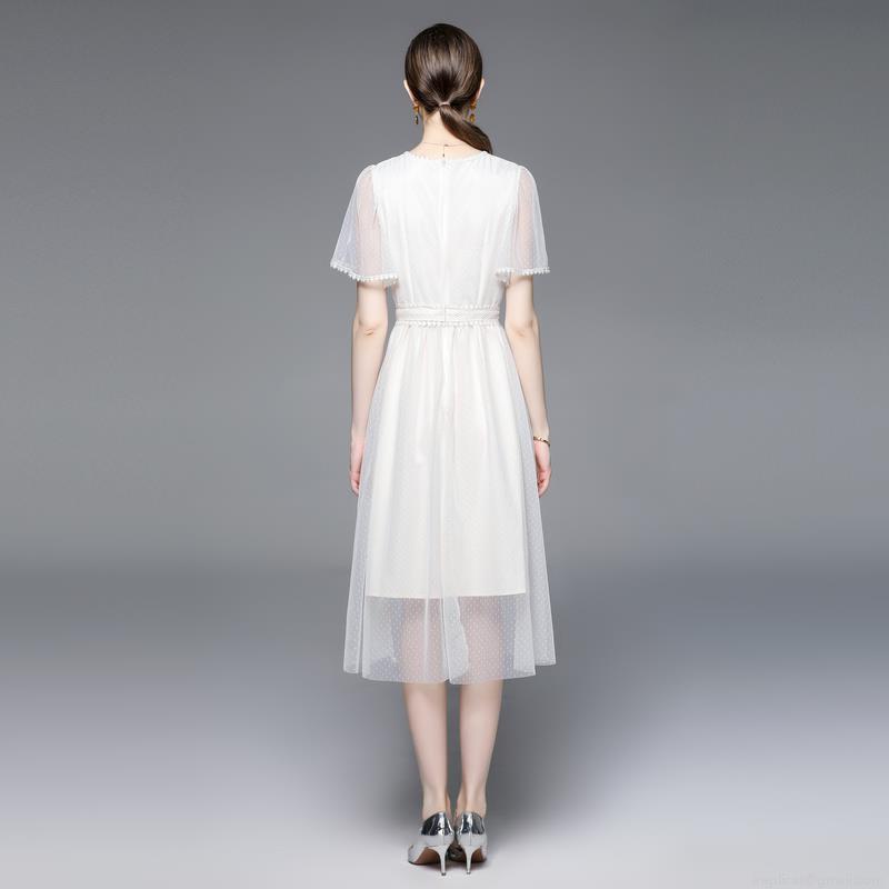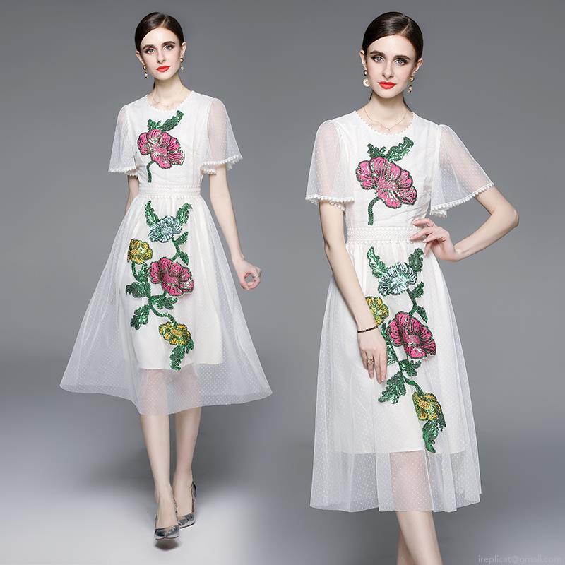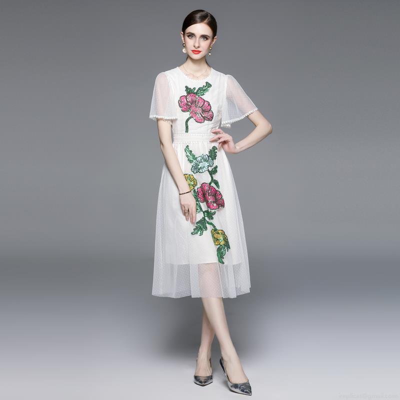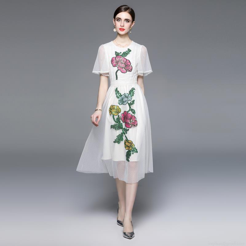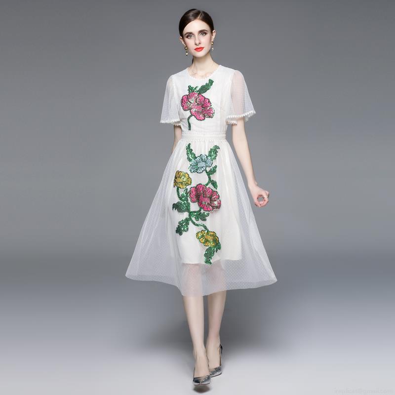 • Women's Elegant Heavy Embroidery Mesh Midi Dress With Floral Sequins Short Sleeve High Waist A-Line Spliced Dress For Party Wedding Cocktail Event