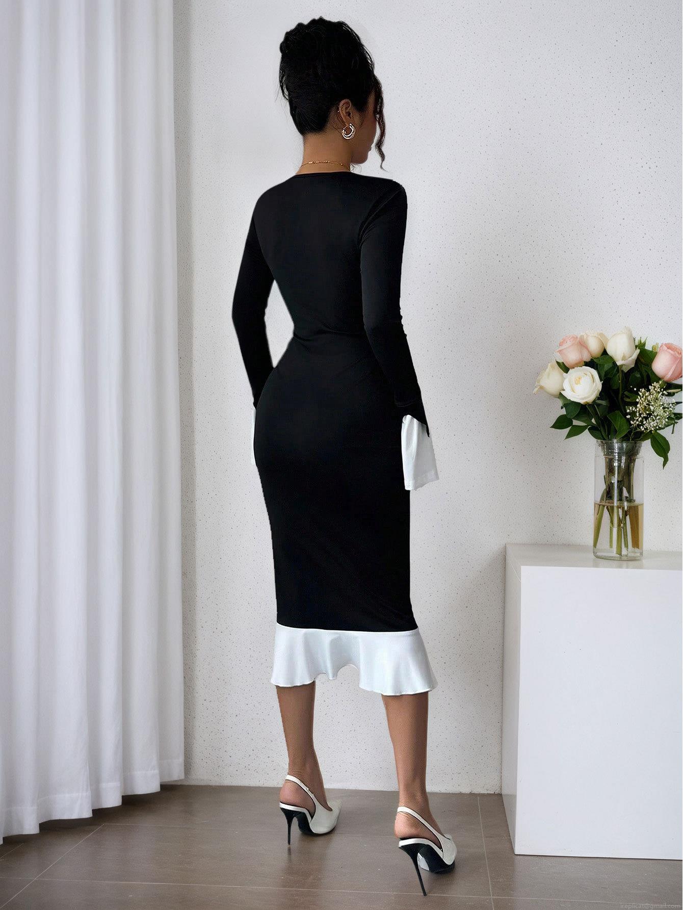 Color Blocking, Black And White Color Blocking, Ruffles, Square Collar, Fishtail