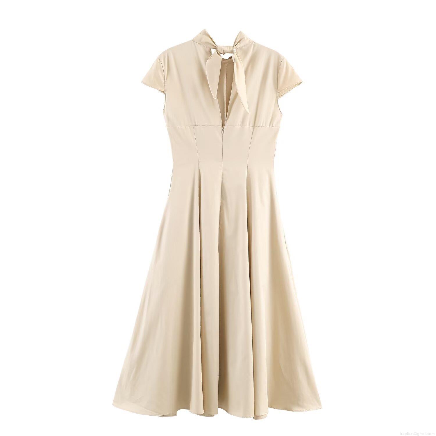 • Women's Elegant High Neck Midi Dress With Back Bow Tie Short Sleeve Slim Fit Polyester Straight Dress Streetwear Summer Beige Dress For Women