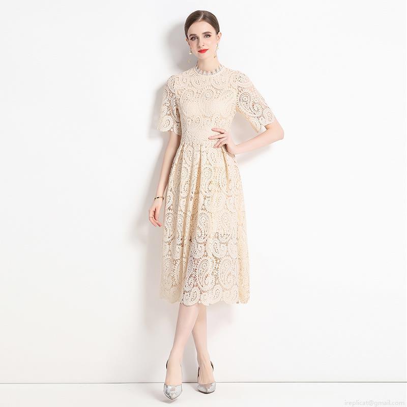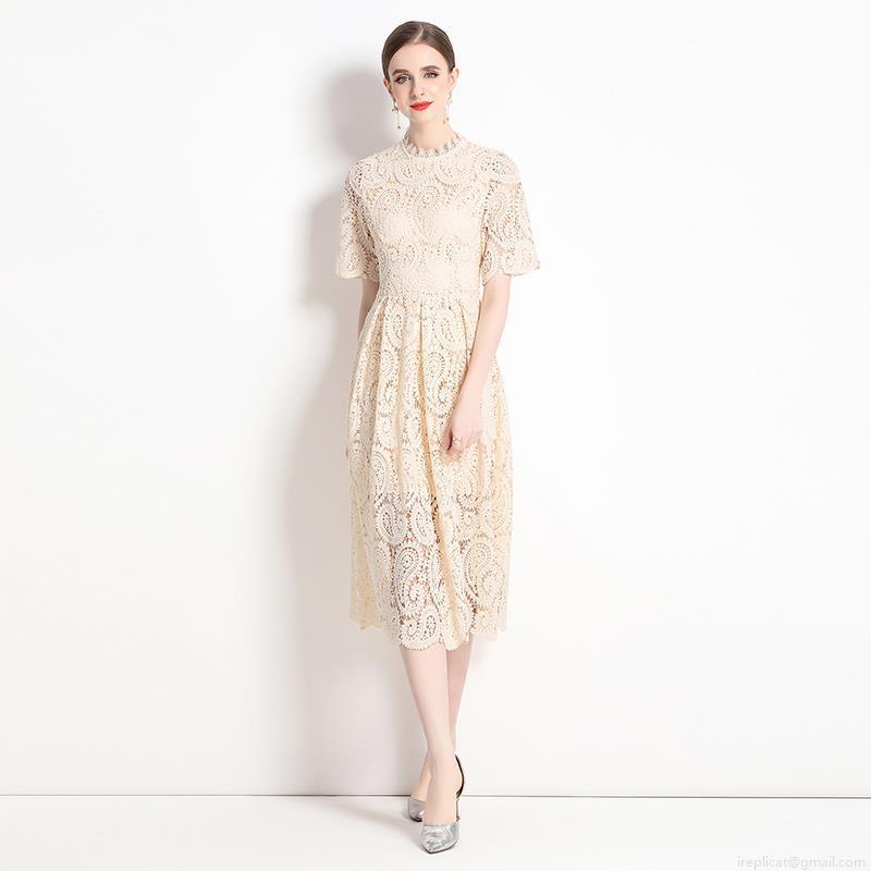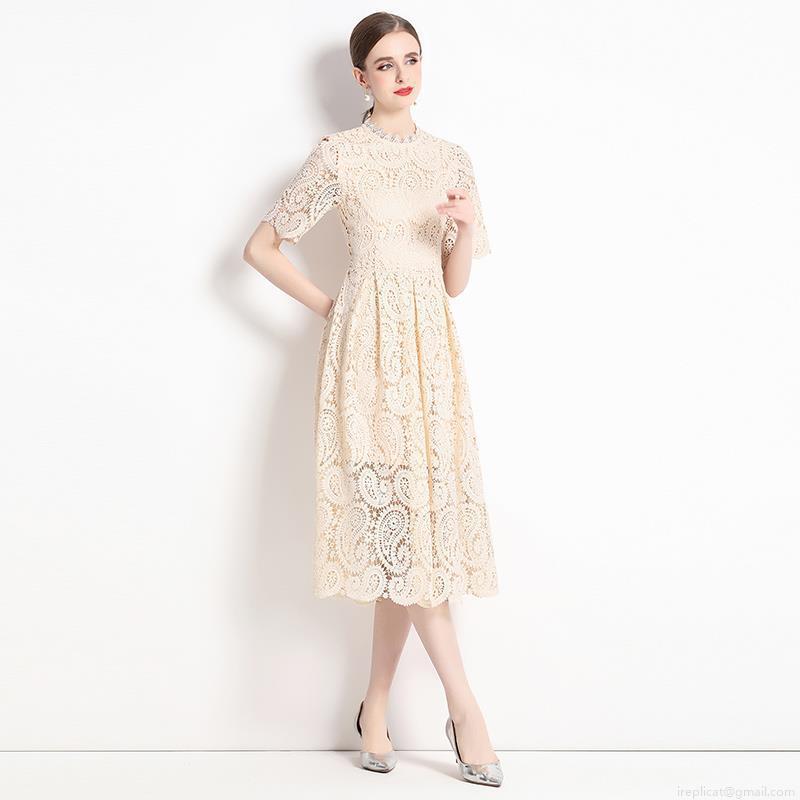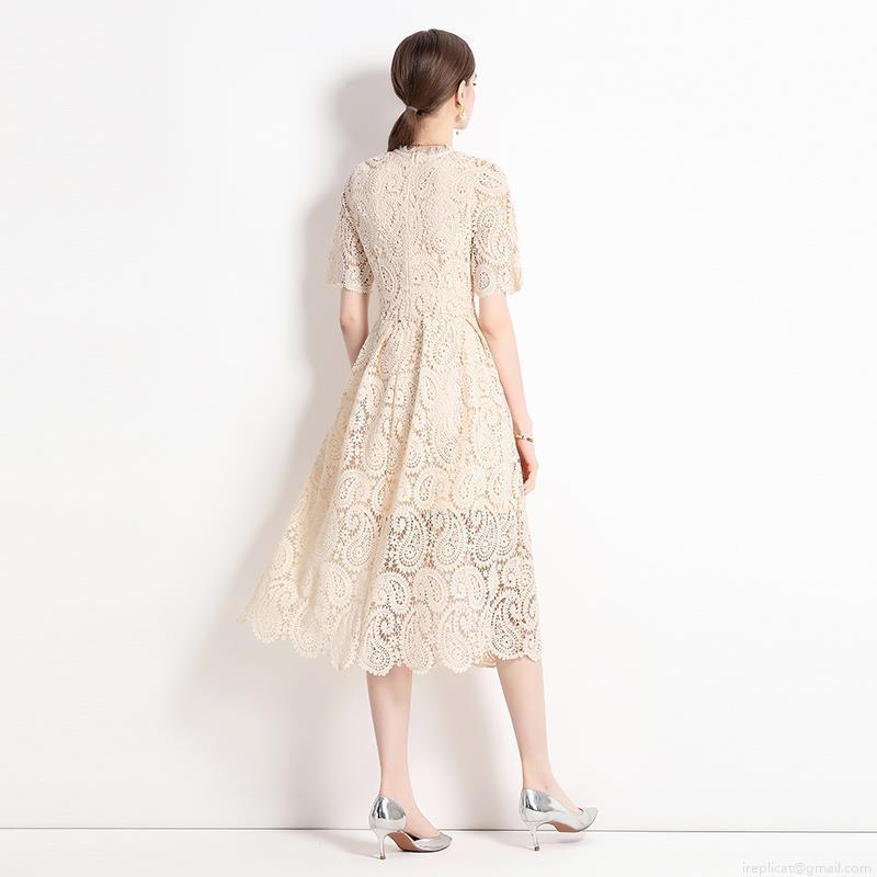 • Women's Elegant Hollow Out Lace Midi Dress Short Sleeve Stand Collar Embroidered A-Line Swing Party Dress Apricot Beige Vintage Commute Lady Summer Gown